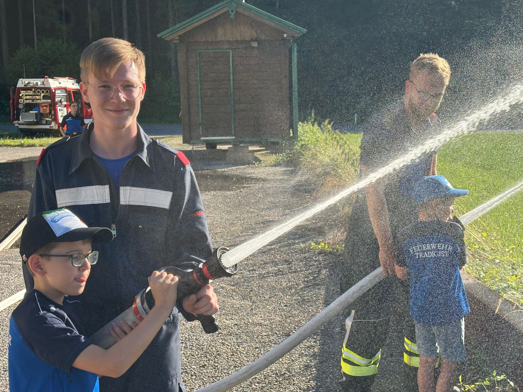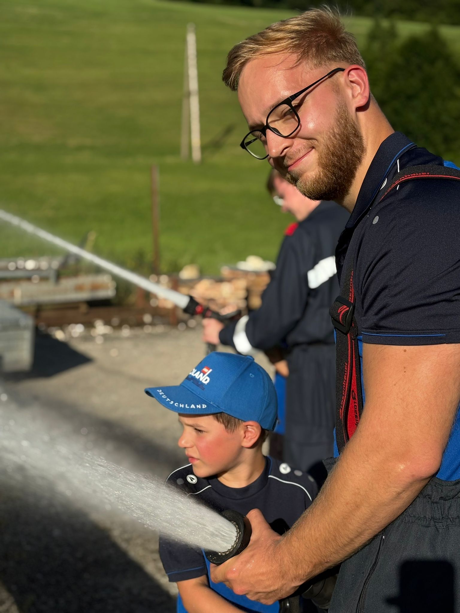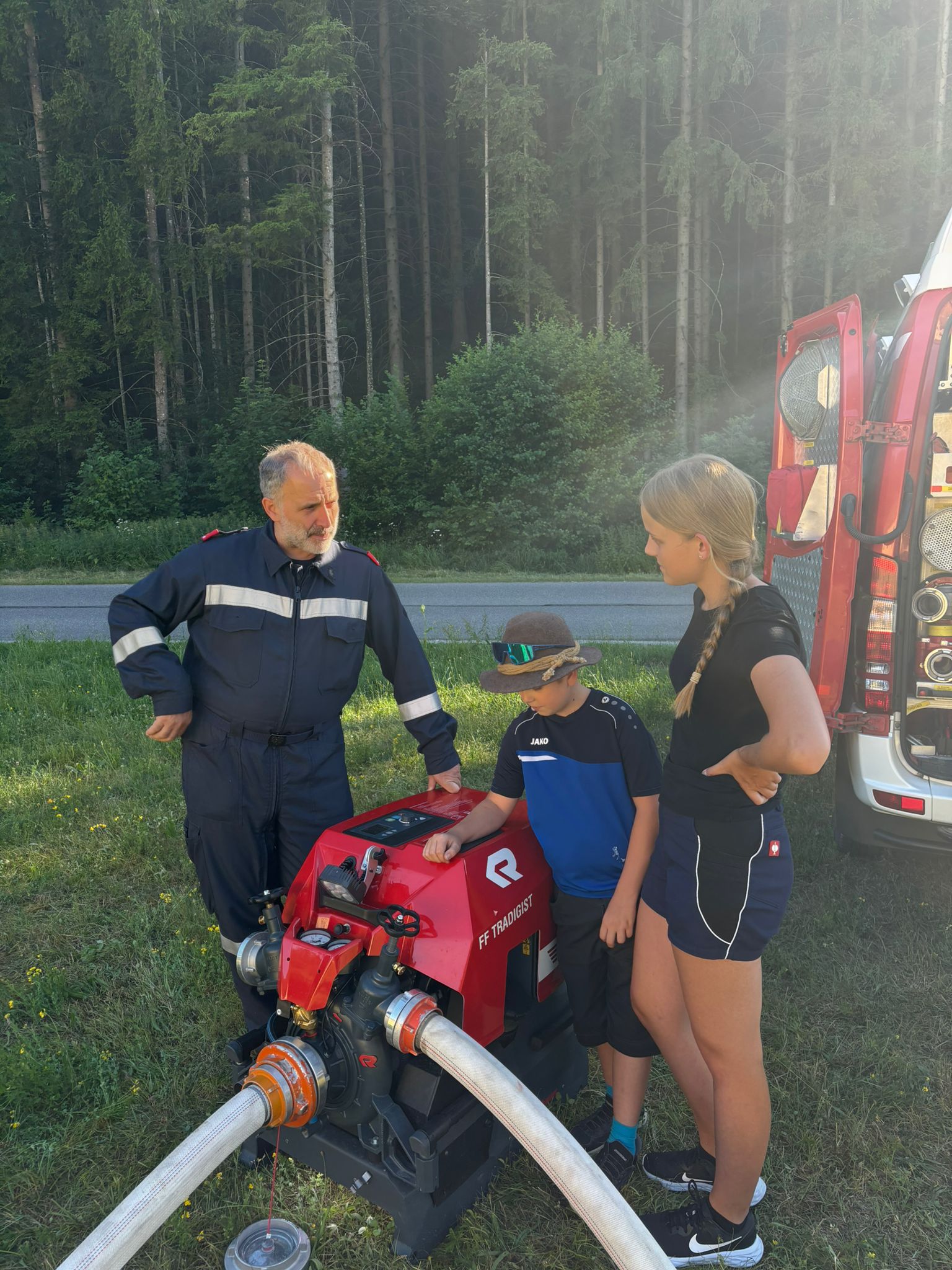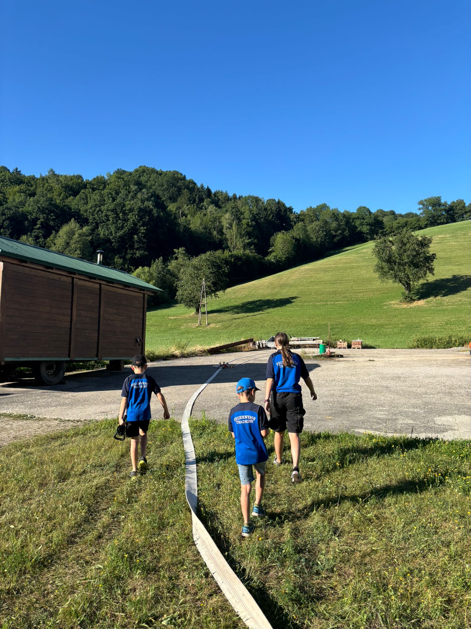Zum Abschluss versammelten wir uns im Feuerwehrhaus. Dort stellten wir das Hydroschild auf, welches für große Begeisterung sorgte – die Kinder konnten sich damit ordentlich abkühlen und hatten sichtlich Spaß dabei.