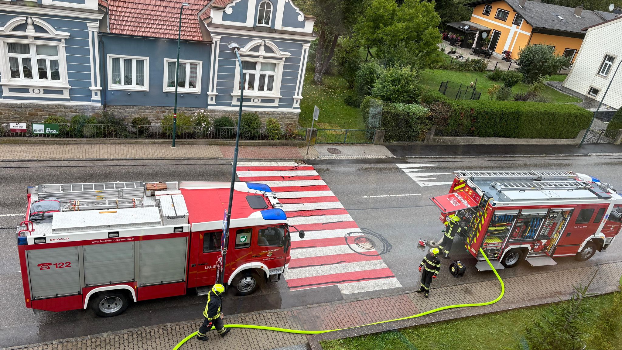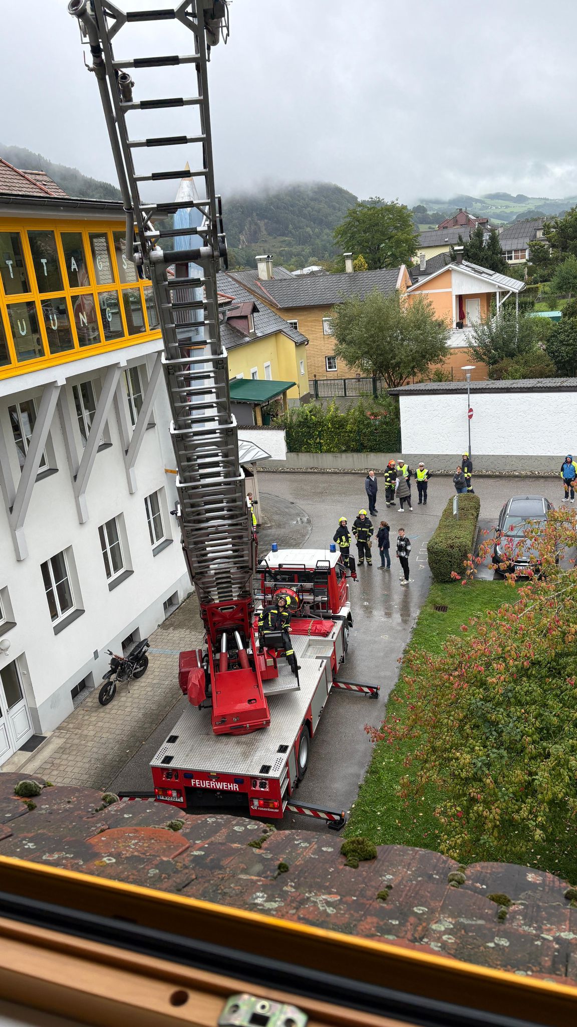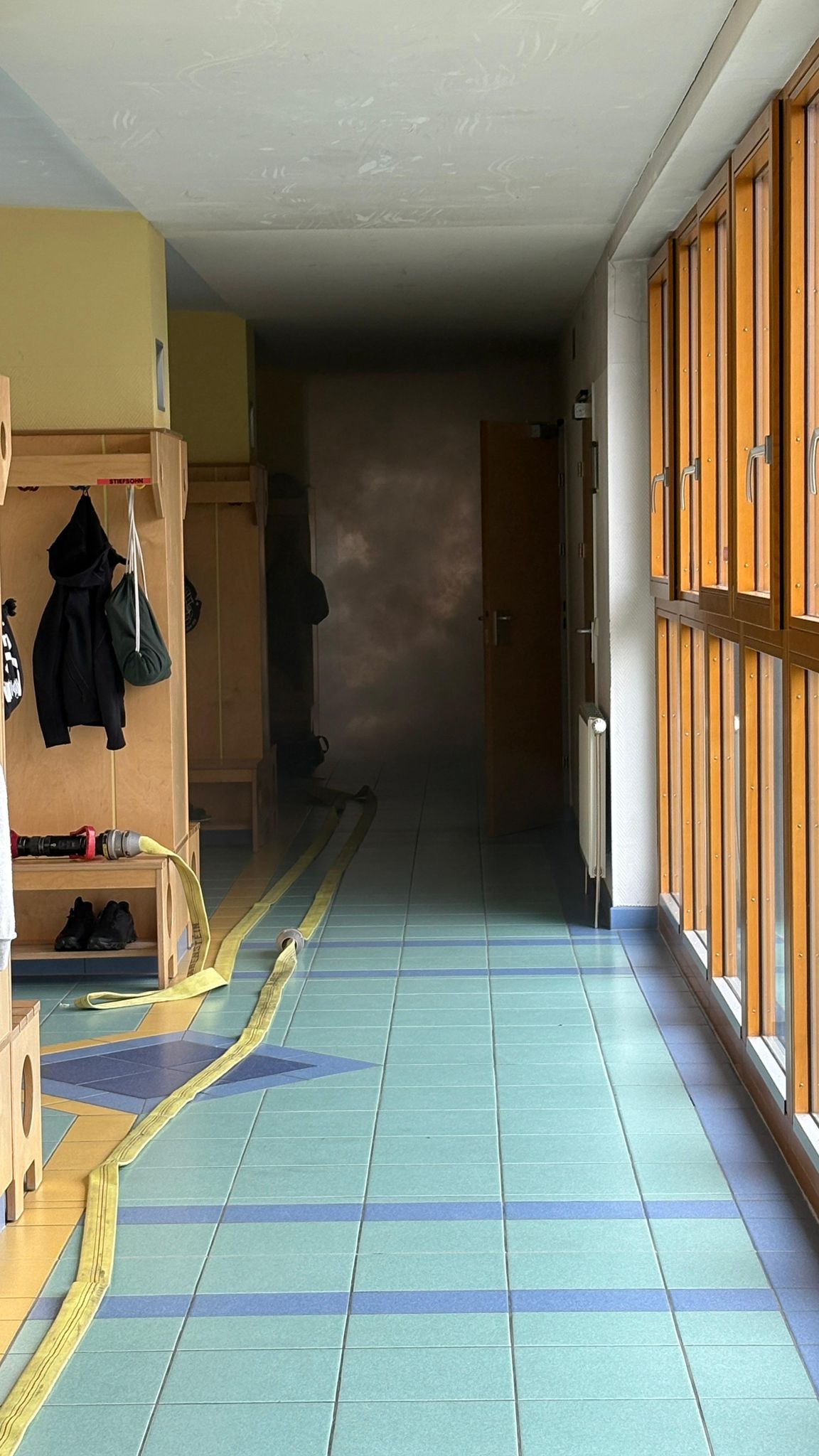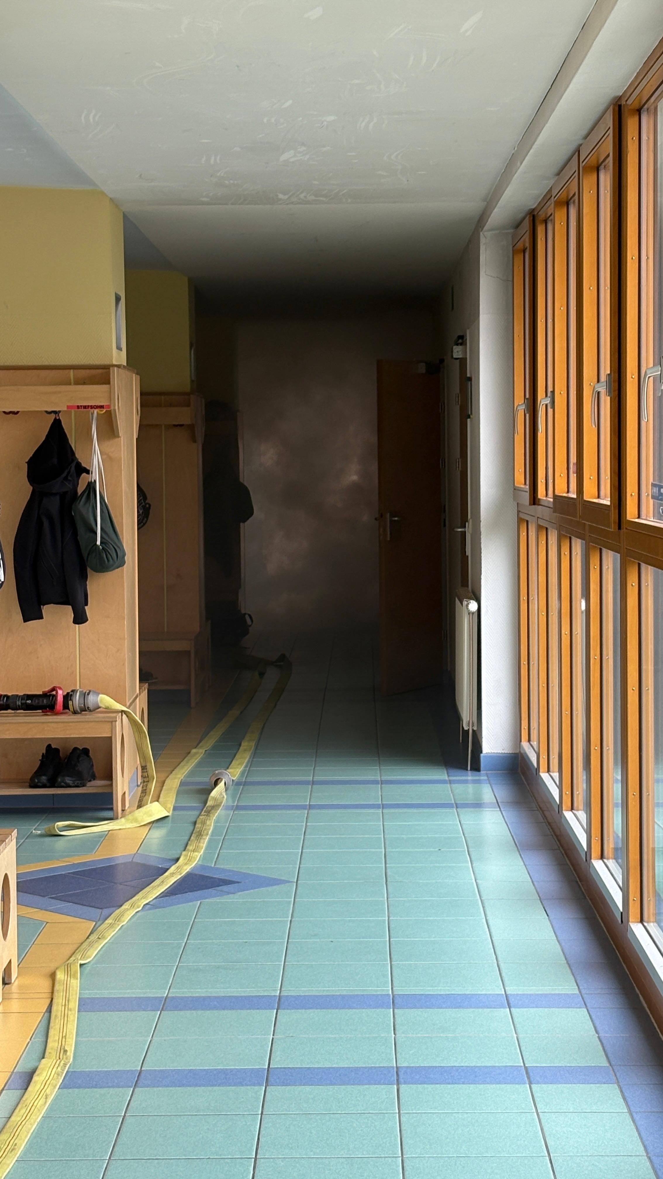 Parallel dazu wurde von unserem Tankwagen die Löschleitung zum Verteiler gelegt, um die C-Leitung, die der Atemschutztrupp ins Gebäude mitnahm, rasch mit Wasser zu versorgen. Zusätzlich wurden Druckbelüfter in Stellung gebracht, um den Rauch aus den betroffenen Bereichen zu entfernen.