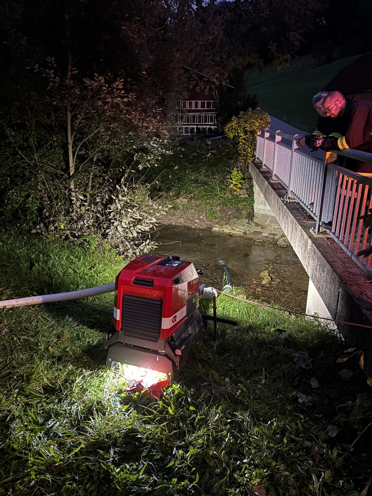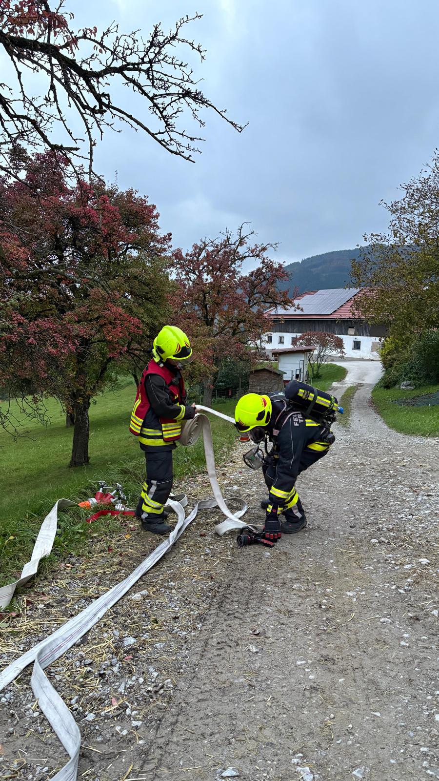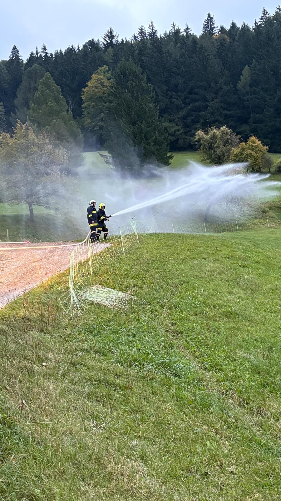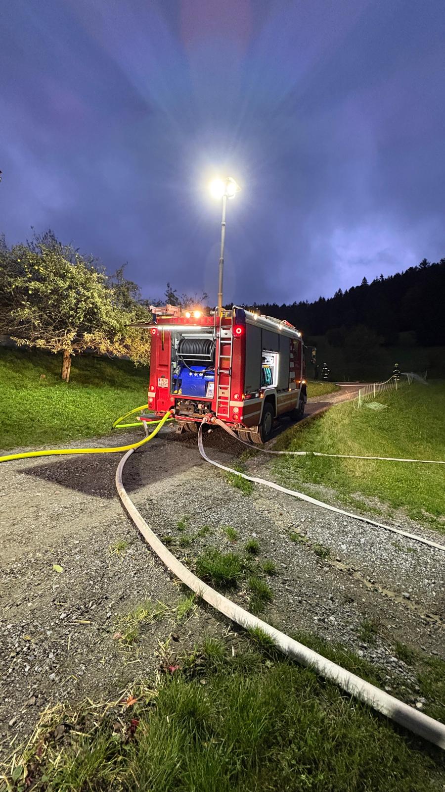 Ein besonderes Augenmerk lag auf der Sicherstellung der Löschwasserversorgung. Aufgrund der großen Entfernung zur nächstgelegenen Wasserentnahmestelle musste eine Relaisleitung aufgebaut werden. Diese bestand aus 5 Pumpen und insgesamt 56 B-Schläuchen, was einer Gesamtlänge von 1.120 Metern entsprach. Dabei waren rund 170 Höhenmeter zu überwinden – eine erhebliche Herausforderung, die von den eingesetzten Kräften erfolgreich gemeistert wurde.