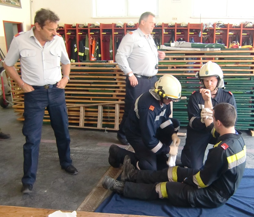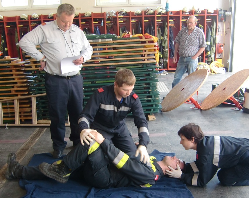 Äußerst wichtig im Feuerwehrwesen ist das umfassende Wissen über Erste Hilfe Maßnahmen und so stellt deren praktische Durchführung einen Teil der Prüfung dar. Hier geht es z.B. um Helmabnahme, Rettung aus einem Fahrzeug bei Gefahr im Verzug, Kontrolle der Lebensfunktionen, Schockbekämpfung, Blutstillung, stabile Seitenlage, u.v.m.