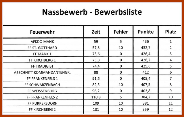 Im Zuge ihres Feuerwehrfestes lud die FF-Kirchberg zum Nassbewerb. Unsere Wettkampfgruppe nahm erstmalig an einem solchen Bewerb teil und erreichte den 5. Platz.
