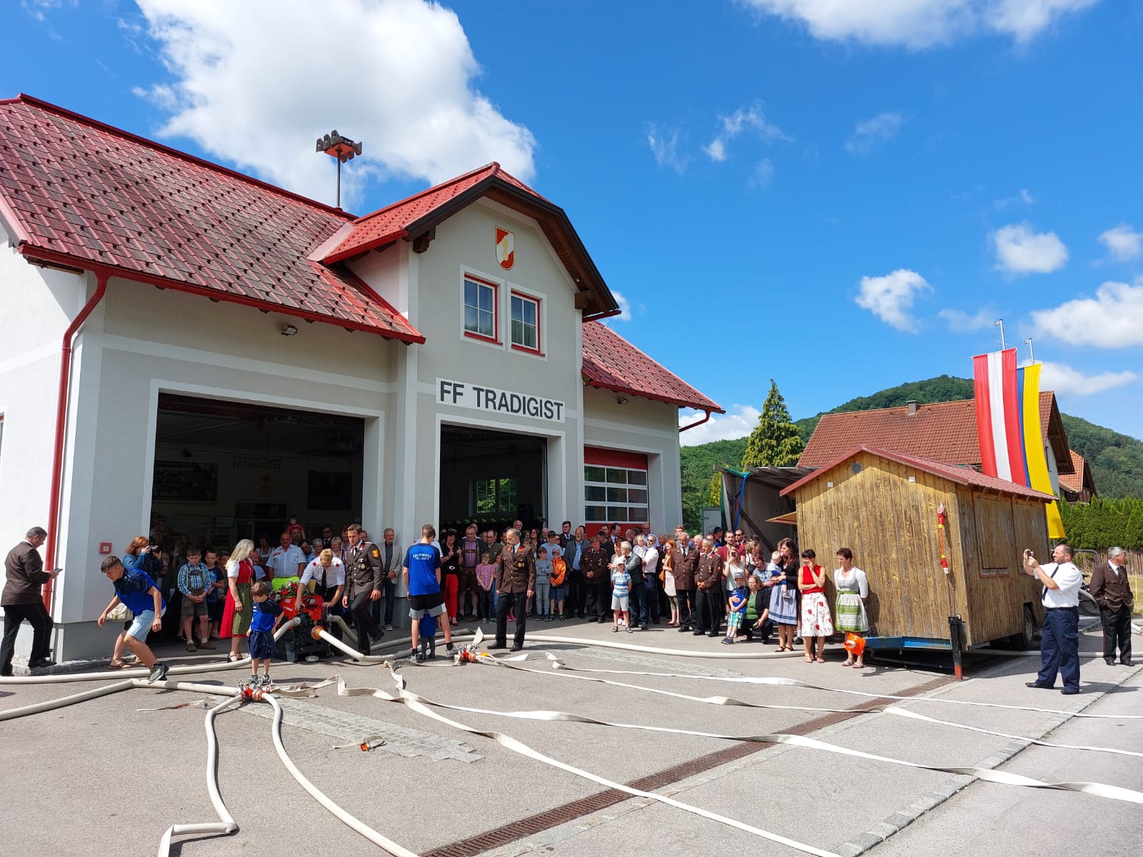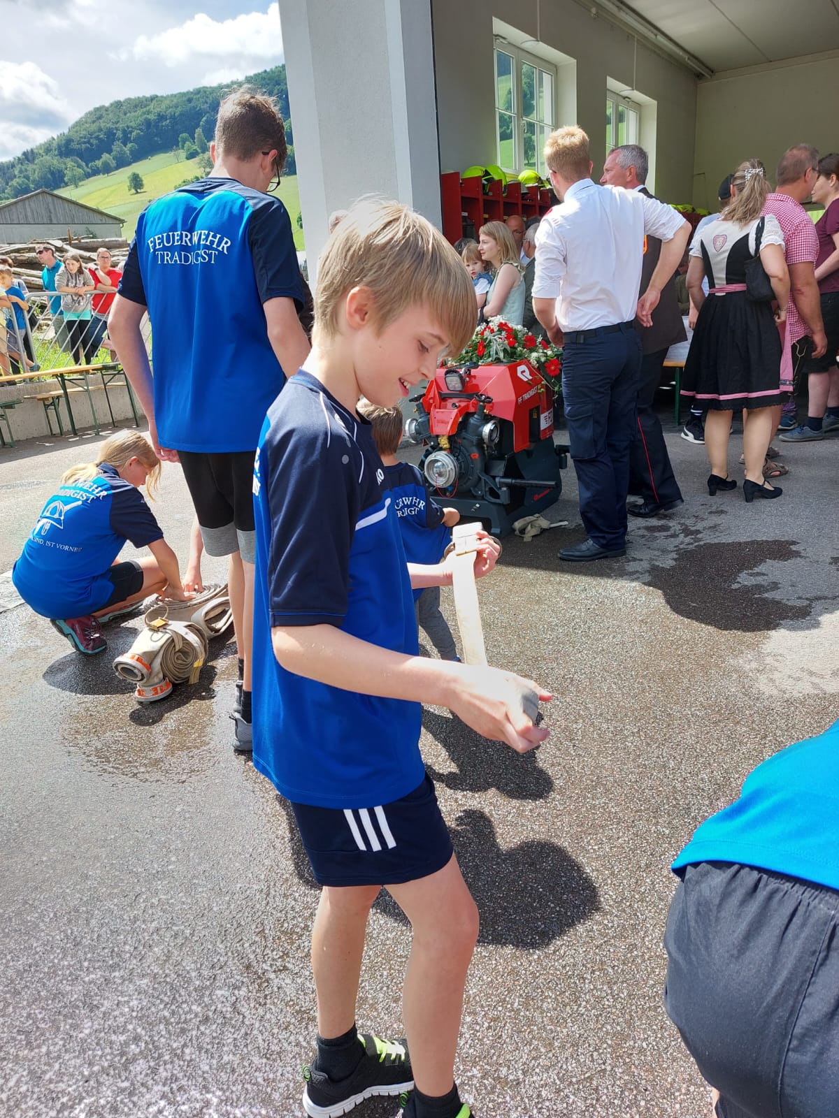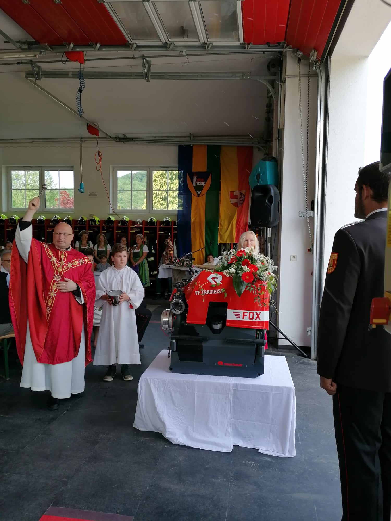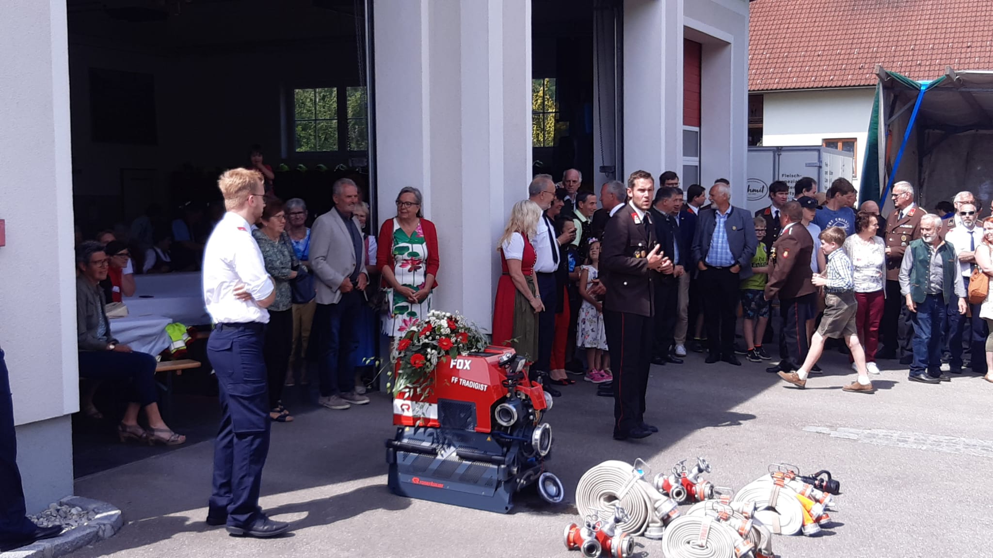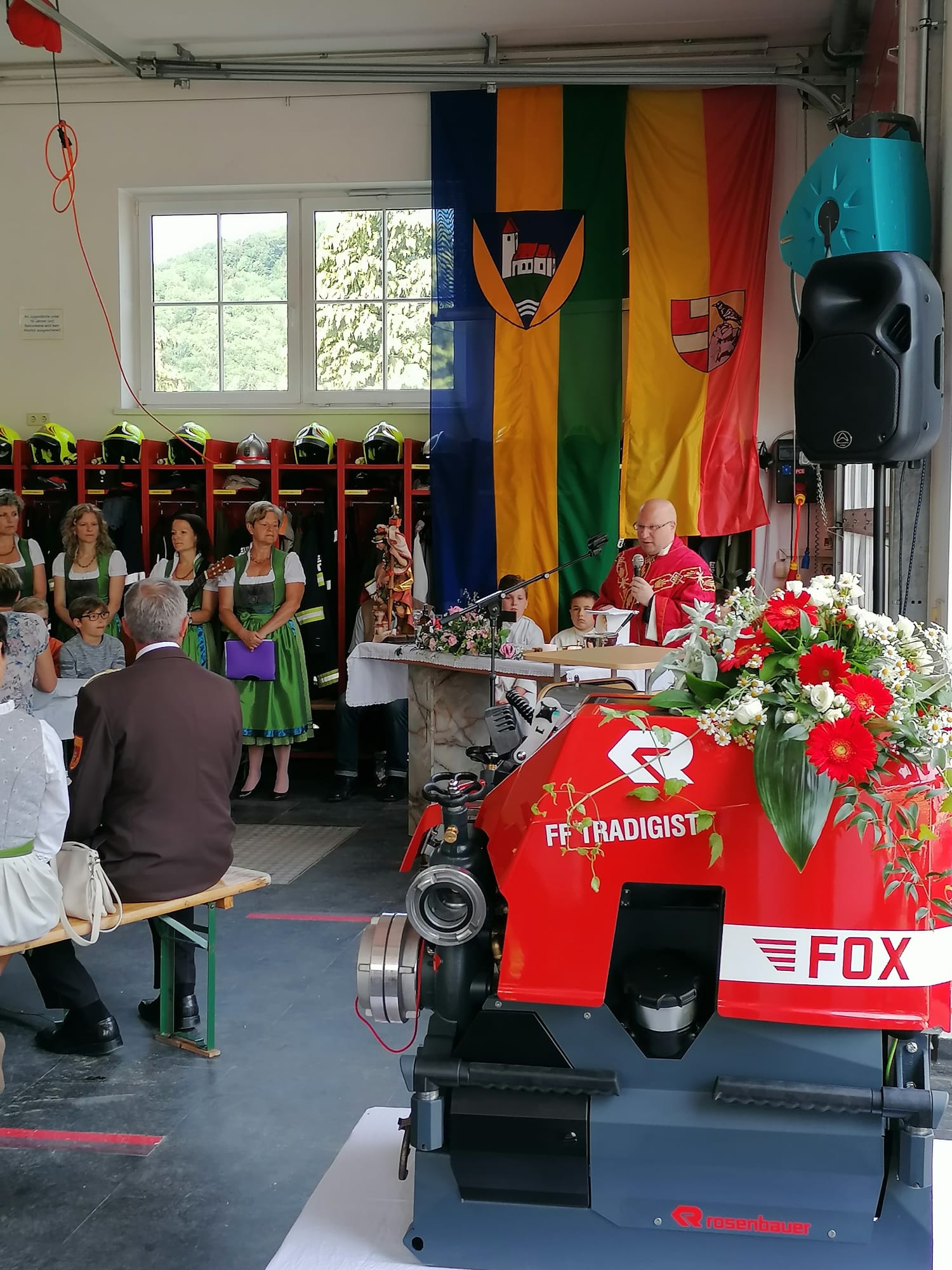 Die Heilige Messe wurde von Pater Leonhard im FF-Haus zelebriert und vom Tradigister Fünfg`sang musikalisch umrahmt. Während der Messe erfolgte die feierliche Segnung der neuen Tragkraftspritze deren Patin Brigitte Schmid ist. Nach den Ansprachen des Kommandanten und der beiden Bürgermeister wurde von den Tradigister Kindern ein bereits zuvor geübter Löschangriff mit 6 Strahlrohren und der neuen Tragkraftspritze gezeigt.