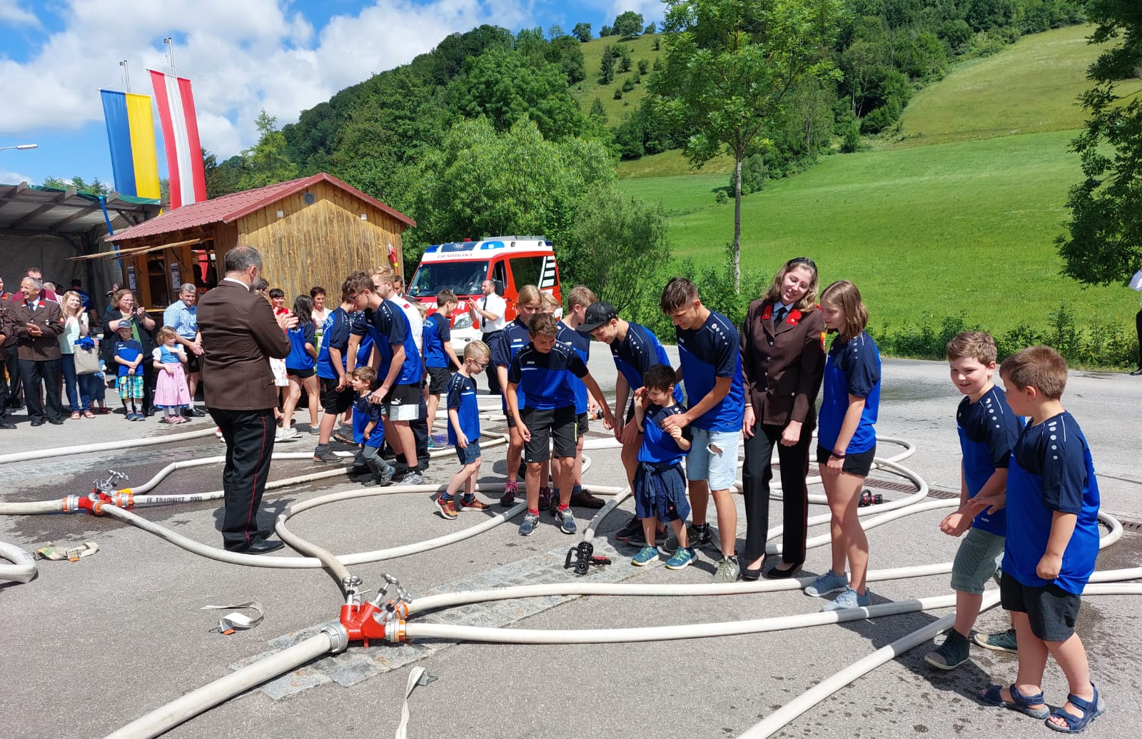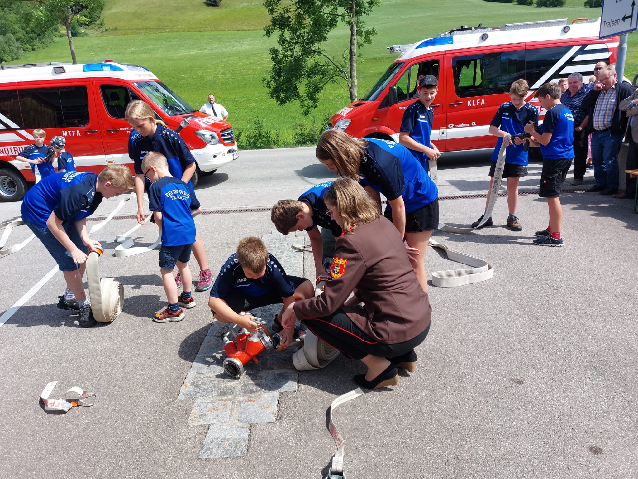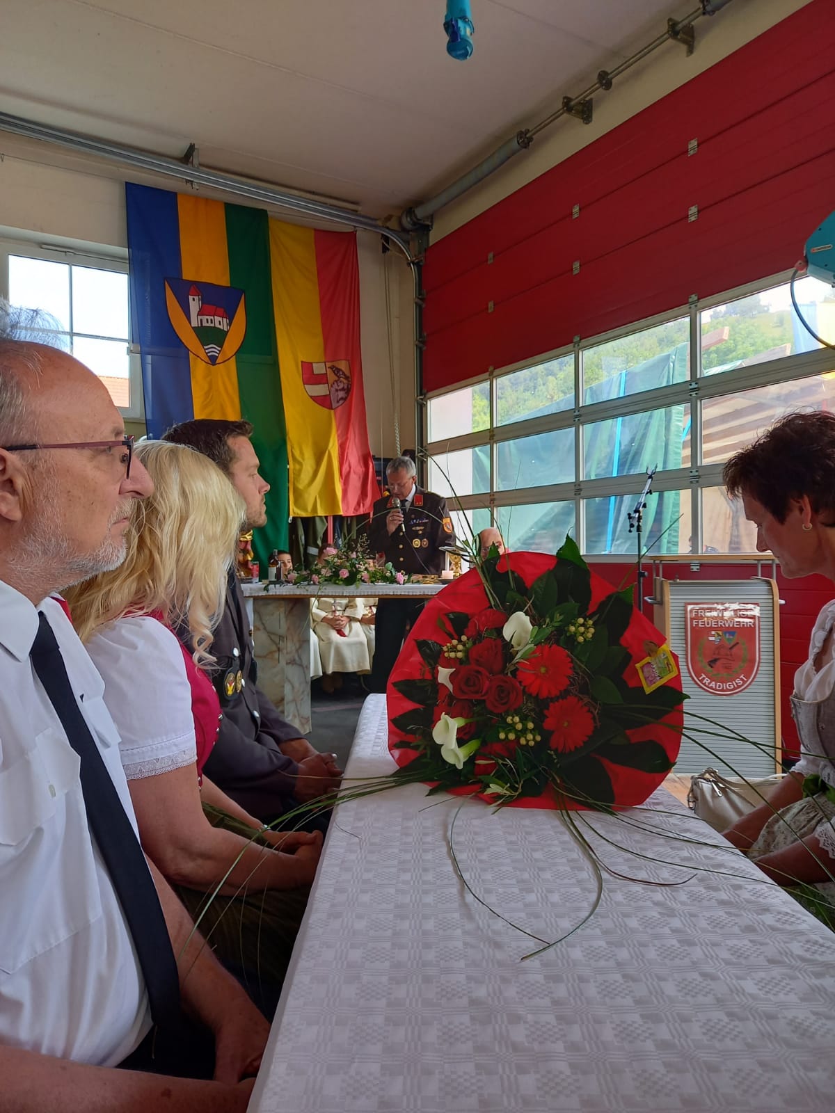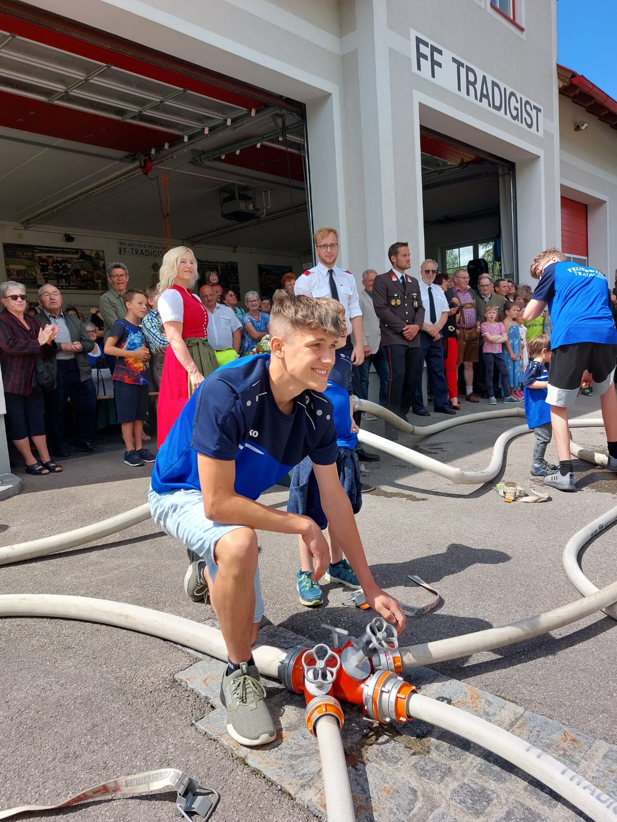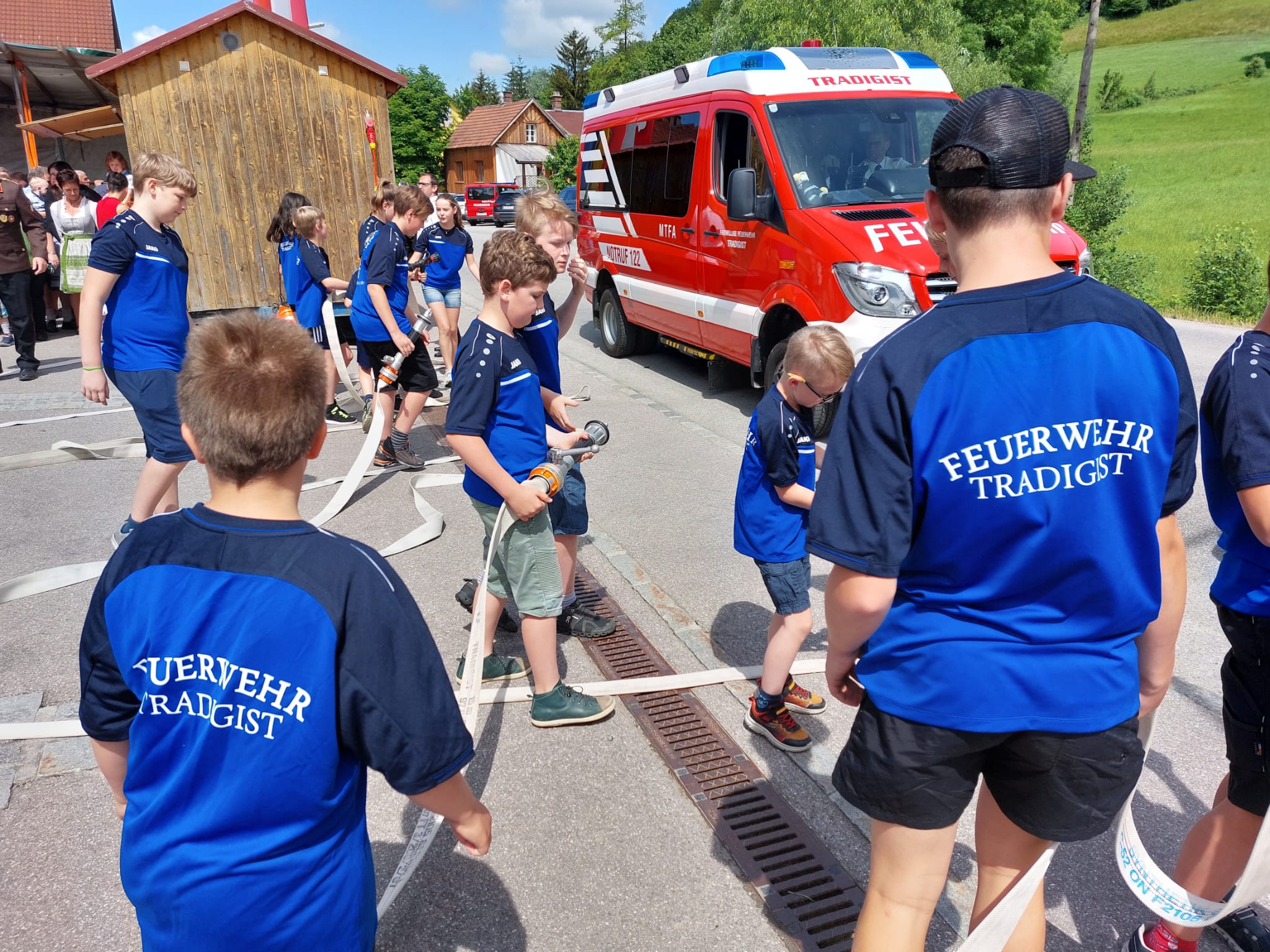 Die Heilige Messe wurde von Pater Leonhard im FF-Haus zelebriert und vom Tradigister Fünfg`sang musikalisch umrahmt. Während der Messe erfolgte die feierliche Segnung der neuen Tragkraftspritze deren Patin Brigitte Schmid ist. Nach den Ansprachen des Kommandanten und der beiden Bürgermeister wurde von den Tradigister Kindern ein bereits zuvor geübter Löschangriff mit 6 Strahlrohren und der neuen Tragkraftspritze gezeigt.
