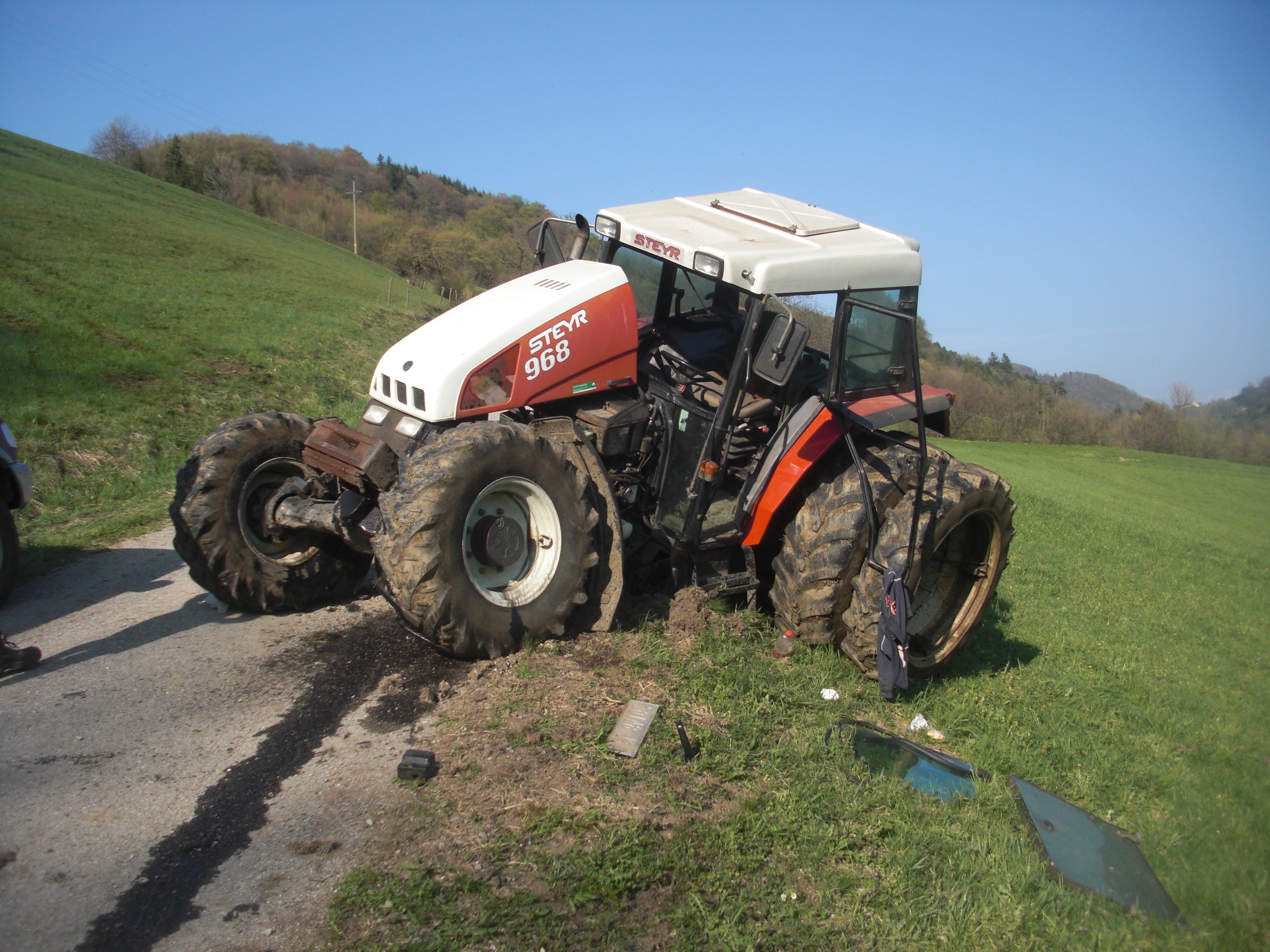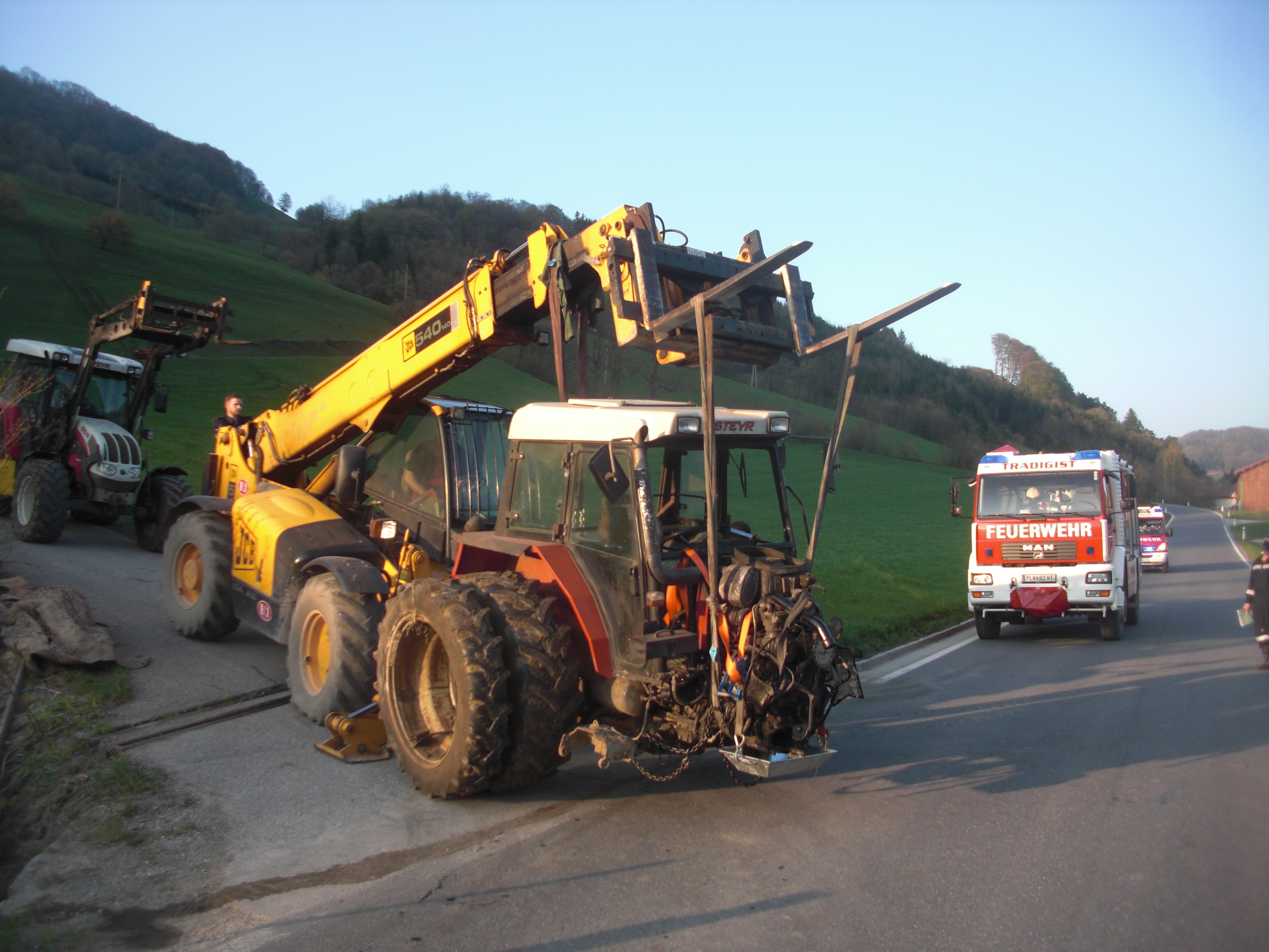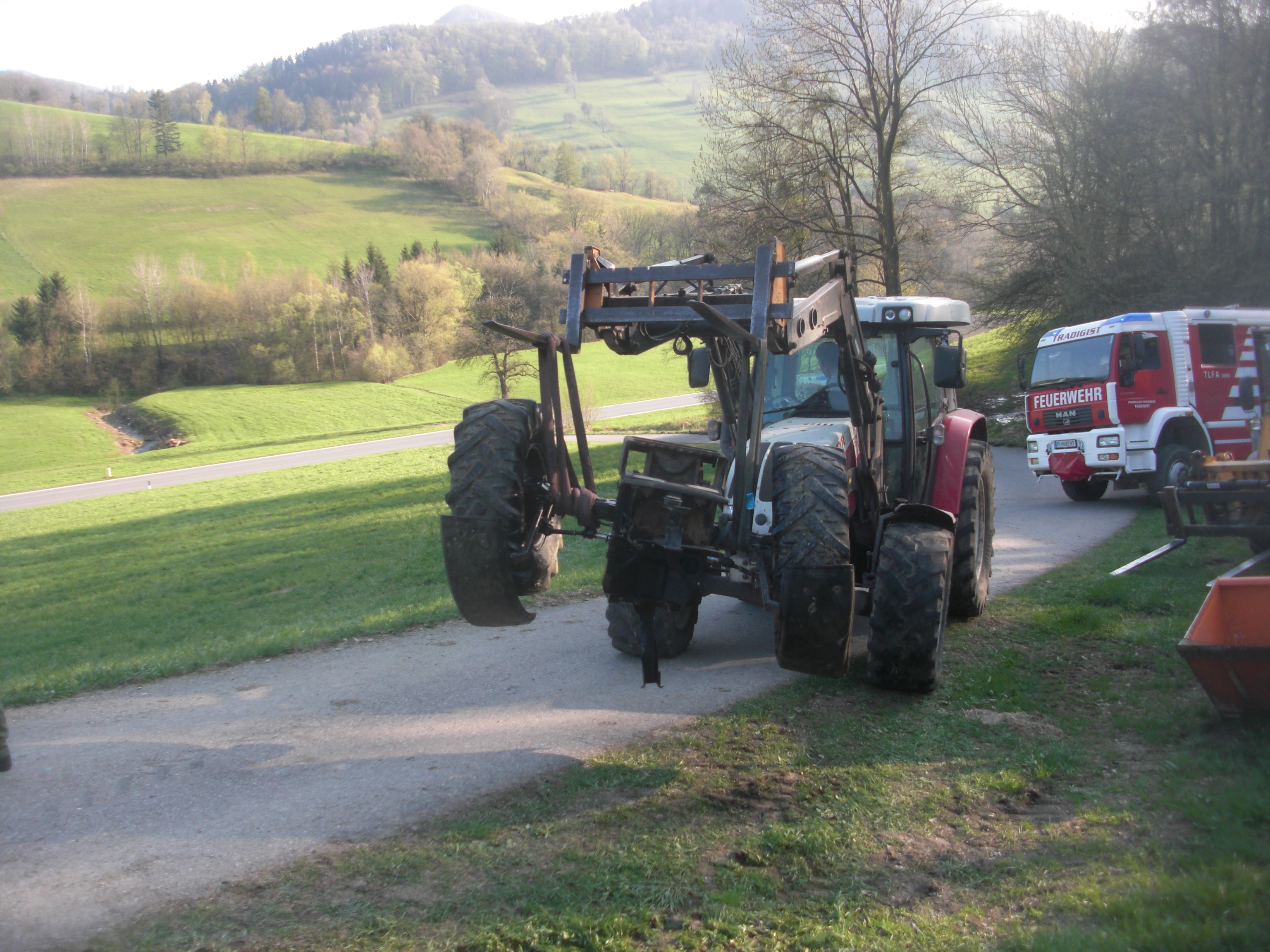 Traktorbergung Am Donnerstag, 25.04.2013 verlor ein Landwirt aus Tradigist die Herrschaft über seinen Traktor. Über ein sehr steiles Wiesestück rutschte das Fahrzeug einige Meter bergab und knallte mit voller Wucht auf den darunterliegenden Weg, sodass beide Achsen zu Bruch gingen.
