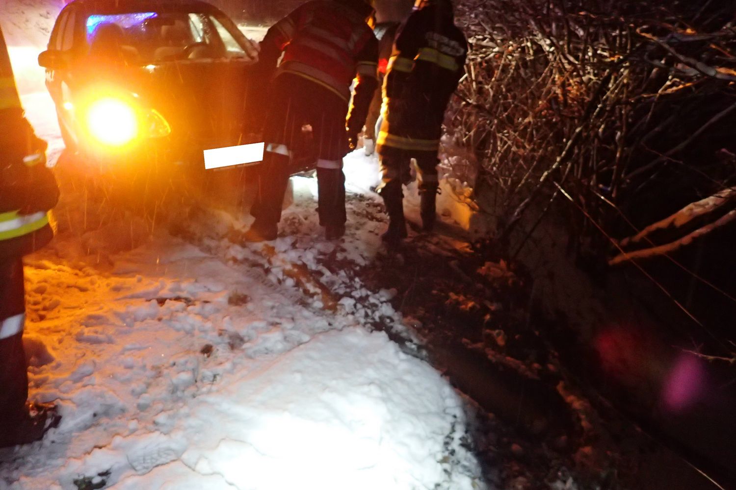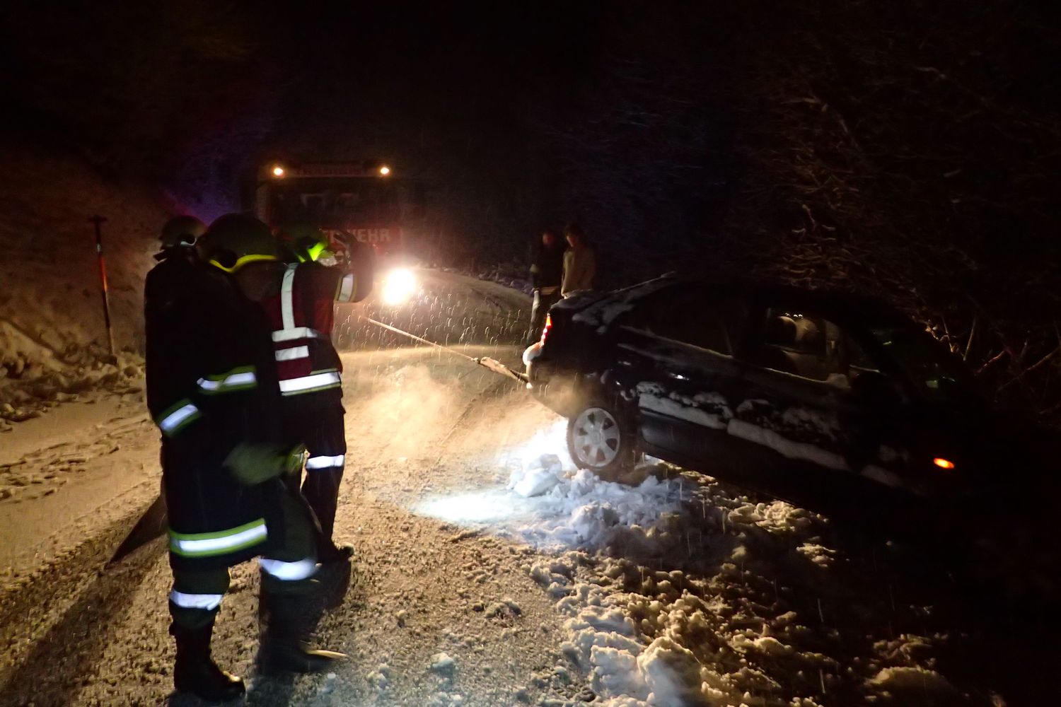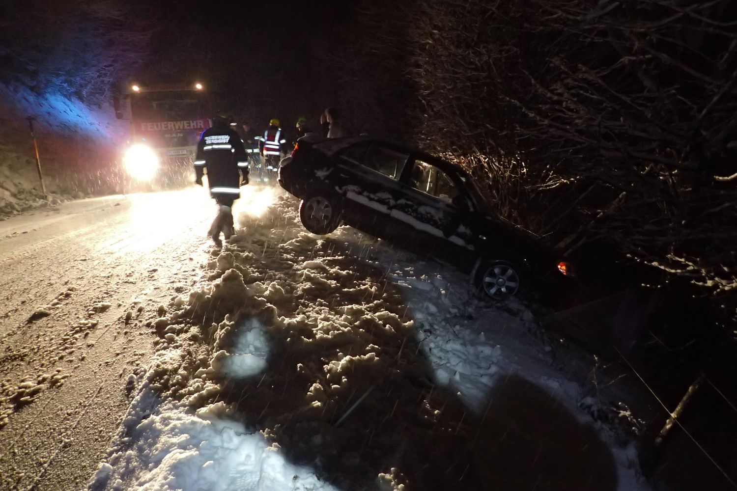Auf der noch nicht geräumten Schneefahrbahn war ein Richtung Eschenau fahrender PKW-Lenker nach einer Kurve ins Schleudern gekommen und kam danach von der Fahrbahn ab.