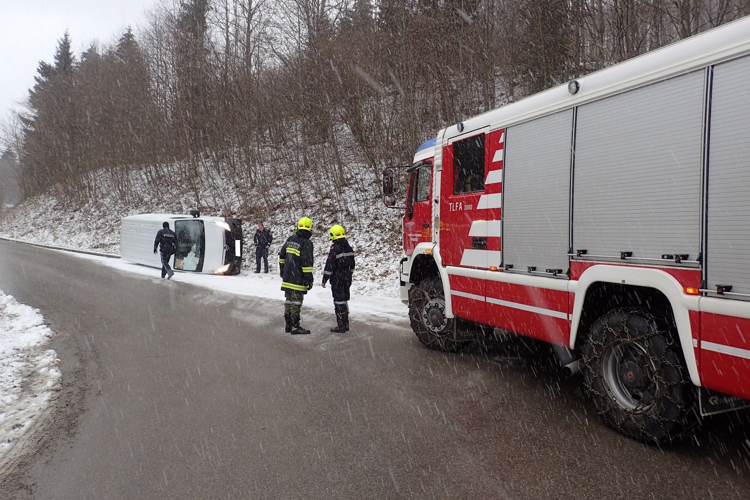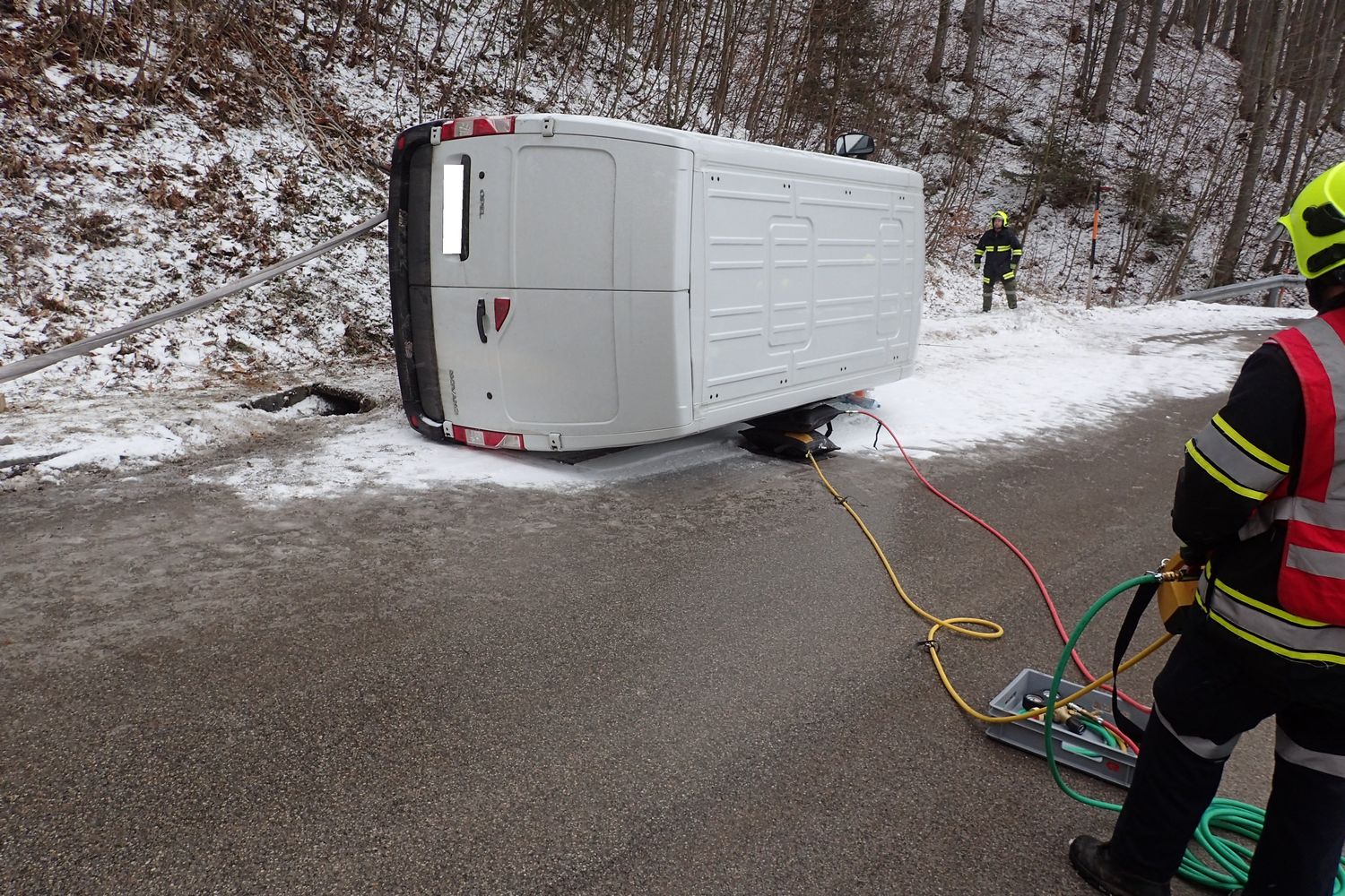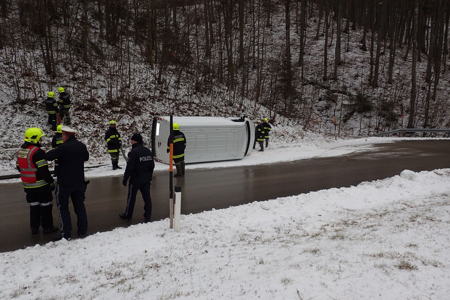 Der Fahrer eines Kleintransporters war auf der Schneefahrbahn ins Schleudern gekommen und verlor die Kontrolle über sein Fahrzeug. In weiterer Folge krachte der Transporter gegen die Straßenböschung und kippte anschließend zurück auf die Fahrbahn.