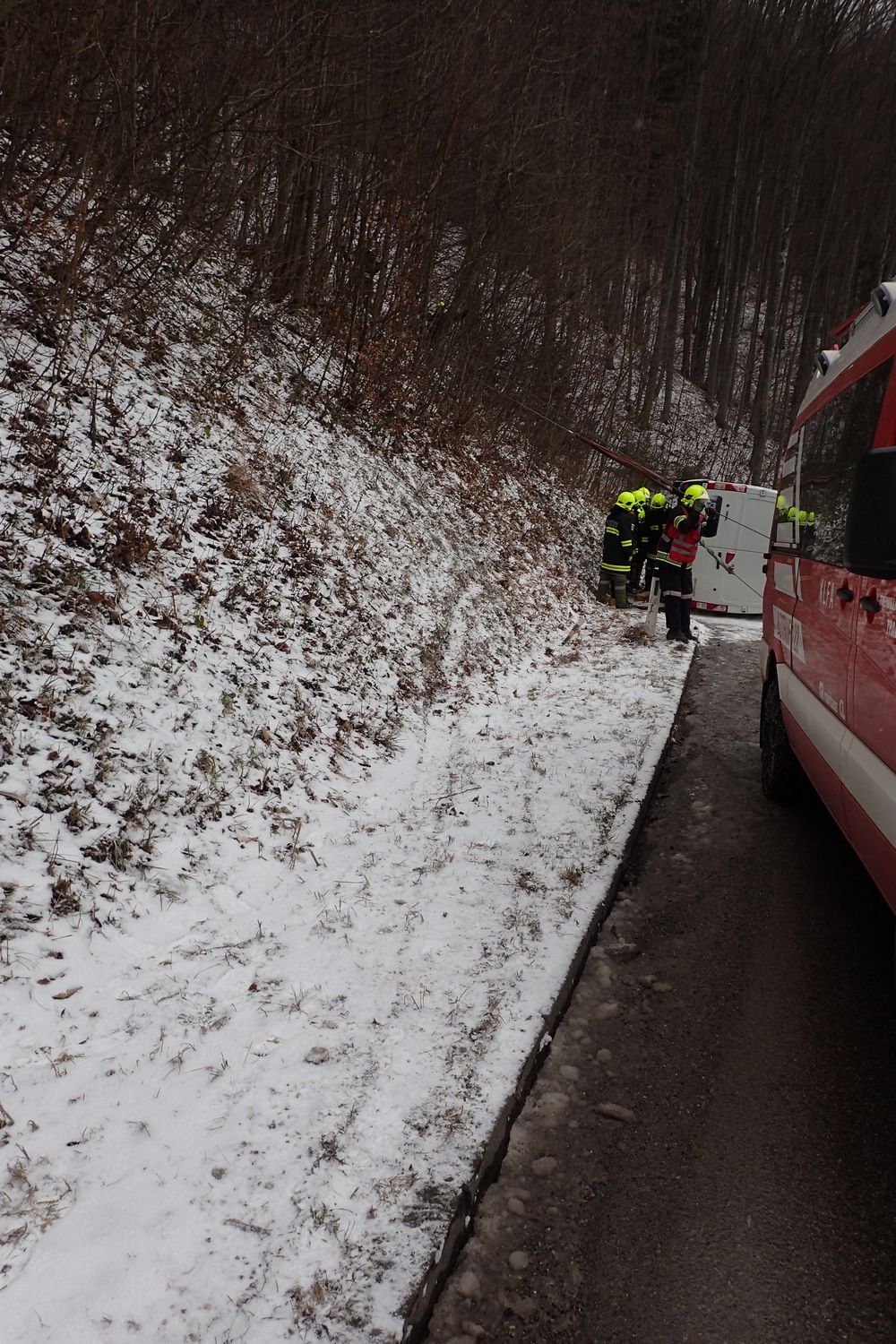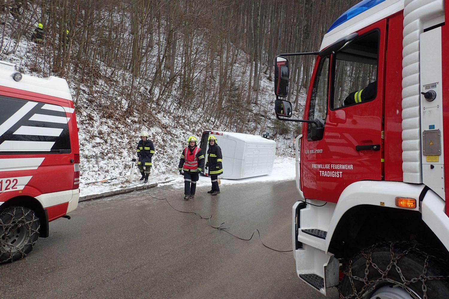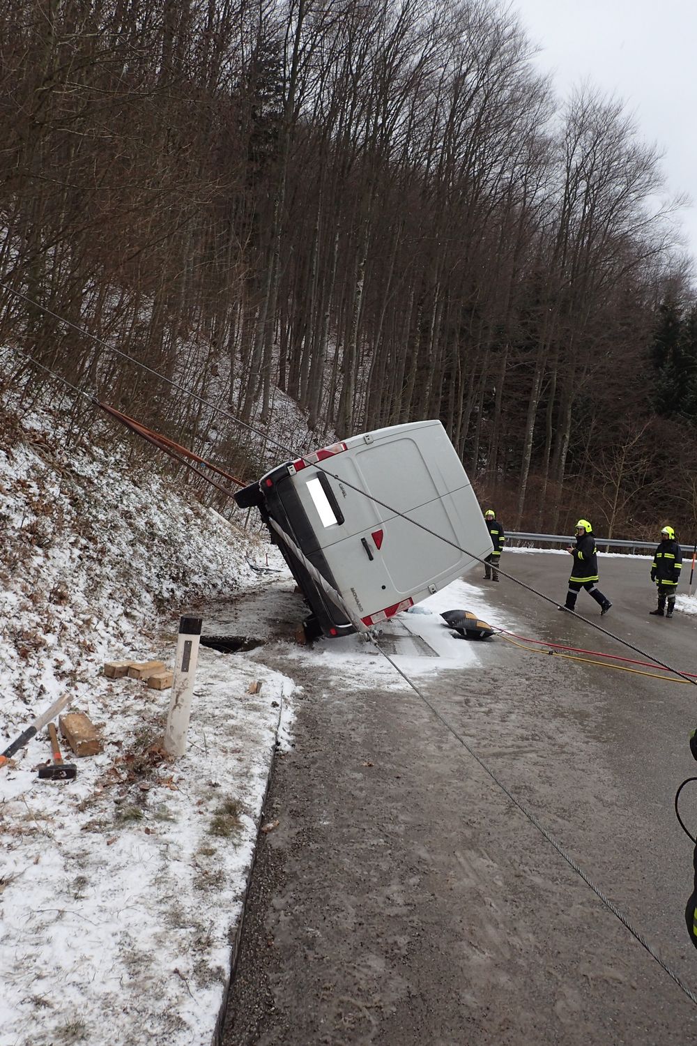 Der Fahrer eines Kleintransporters war auf der Schneefahrbahn ins Schleudern gekommen und verlor die Kontrolle über sein Fahrzeug. In weiterer Folge krachte der Transporter gegen die Straßenböschung und kippte anschließend zurück auf die Fahrbahn.