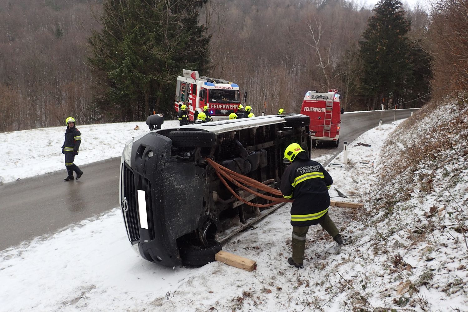 Nach der Absicherung der Unfallstelle musste zuerst die Bergung vorbereitet werden. Eine Umlenkrolle für die Seilwinde wurde an einen ca. 20m entfernten Baum befestigt. Weiters mussten einige Pölz-Hölzer plaziert und im Boden verankert werden. Dann wurde das verunfallte Fahrzeug mithilfe der Seilwinde unseres TLFA und Hebekissen wieder auf die Räder gestellt.