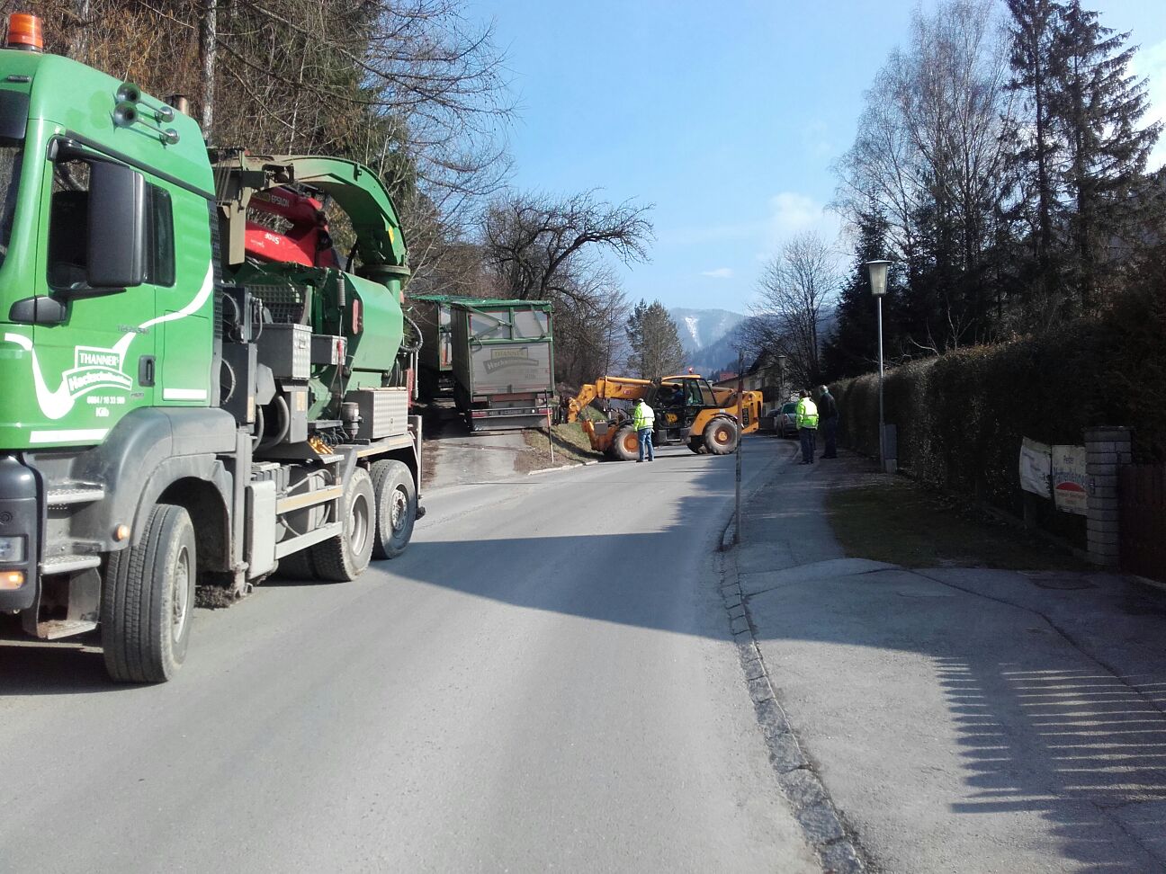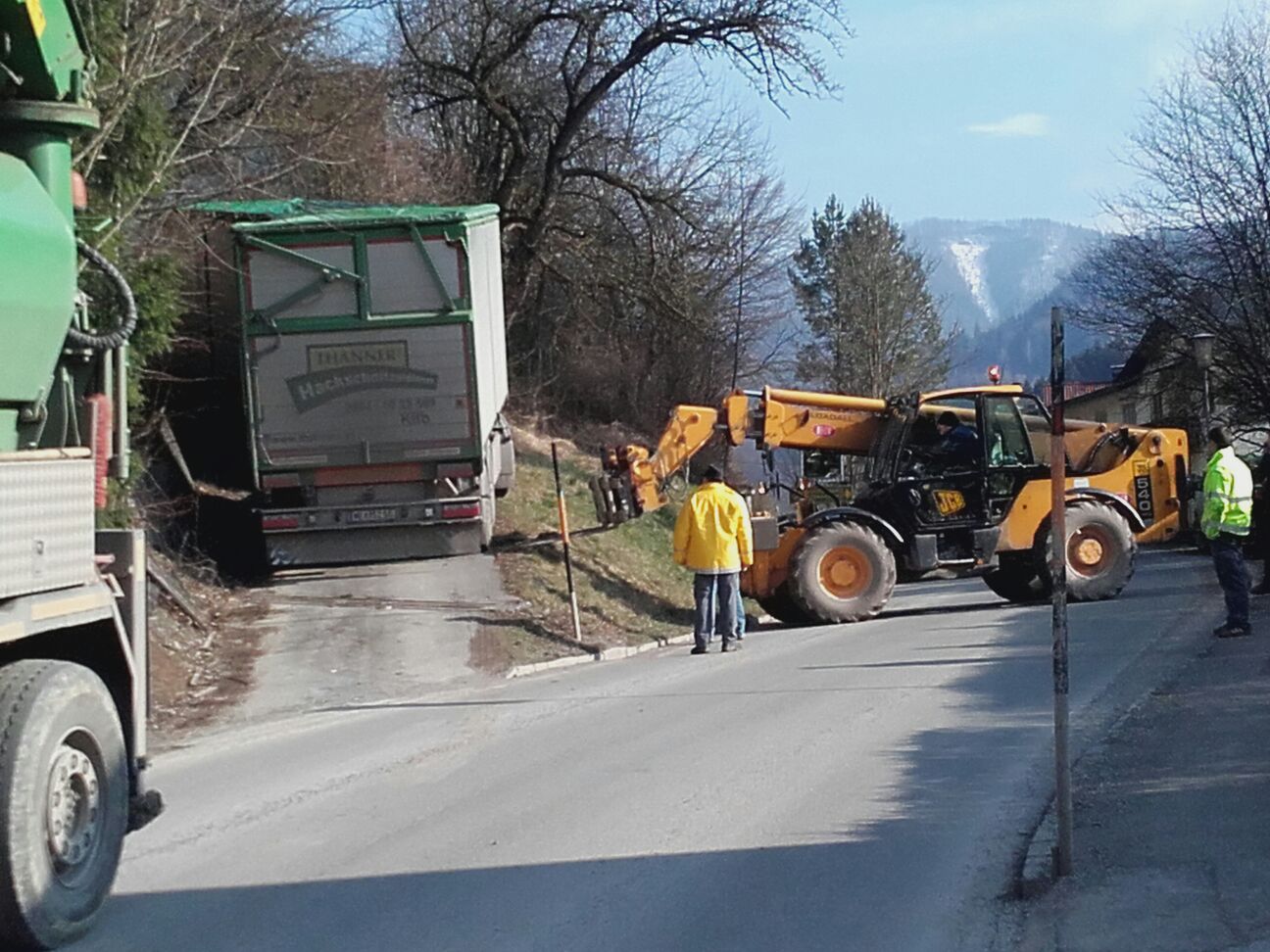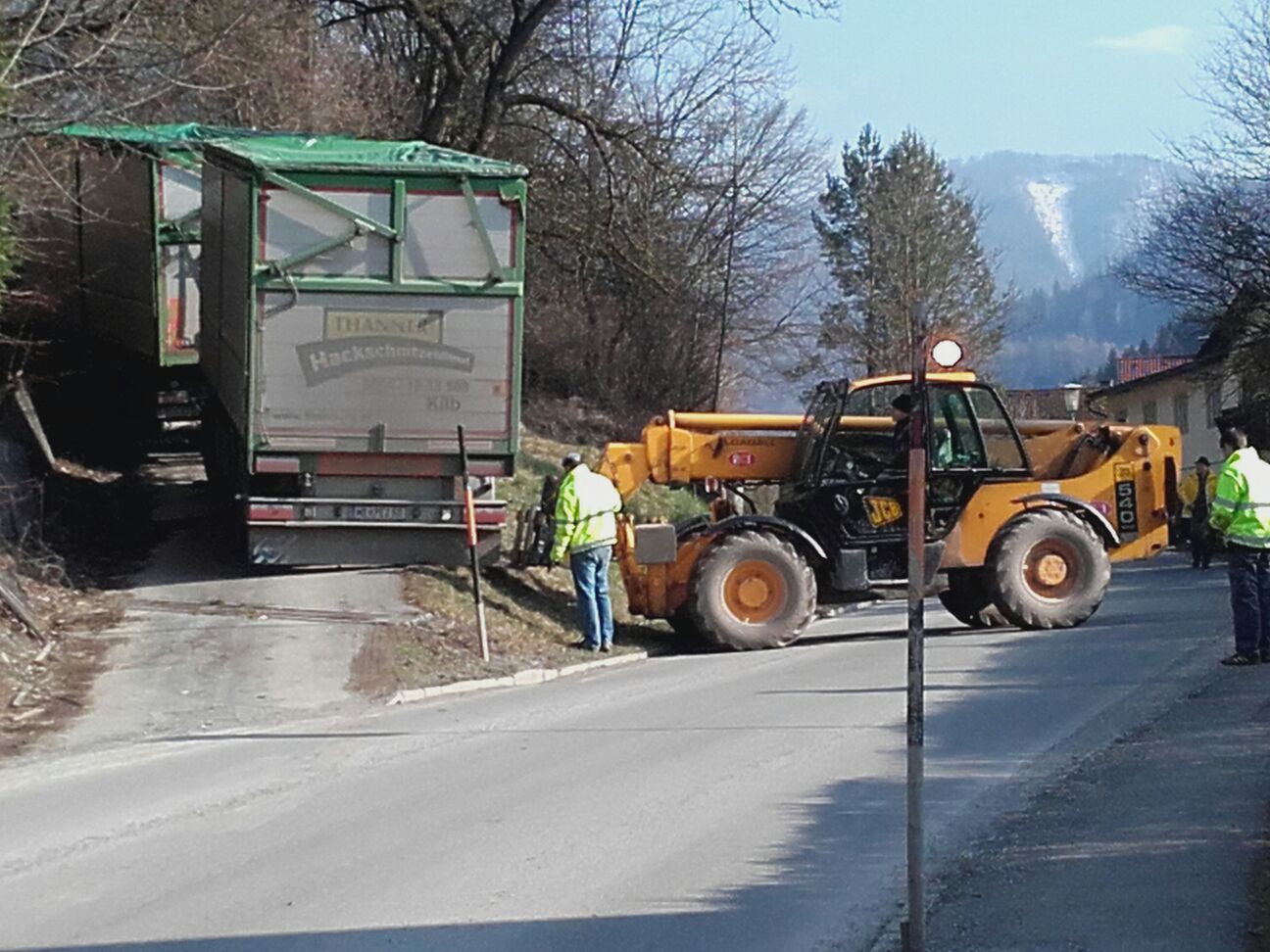 Nach dem Eintreffen an der Einsatzstelle, wurde die Lage erkundet und festgestellt, das sich mit unseren Mitteln die Bergung sehr schwer gestalten würde. Aus diesem Grund wurde ein Teleskoplader einer Privatfirma nachgefordert. Mit diesem konnte der LKW-Anhänger zurück auf den Weg gehoben werden.