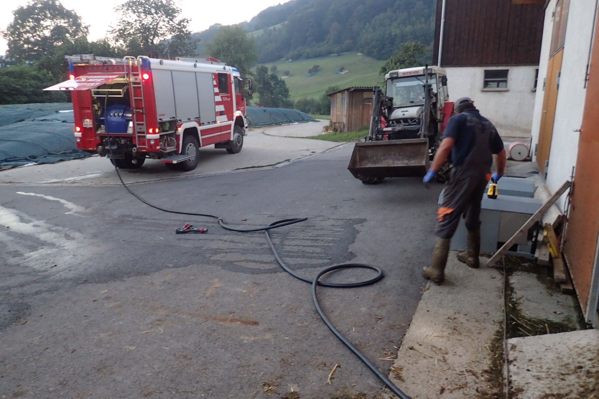Mit dem Kanalreinigungsgerät unseres TLFA 3000 wurde ein verstopfter Kanal eines landwirtschaftlichen Gebäudes wieder gereinigt und durchgespült.