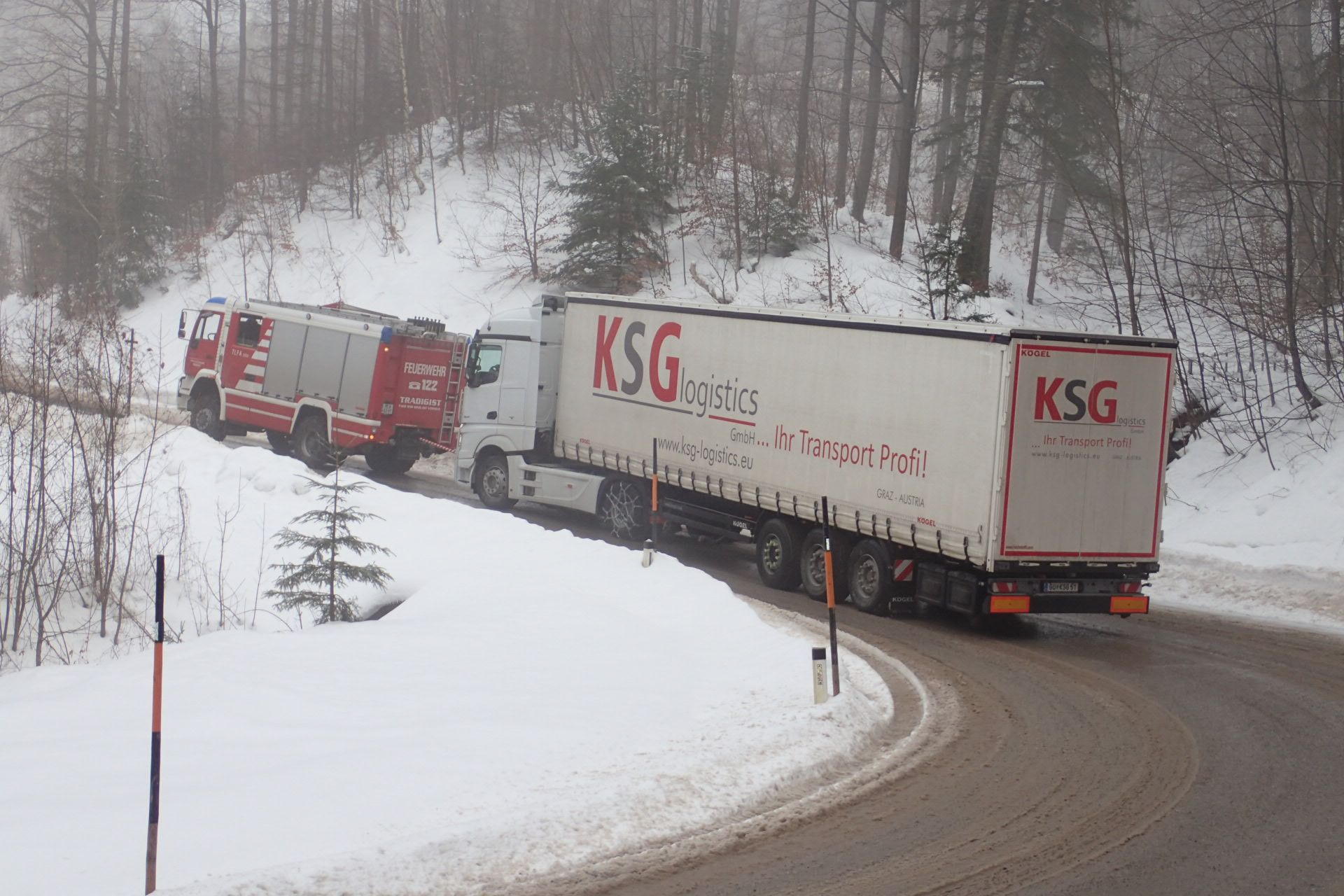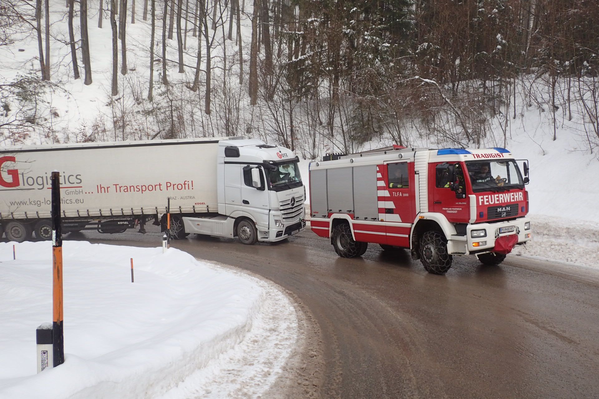 Auf der L5217 (Morigrabenstraße) blieb ein Sattelschlepper auf der rutschigen Fahrbahn hängen, somit war keine Weiterfahrt mehr möglich.