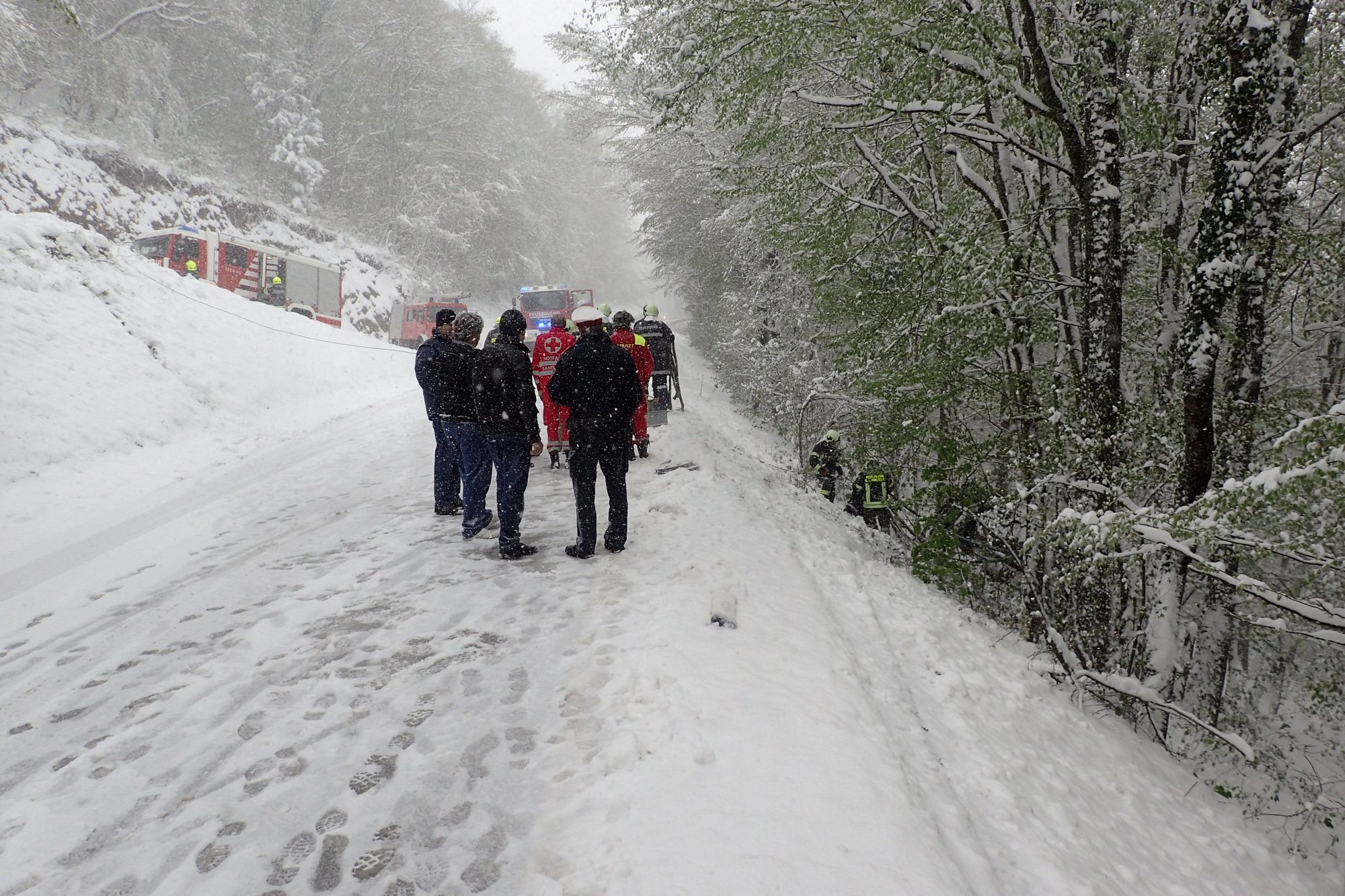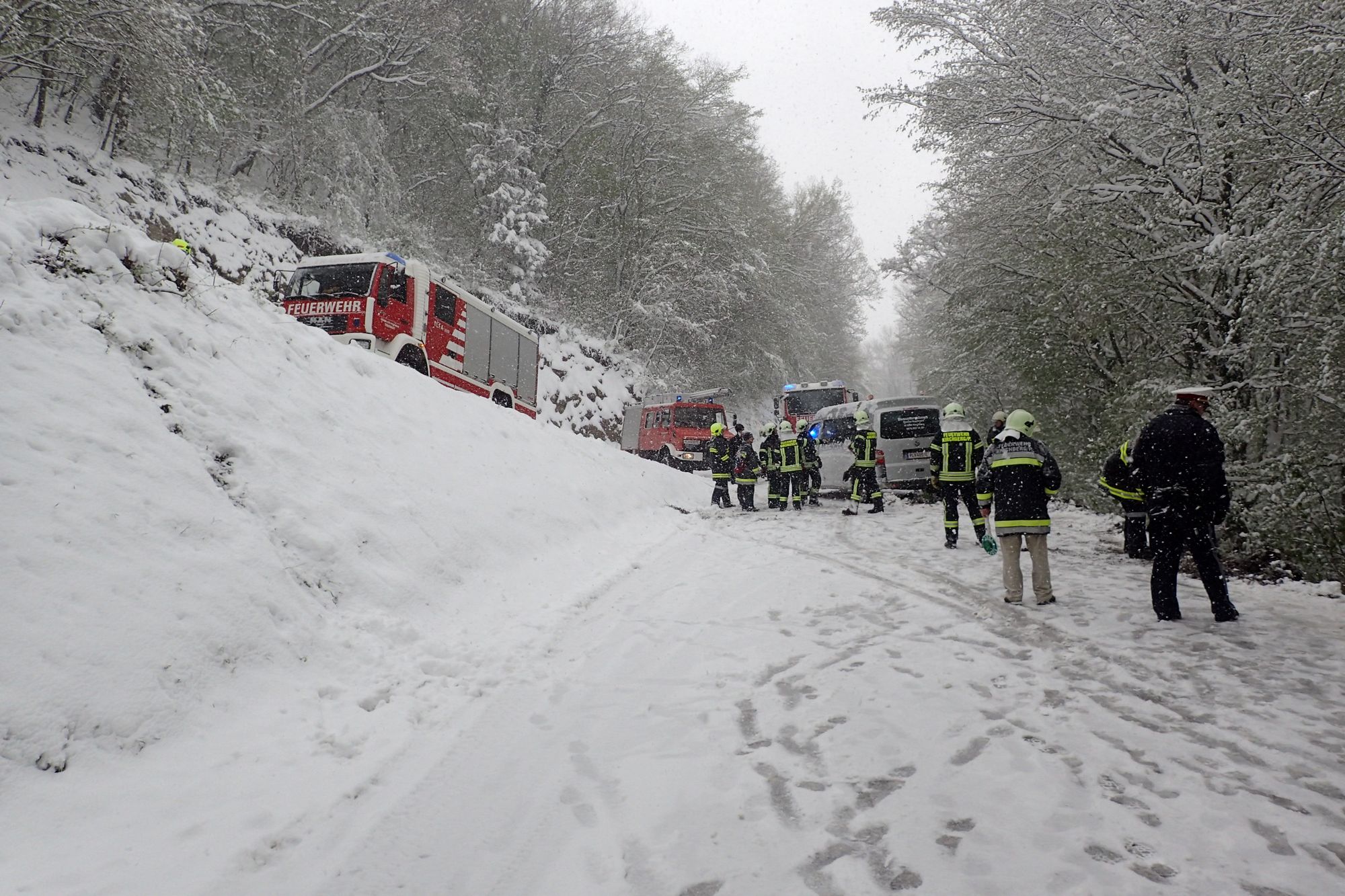 Ein Schulbus kam auf der L107 auf der schneebedeckten Fahrbahn aus unbekannter Ursache von der Fahrbahn ab, und blieb am Dach liegend in den Bäumen hängen.