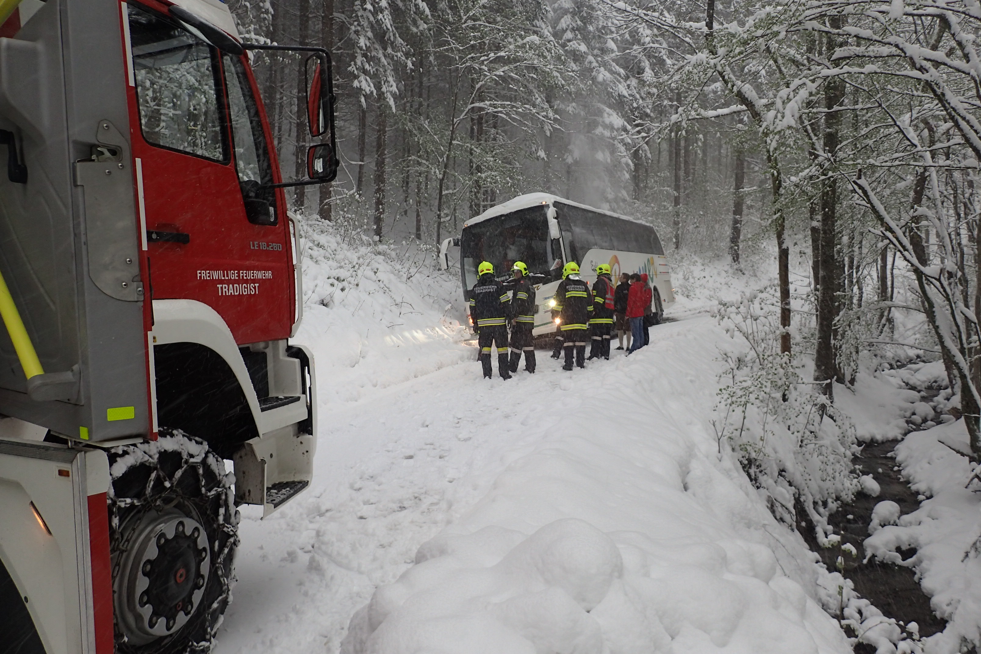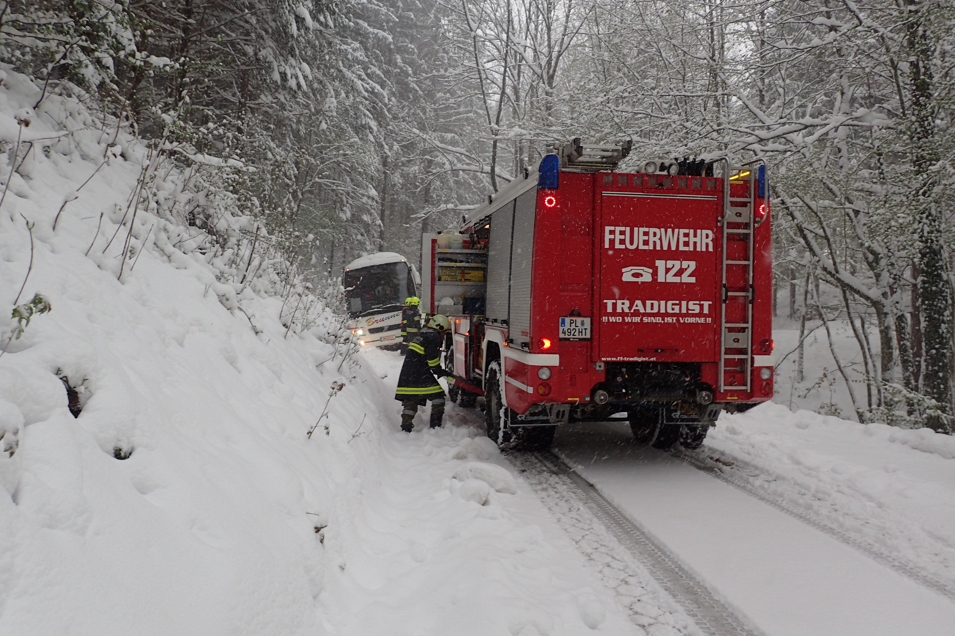Um 16.32 Uhr wurden wir erneut gemeinsam mit der FF-Kirchberg von Florian St. Pölten alarmiert. Ein Reisebus war auf einem Güterweg beim Bergabfahren auf der schneeglatten Fahrbahn in den Straßengraben gerutscht und konnte sich aus dieser Lage nicht mehr selbstständig befreien.