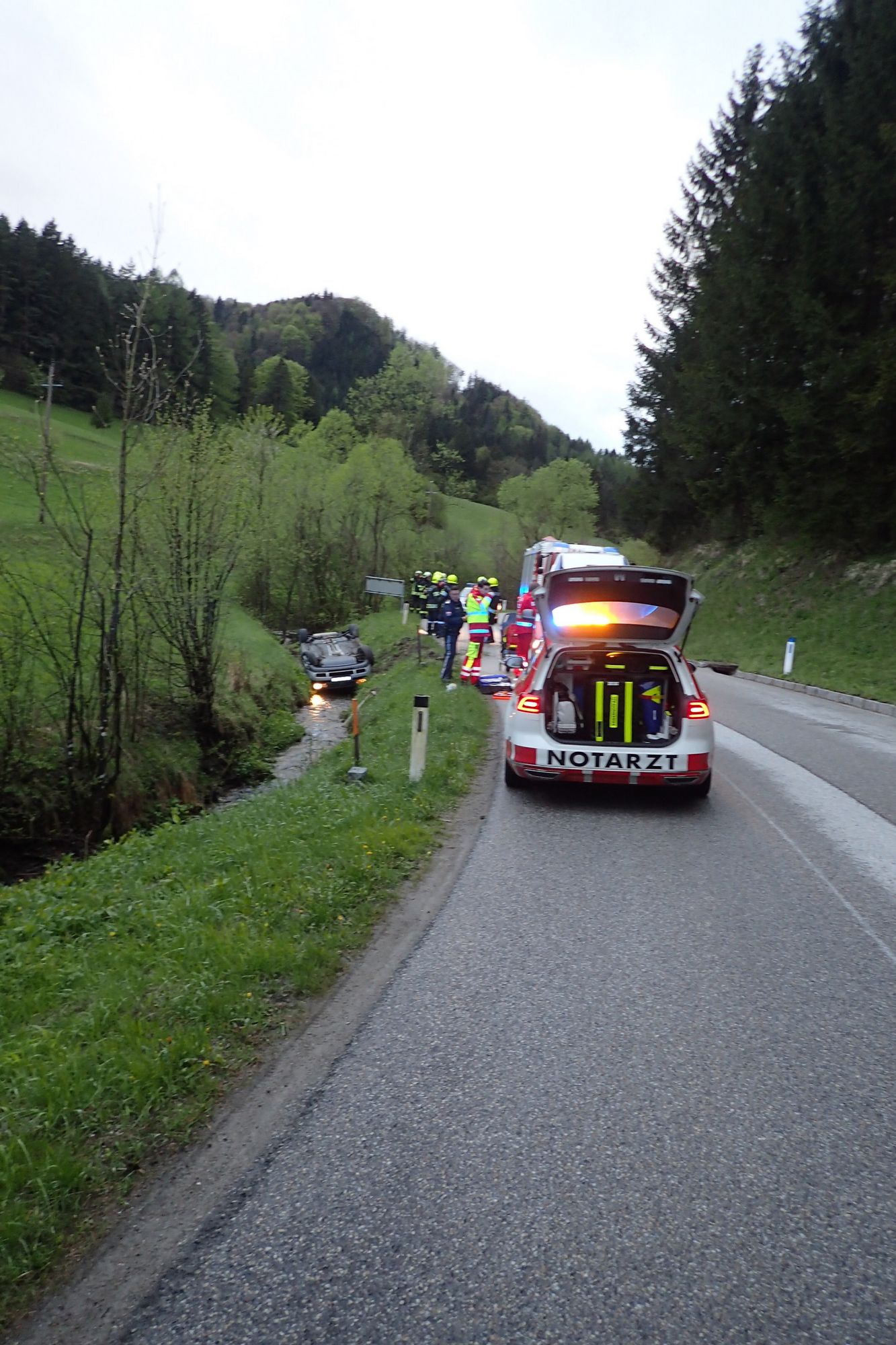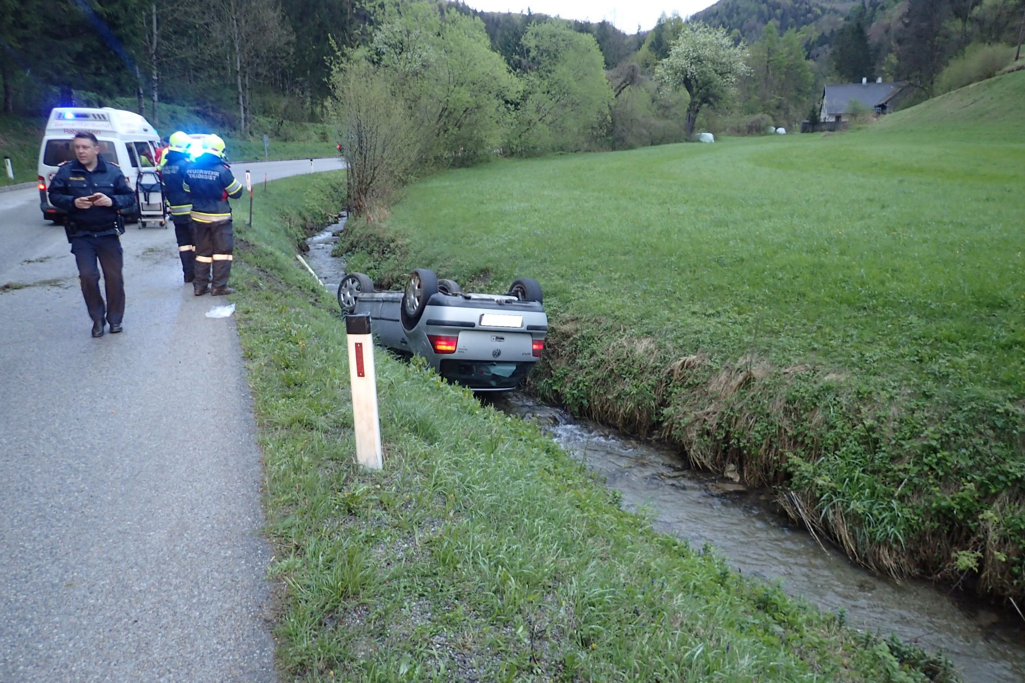 Ein junger Fahrzeuglenker kam aus unbekannter Ursache von der Fahrbahn ab, überschlug sich in das Bachbett und blieb dort am Dach liegen.
