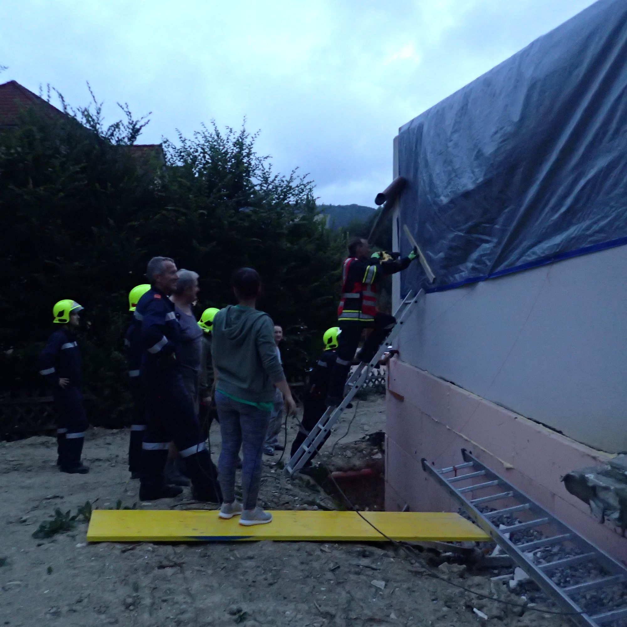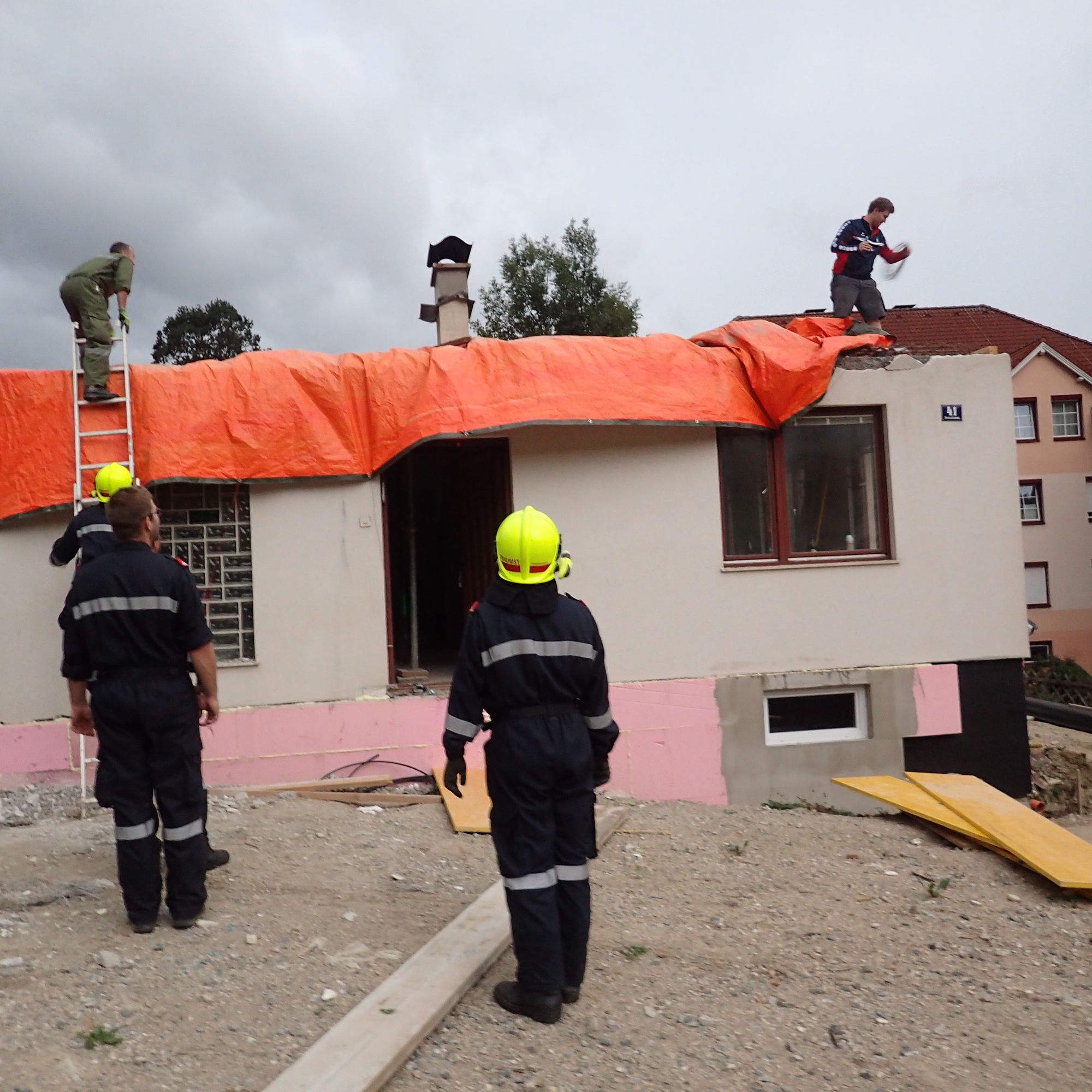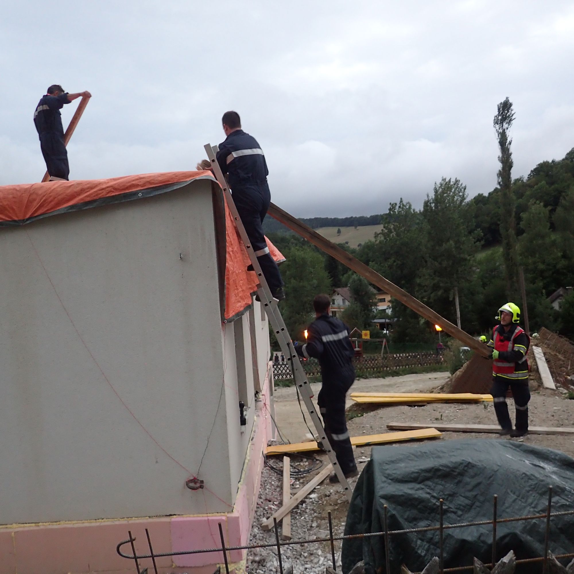 Wir unterstützten die Hauseigentümer beim Sichern der Planen mittels Pfosten und Kanthölzer, welche auf die Planen gelegt wurden. Weiters wurden die Planen an der Fassade mittels Draht niedergehängt.