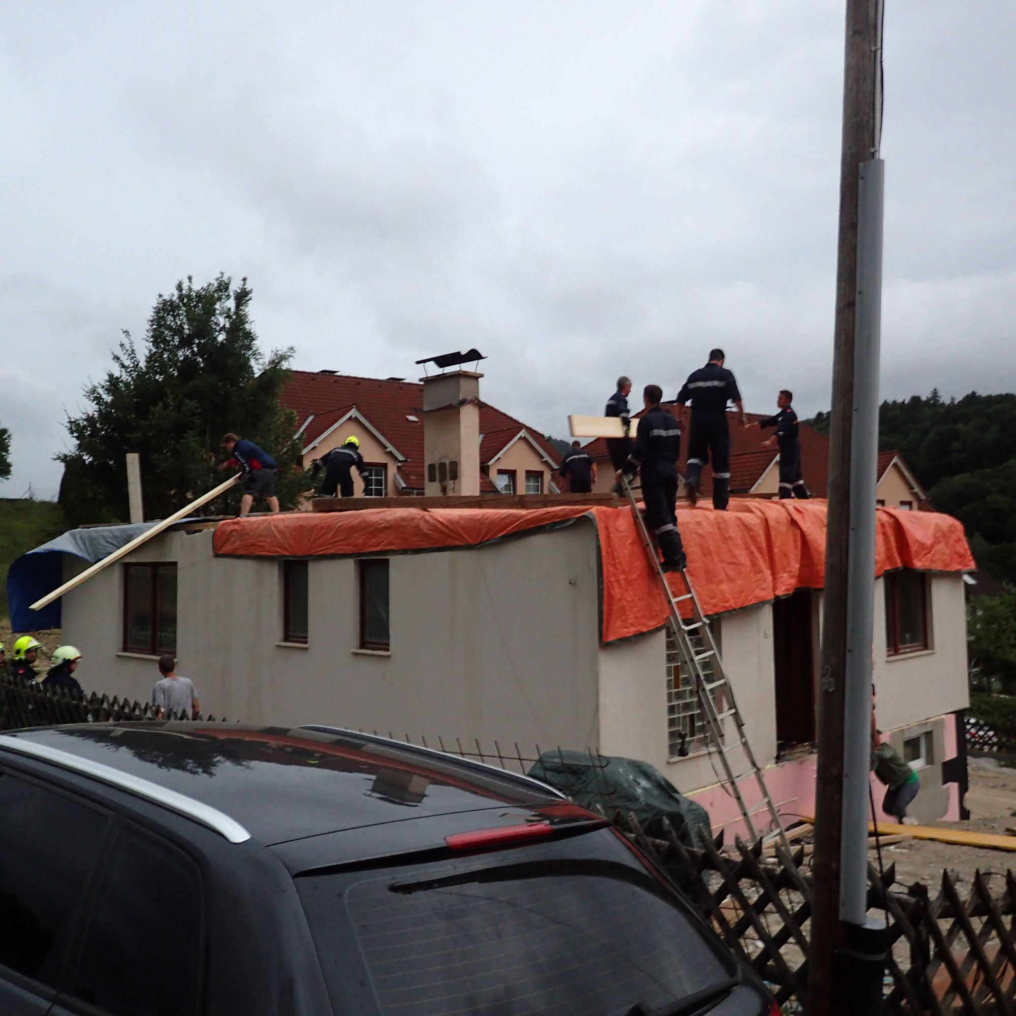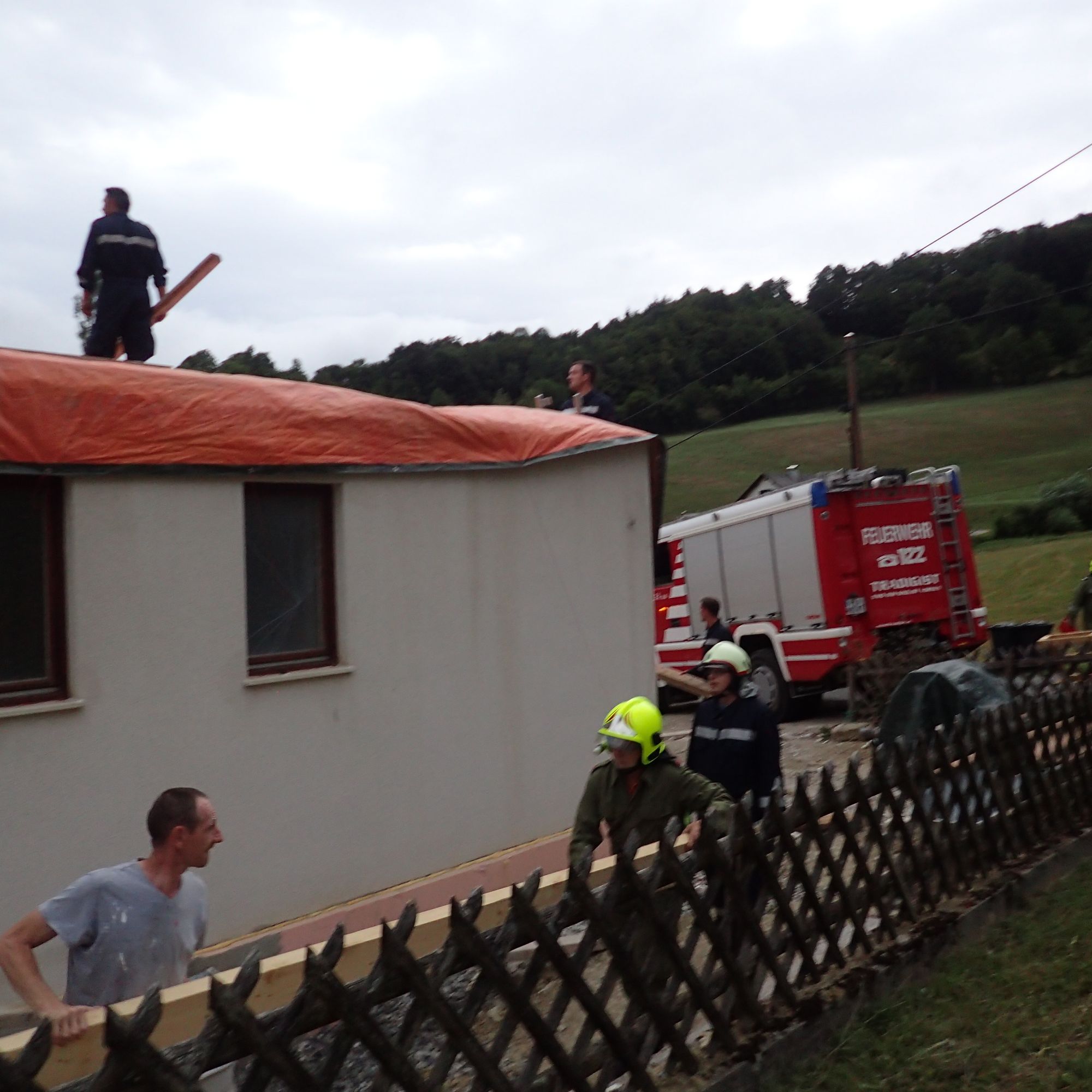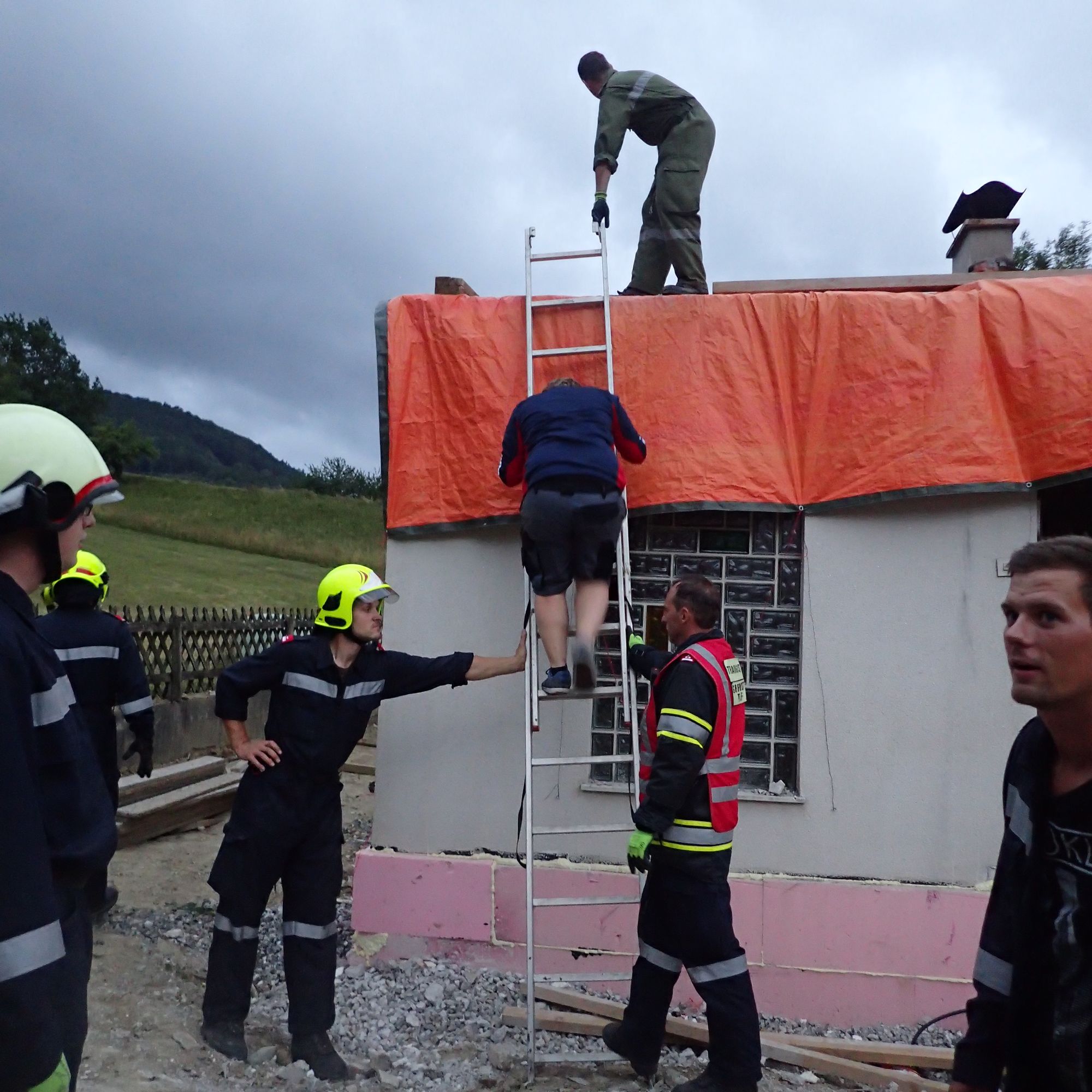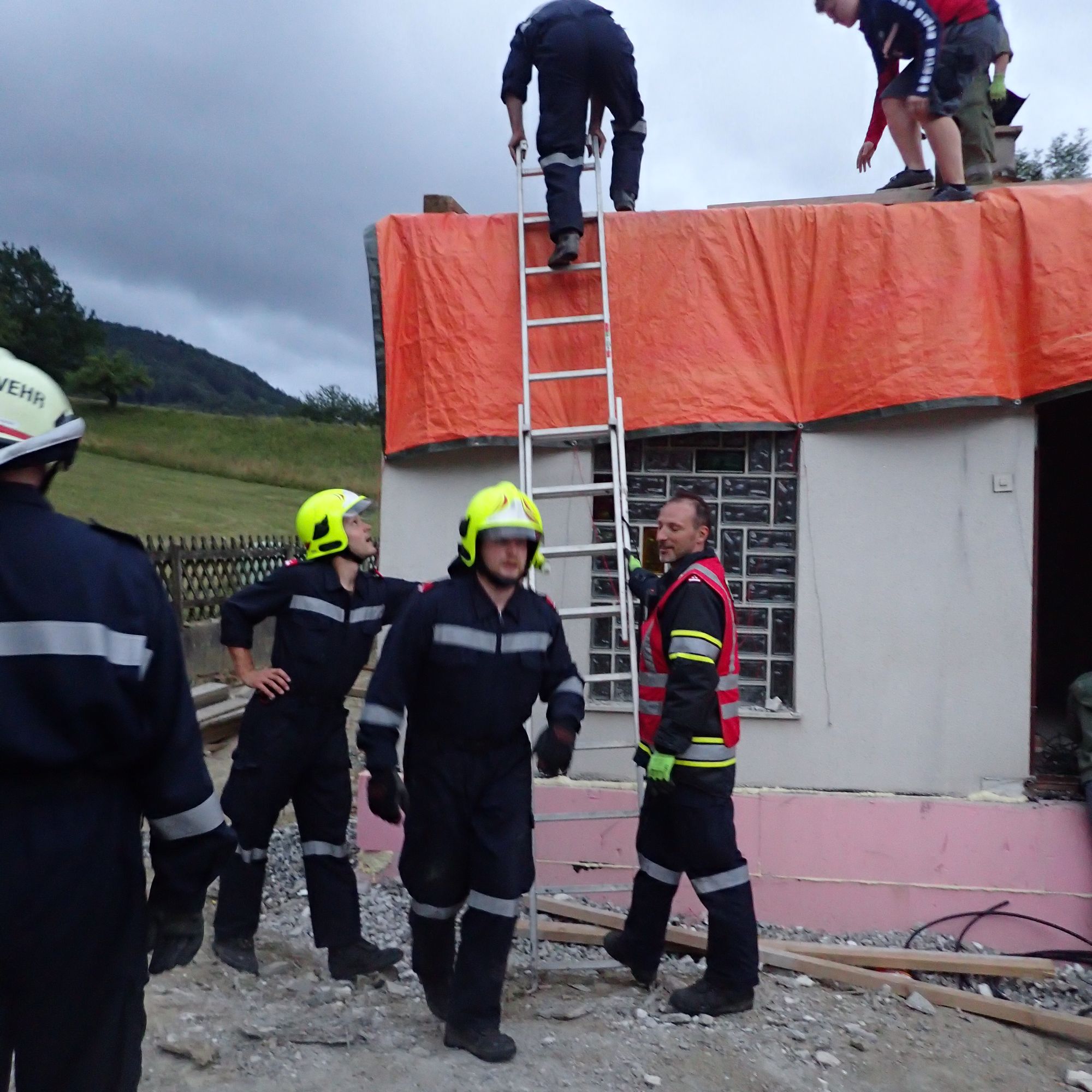 Wir unterstützten die Hauseigentümer beim Sichern der Planen mittels Pfosten und Kanthölzer, welche auf die Planen gelegt wurden. Weiters wurden die Planen an der Fassade mittels Draht niedergehängt.