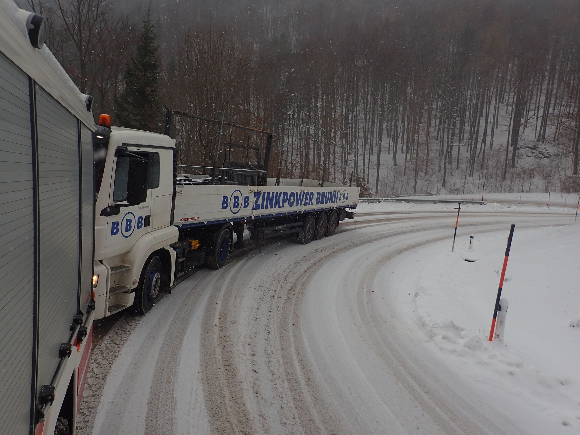 Ein Sattelschlepper war bei den winterlichen Fahrverhältnissen an der steilsten Stelle am Morigraben trotz angelegter Ketten hängengeblieben.