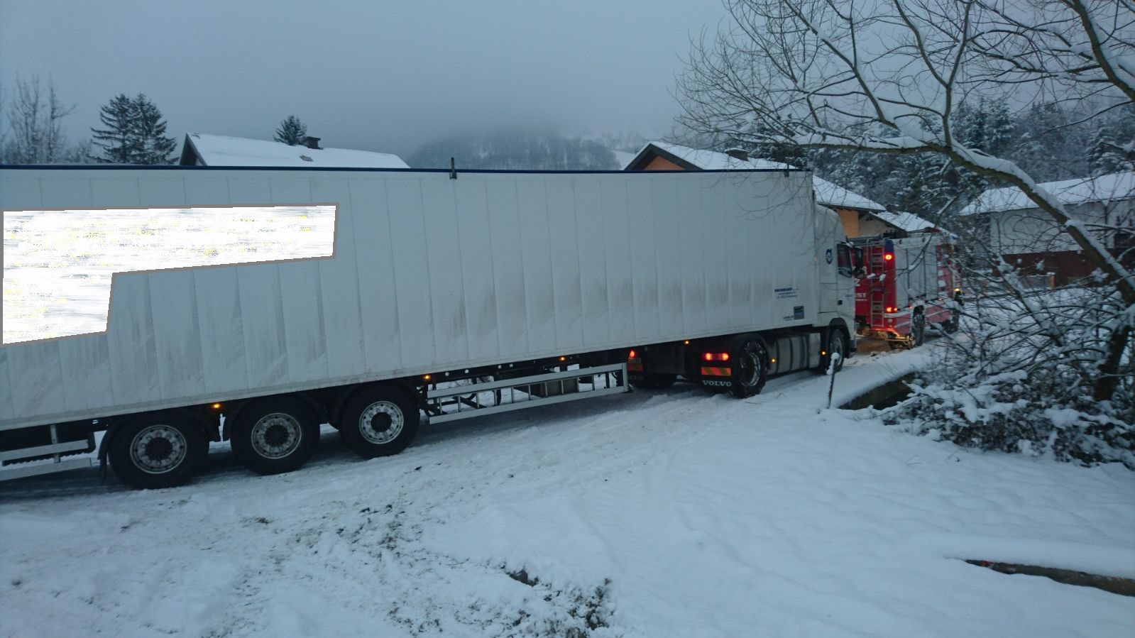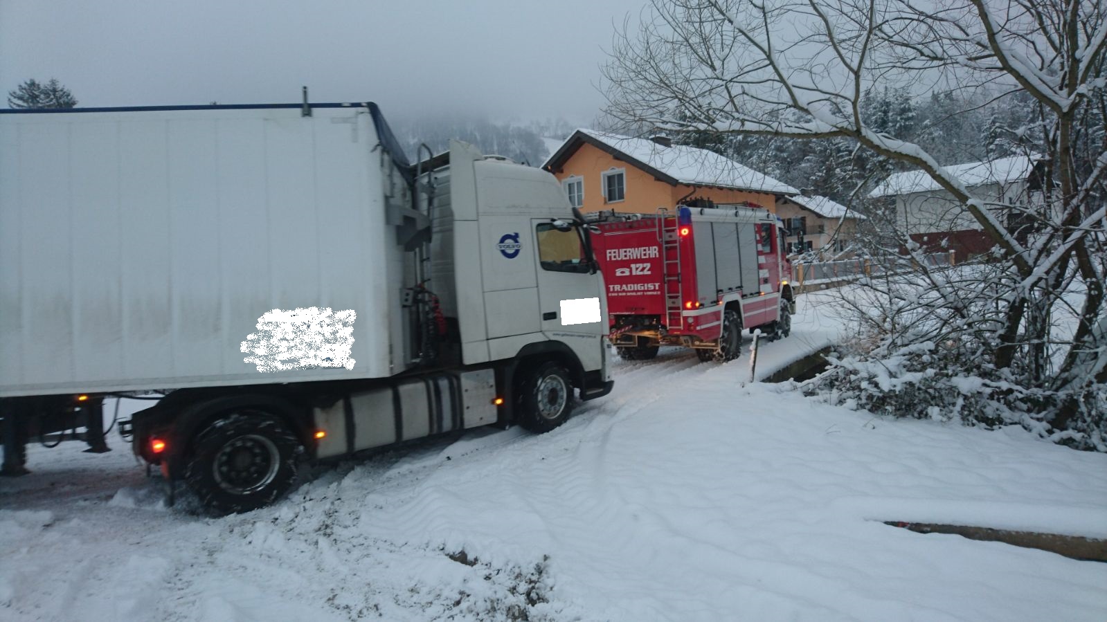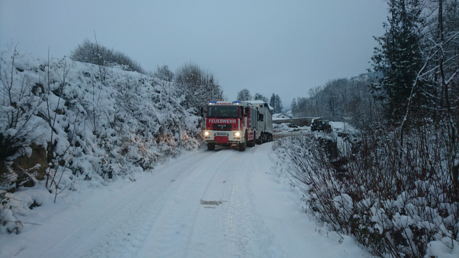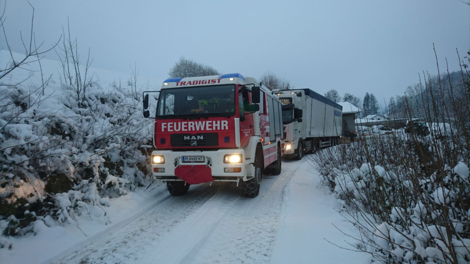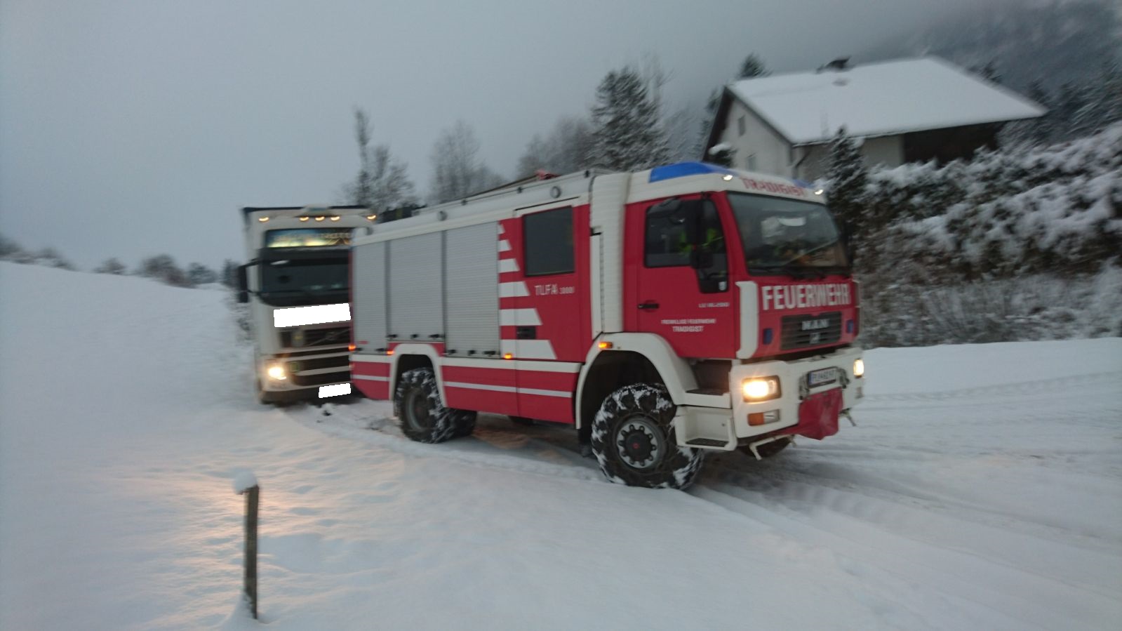Trotz angelegter Schneeketten bemerkte der Fahrer wie gefährlich dieses Unterfangen auf dem durch Eis und Schnee sehr rutschigen Untergrund war. Der Grundbesitzer verständigte daraufhin die FF- Tradigist, um den LKW auf dem Rückweg zu sichern. Mittels TLF und Schleppstange wurde er wieder auf befestigten Untergrund gezogen, und konnte so unbeschadet sein Vorhaben weiterführen.