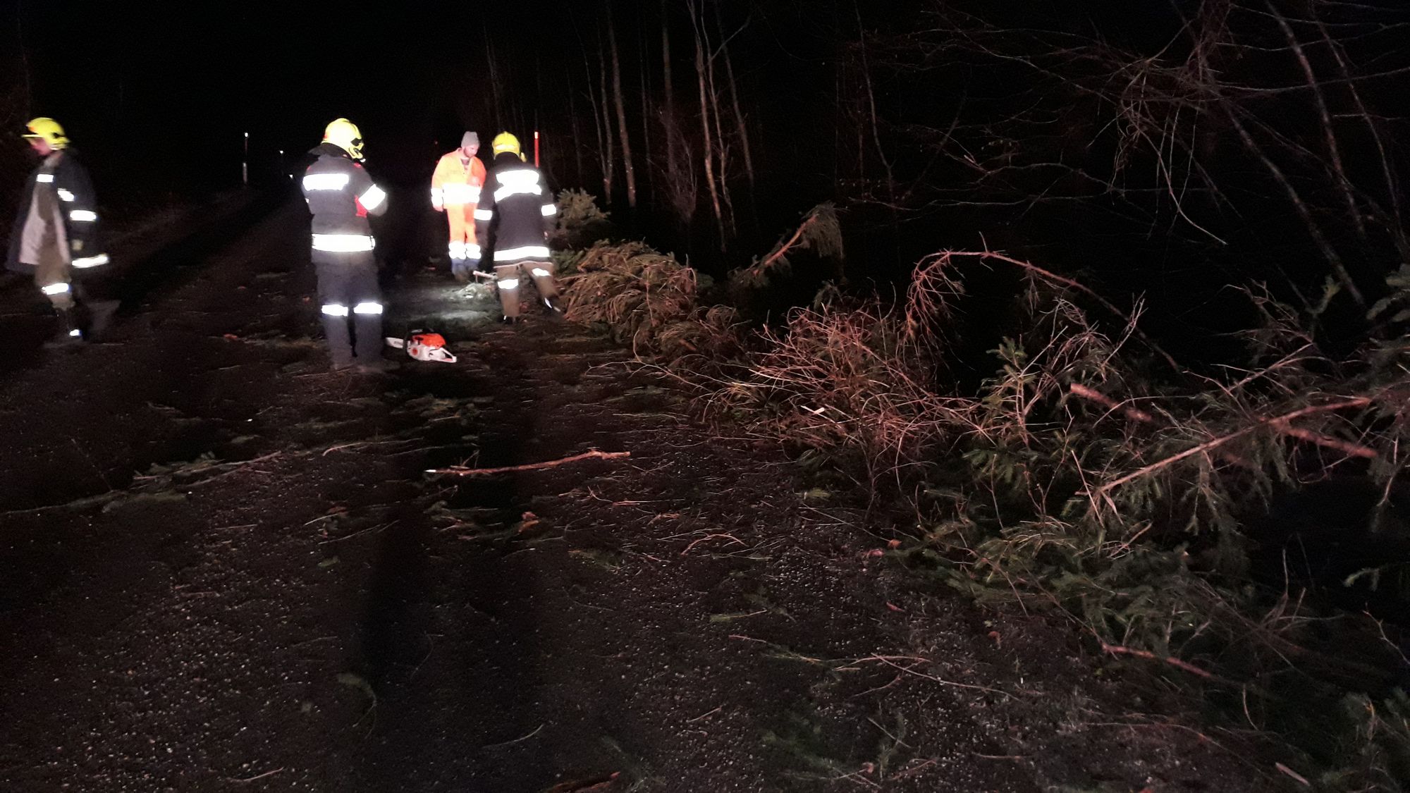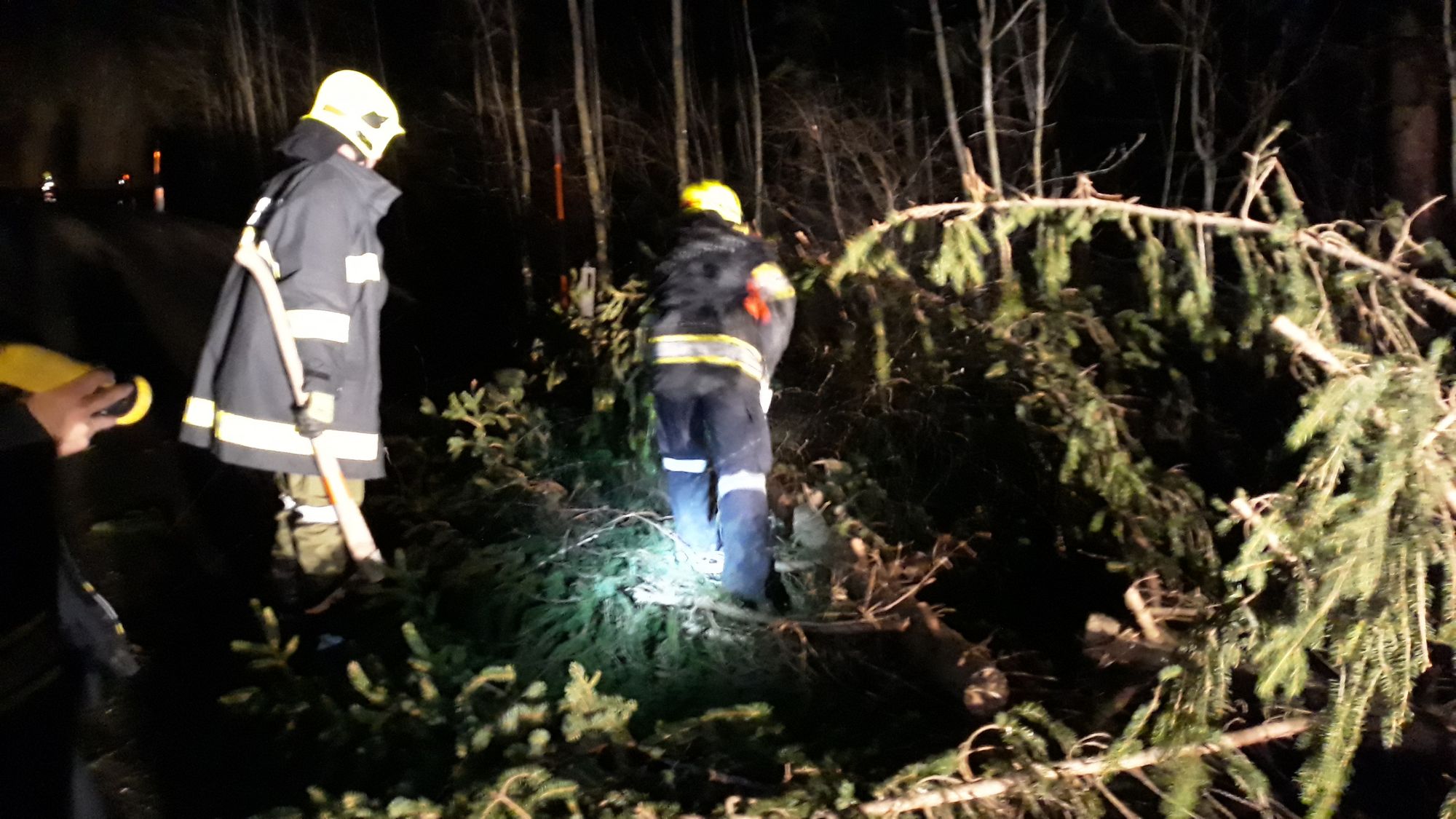 Das Tanklöschfahrzeug fuhr inzwischen zum eigentlichen Einsatzort vor. Nachdem die Einsatzstelle abgesichert war, wurde mit der Aufarbeitung des umgestürzten Baumes mit der Motorsäge begonnen.