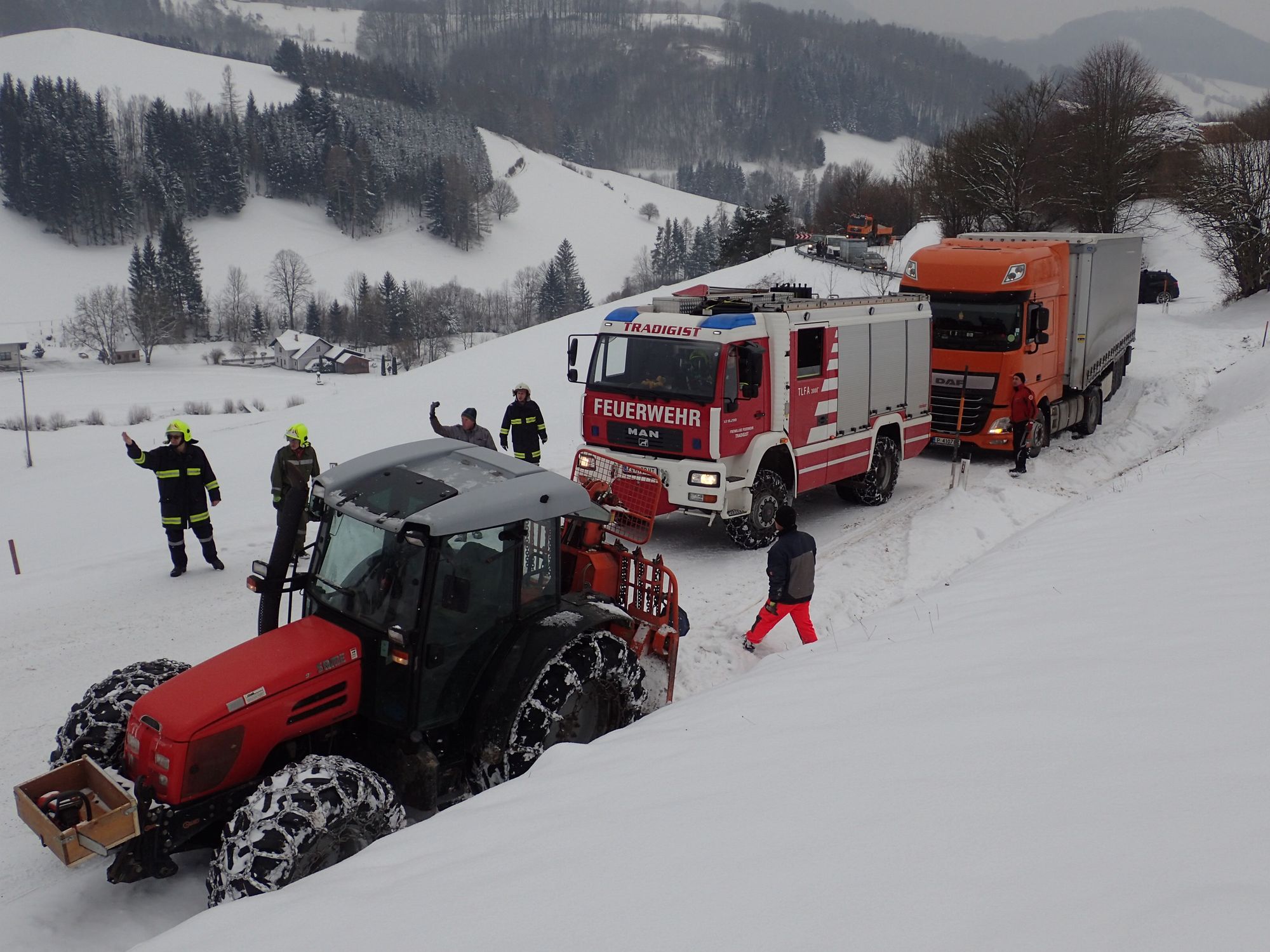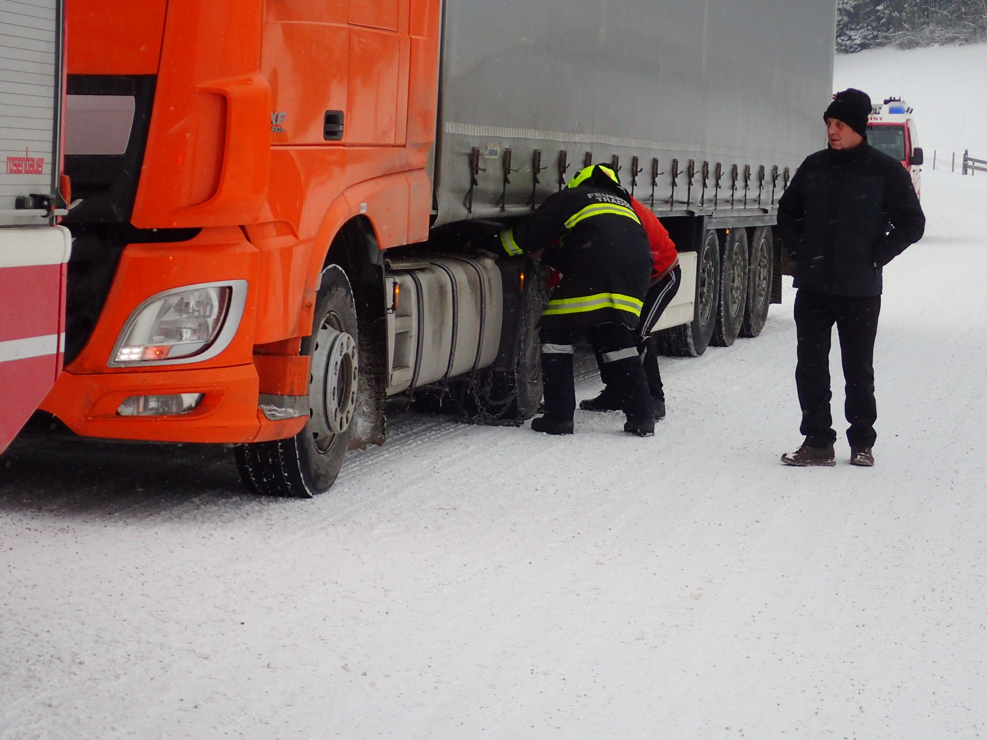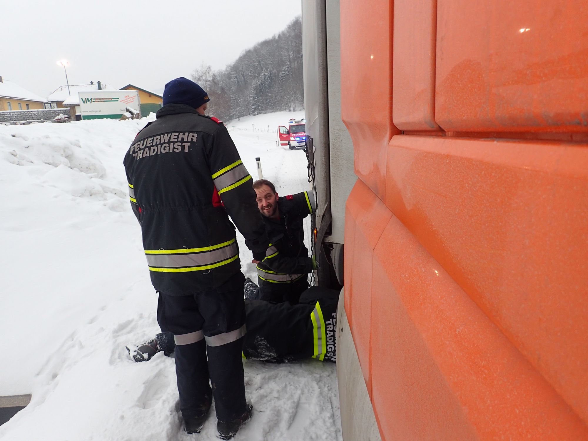 Ein LKW war auf der schneeglatten Fahrbahn hängengeblieben. Mittels Schleppstange zogen wir das Fahrzeug bis zur Ausfahrt Gaiseben, und unterstützen ihn beim Anlegen der Schneeketten.