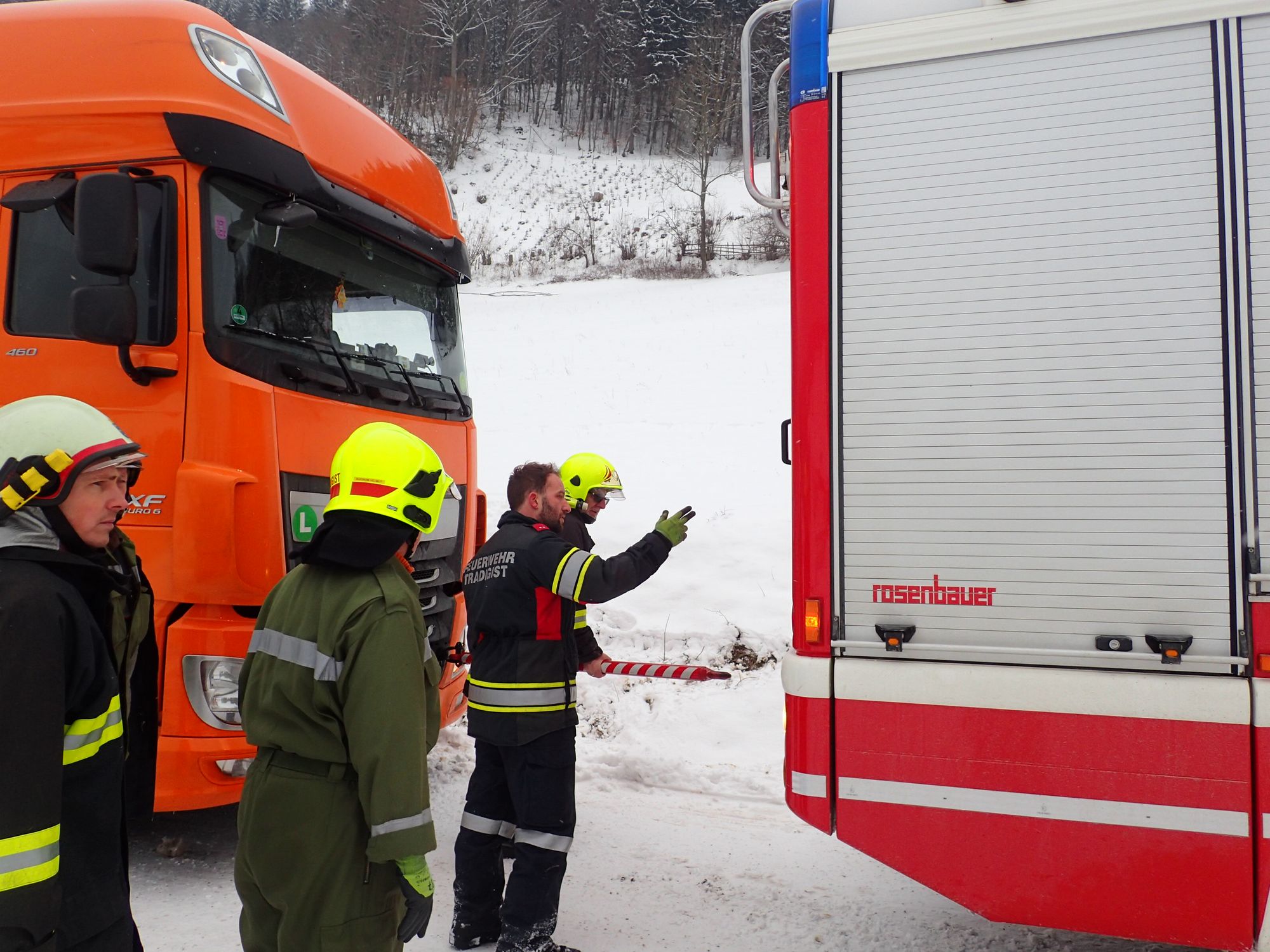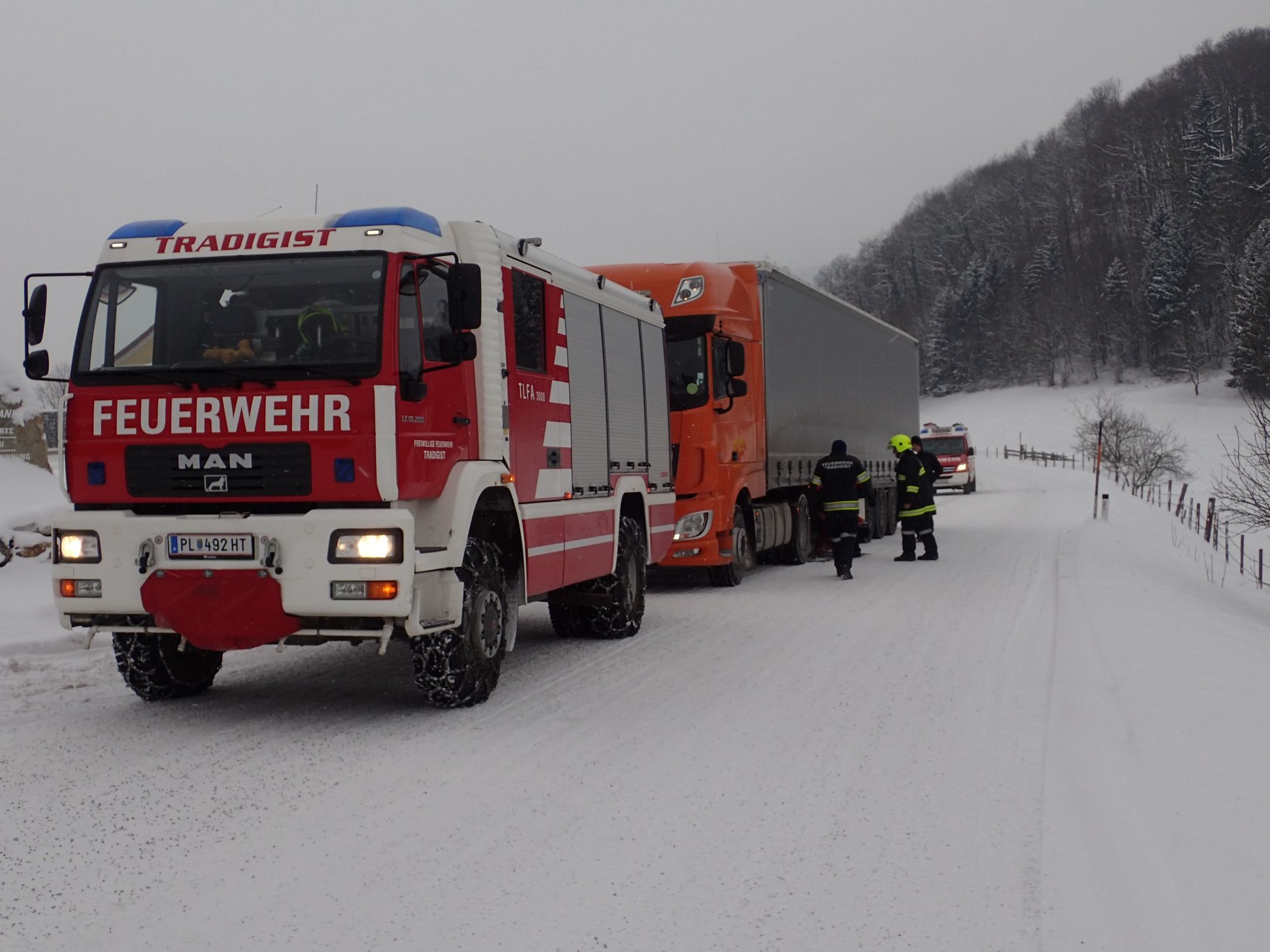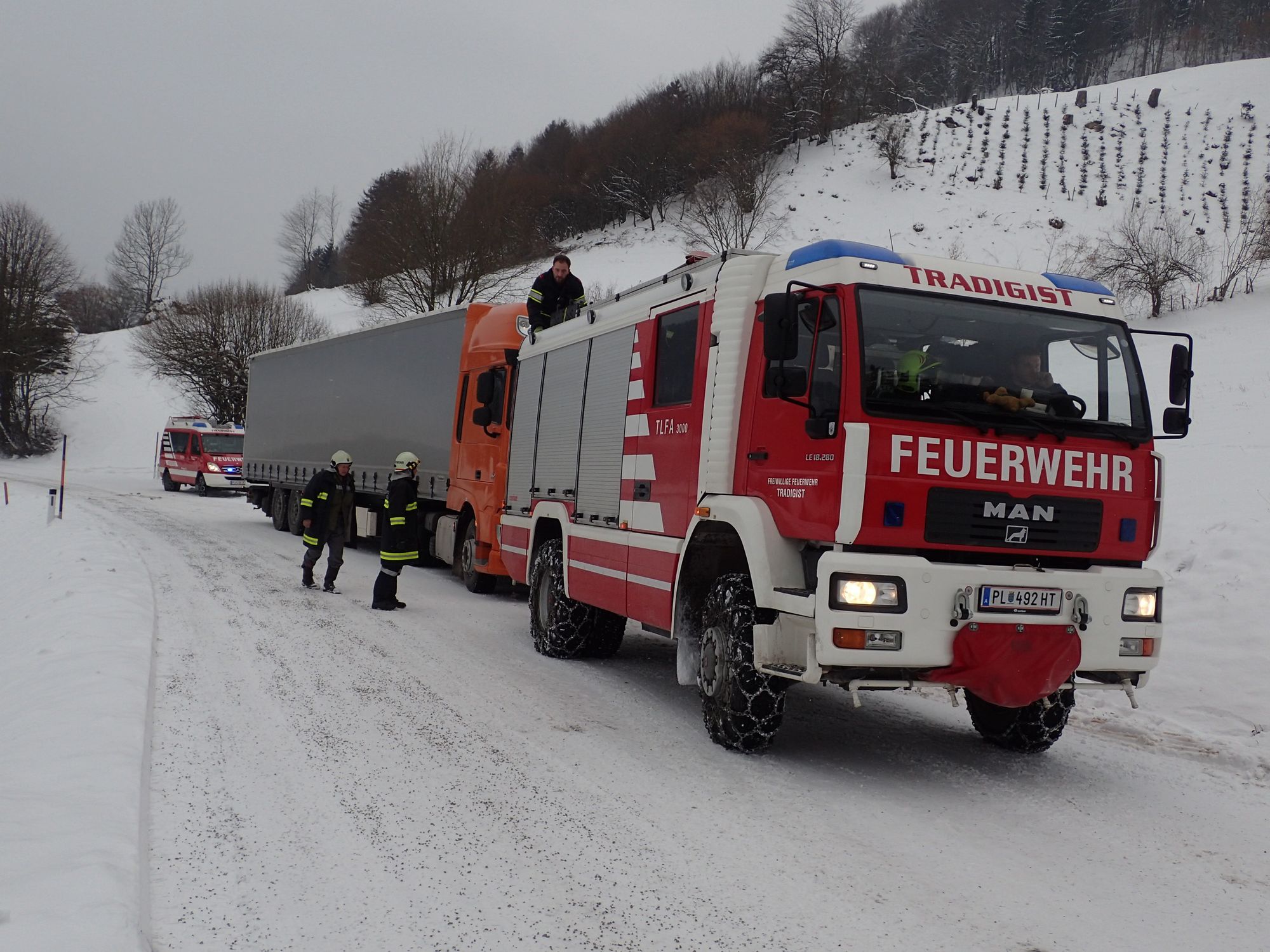 Ein LKW war auf der schneeglatten Fahrbahn hängengeblieben. Mittels Schleppstange zogen wir das Fahrzeug bis zur Ausfahrt Gaiseben, und unterstützen ihn beim Anlegen der Schneeketten.