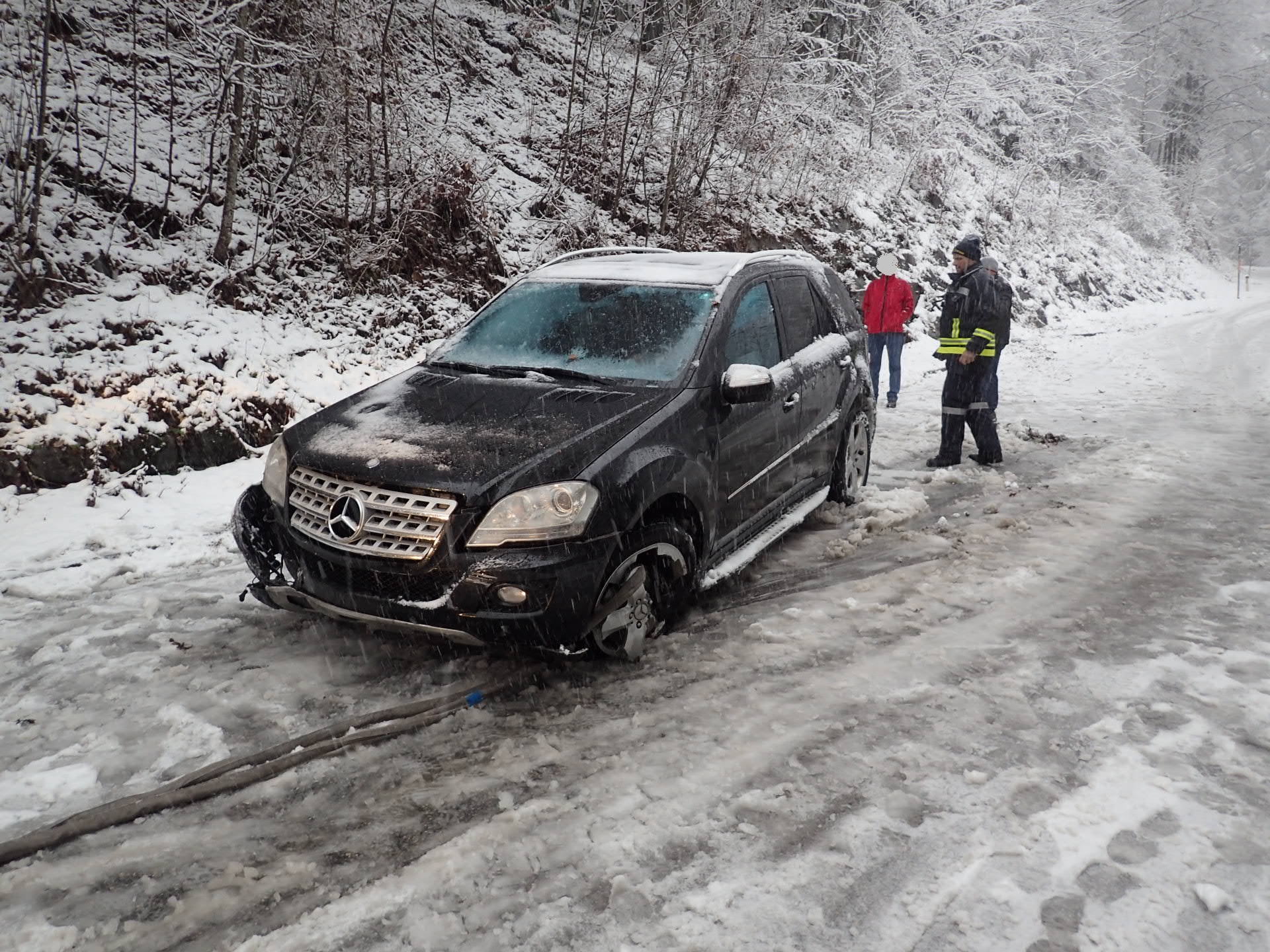 Ein PKW kam beim bergabfahren auf der schneeglatten Fahrbahn ins Rutschen und kam von der Fahrbahn ab, wodurch das Fahrzeug beschädigt wurde. Da der PKW nicht mehr fahrtüchtig war, musste er abgeschleppt werden.