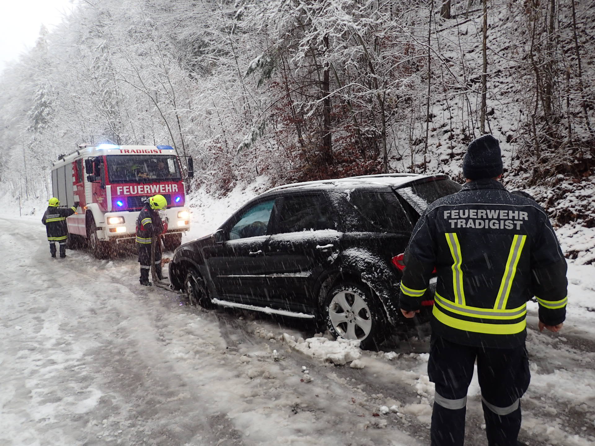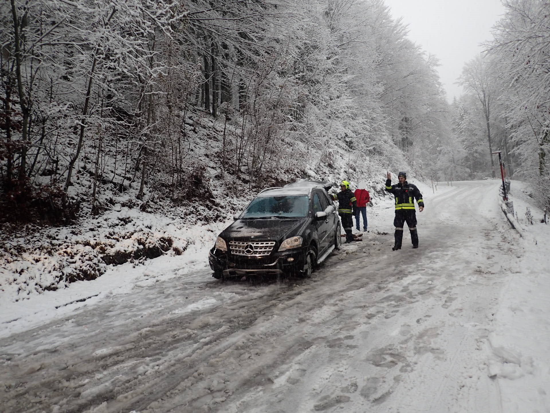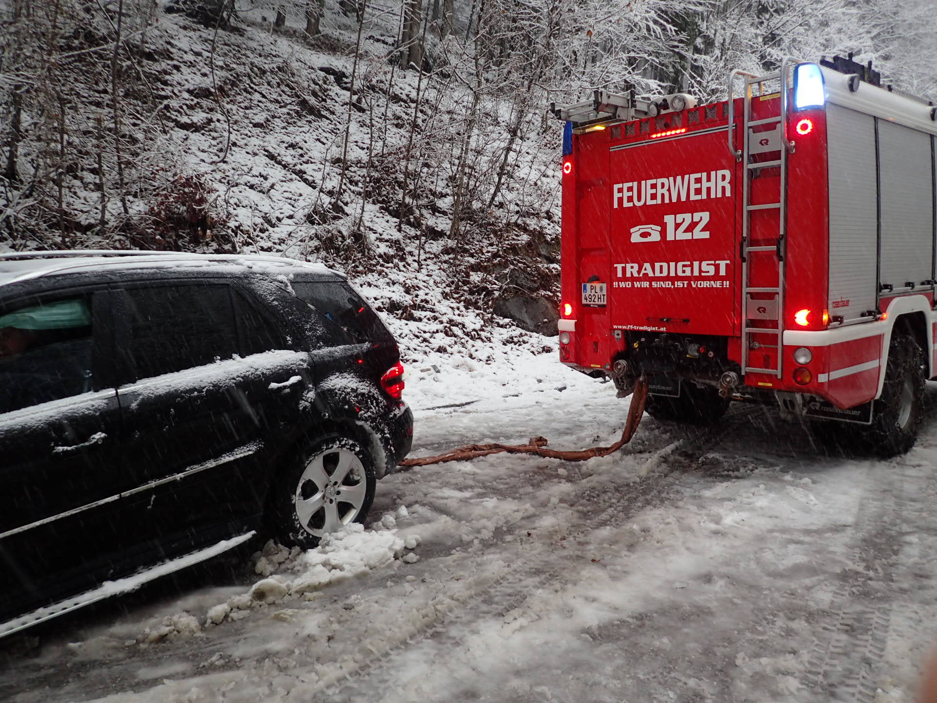 Beim Eintreffen am Unfallort fanden wir noch einen weiteren hängengebliebenen PKW vor, welcher auf der rutschigen Fahrbahn bergauf unterwegs gewesen war. Das Fahrzeug wurde auf den Morigrabensattel gezogen, von wo aus die Fahrt fortgeführt werden konnte.