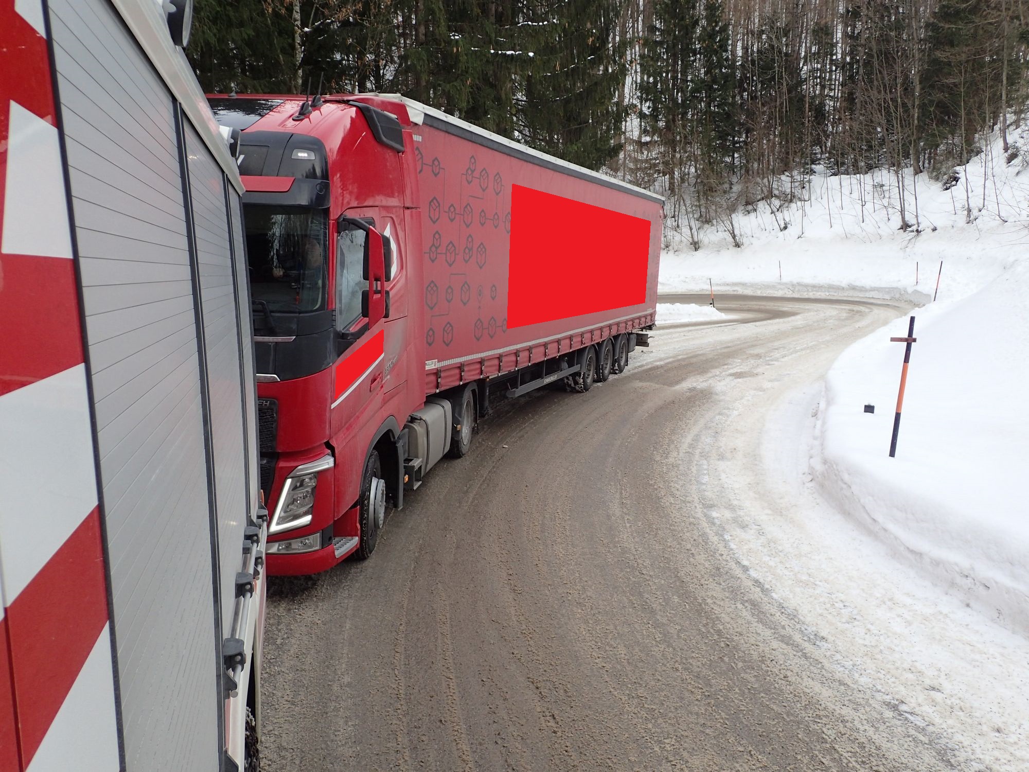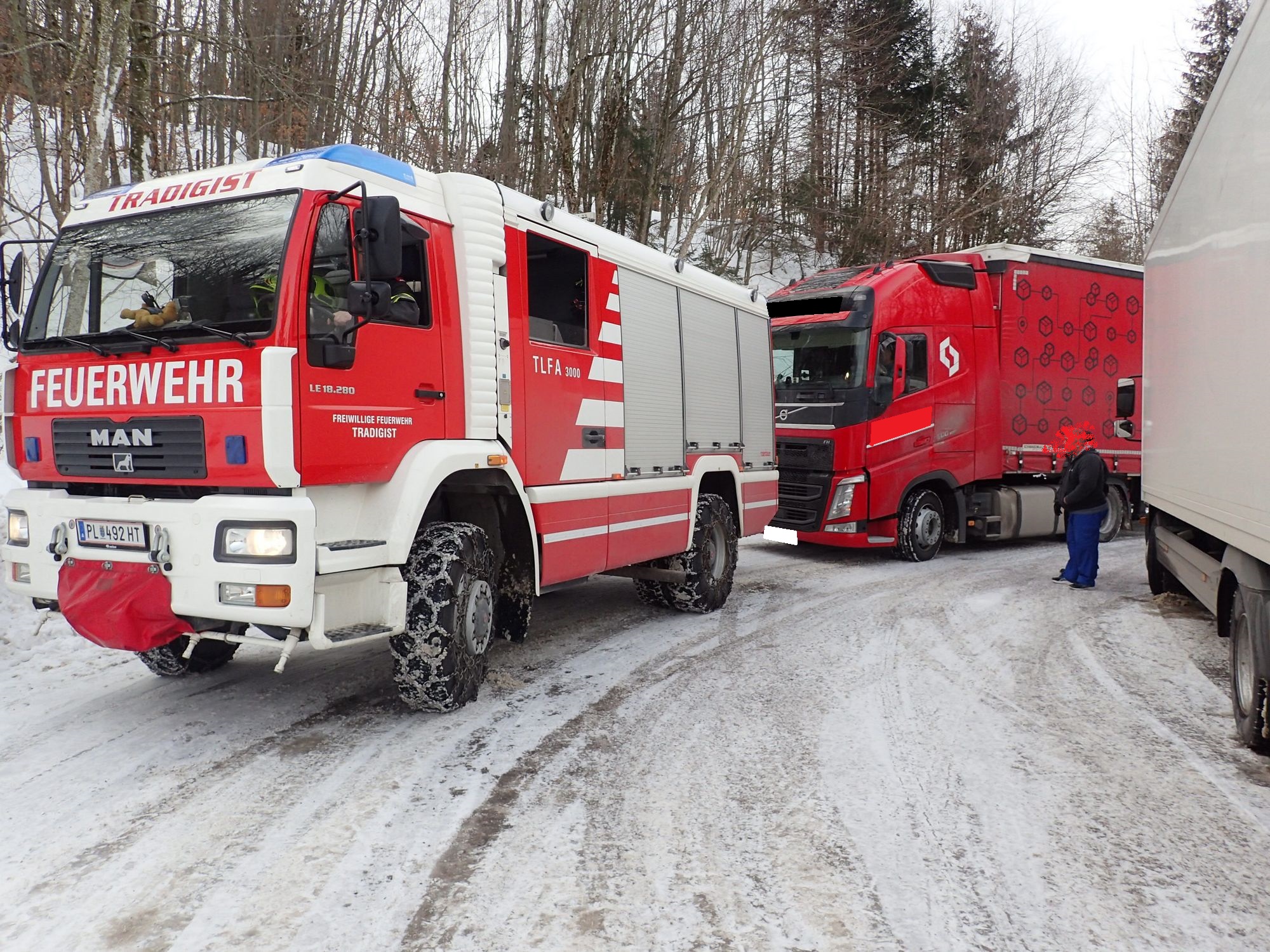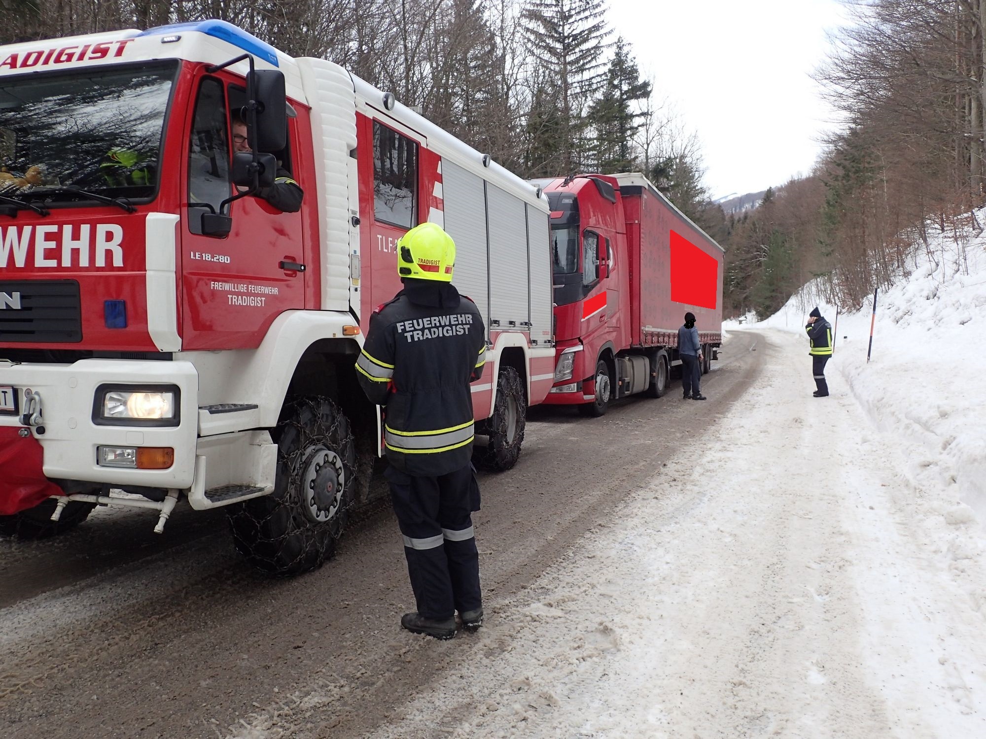 Mittels TLFA und Schleppstange wurde der LKW auf den Morigraben-Sattel gezogen. Dort stand bereits ein 2. LKW-Zug, dessen Fahrer dringend Unterstützung beim Anlegen der Schneeketten benötigte. Es wurde dann an beiden Zugfahrzeugen mitgeholfen die Ketten anzulegen.