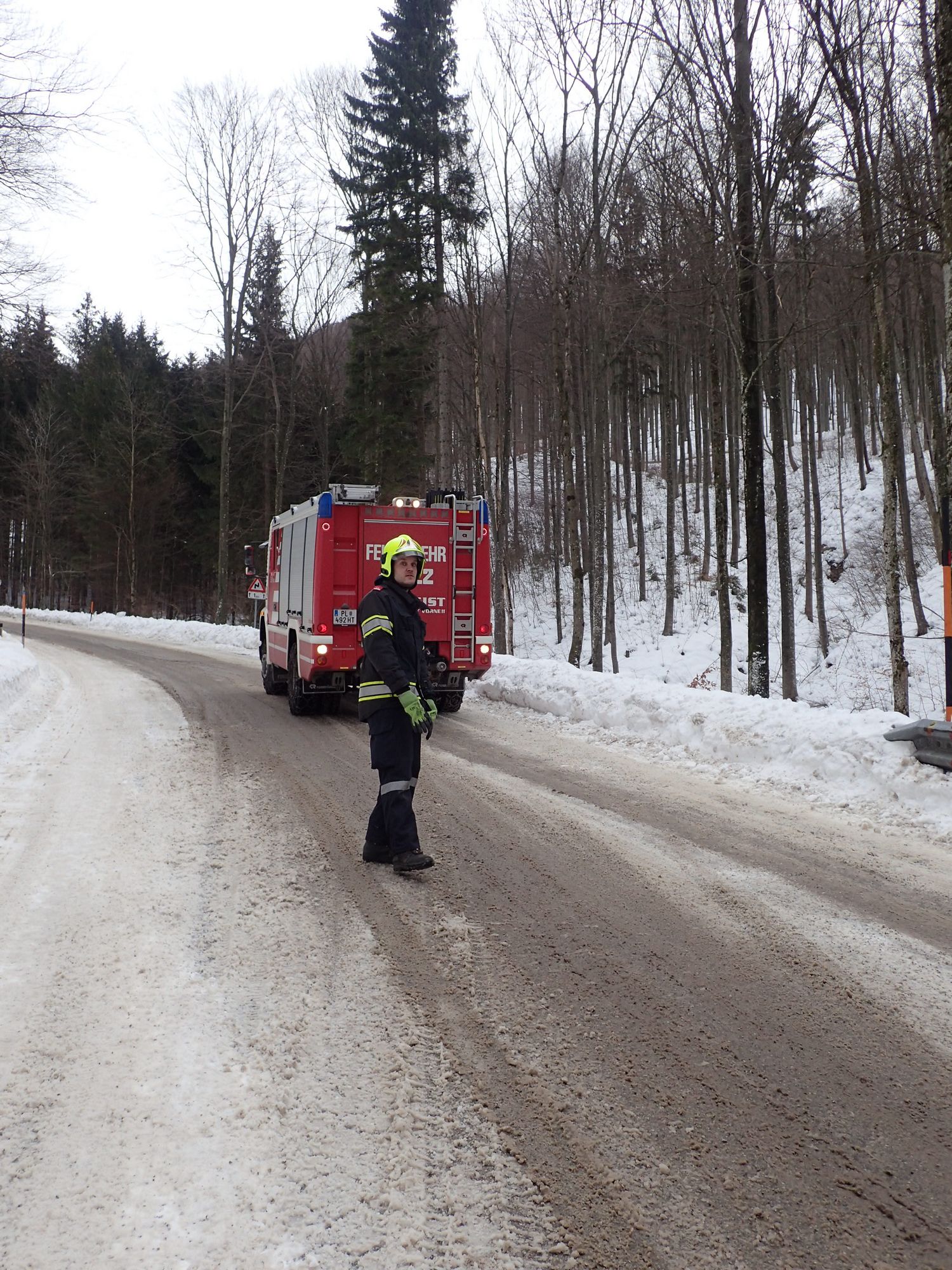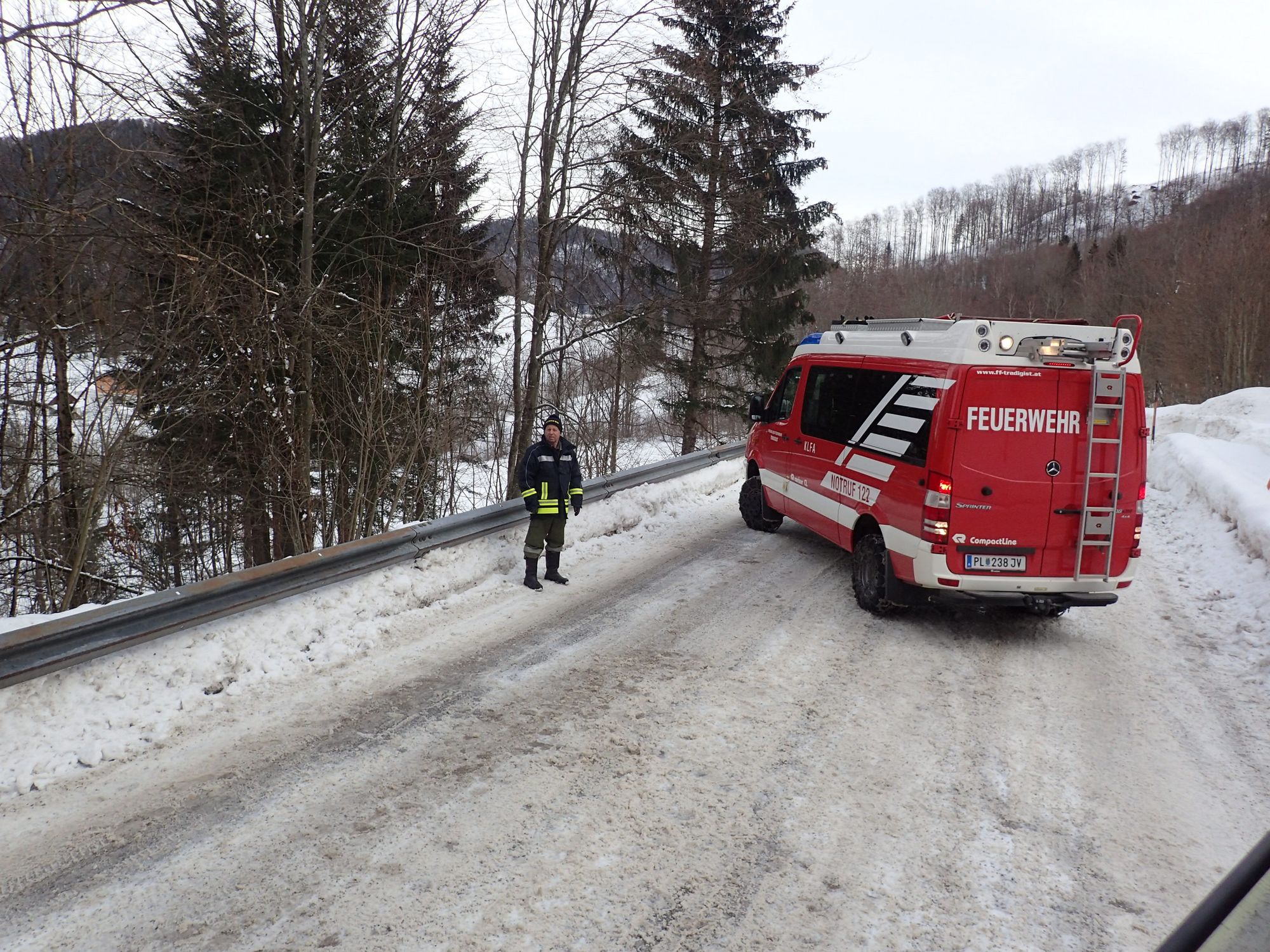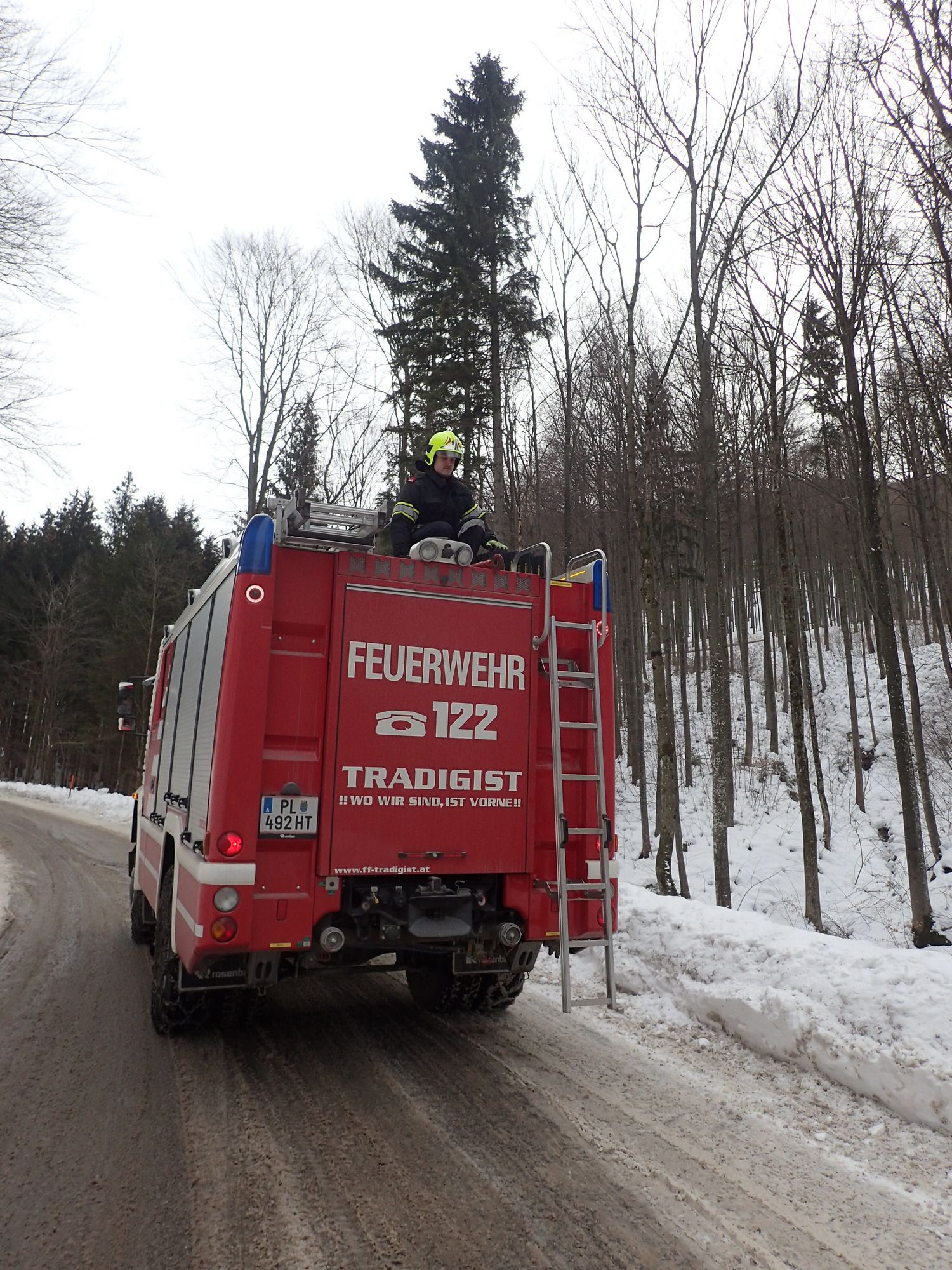Mittels TLFA und Schleppstange wurde der LKW auf den Morigraben-Sattel gezogen. Dort stand bereits ein 2. LKW-Zug, dessen Fahrer dringend Unterstützung beim Anlegen der Schneeketten benötigte. Es wurde dann an beiden Zugfahrzeugen mitgeholfen die Ketten anzulegen.