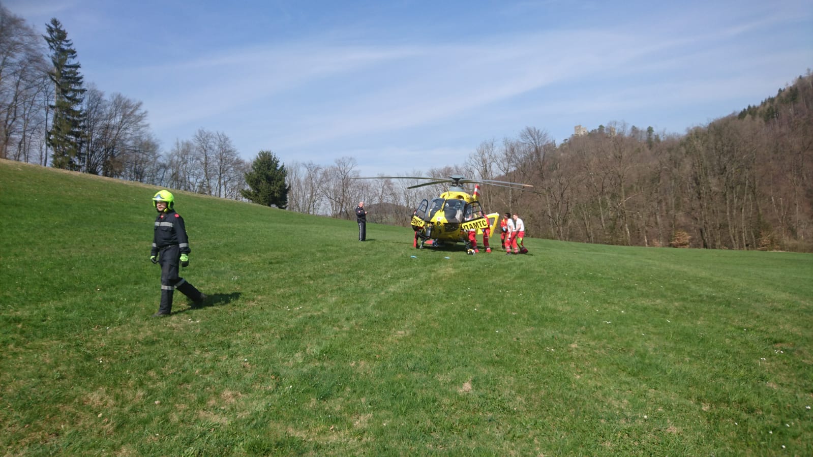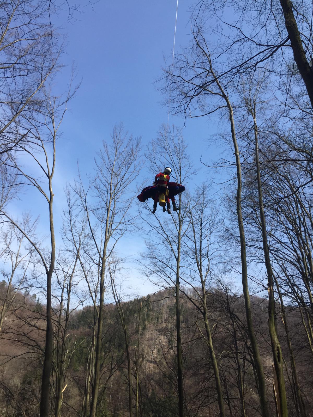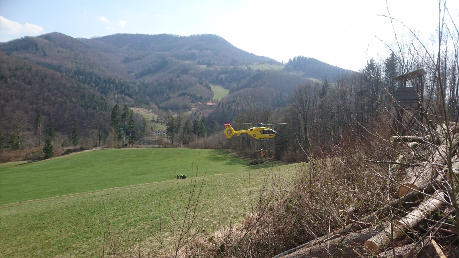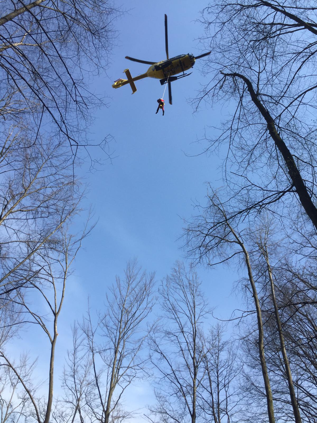 Im unwegsamen Gelände hatte sich ein Forstarbeiter verletzt und mußte mittels Seilwinde des alarmierten Notarzthubschraubers gerettet und ausgeflogen werden.
