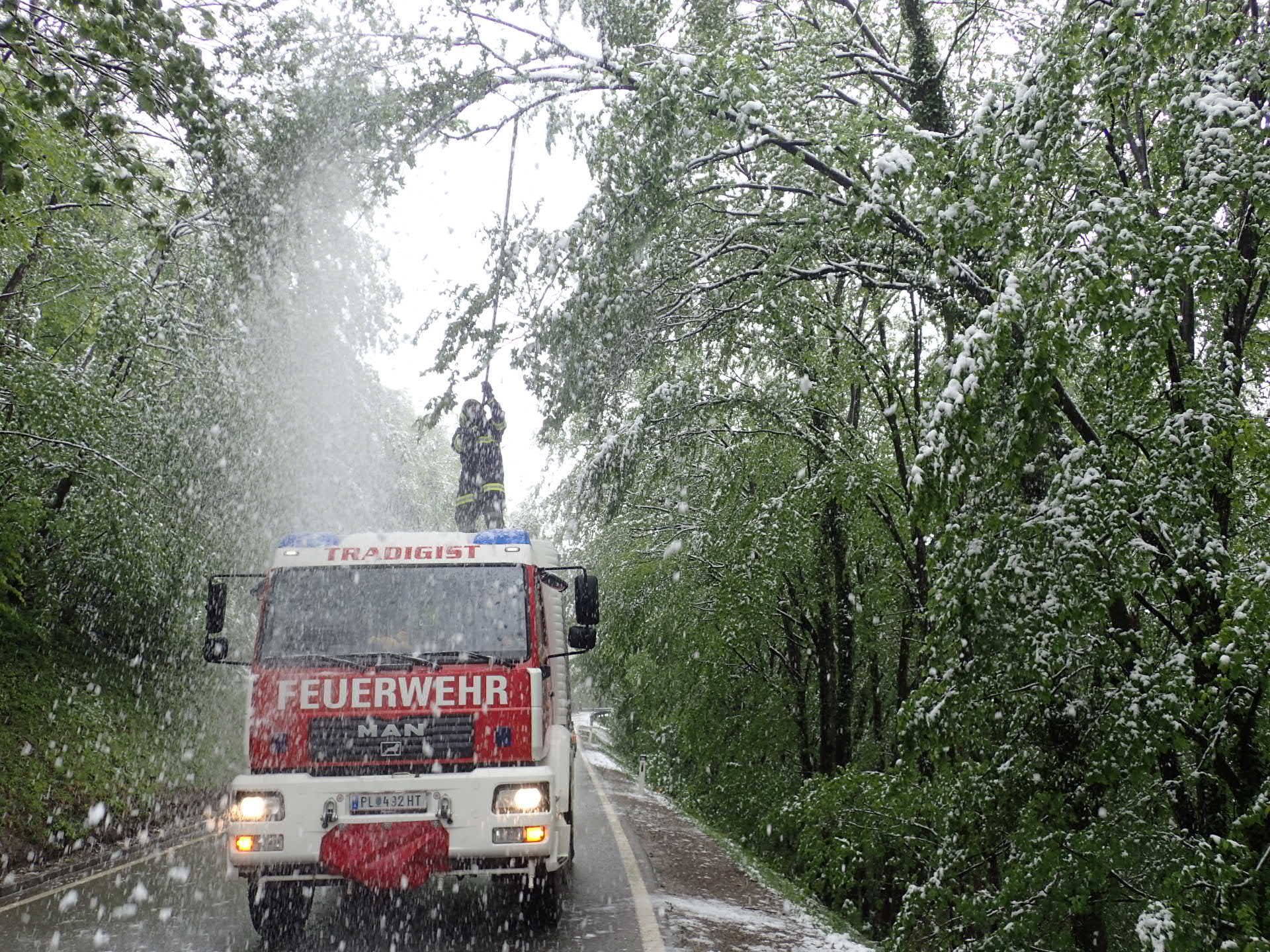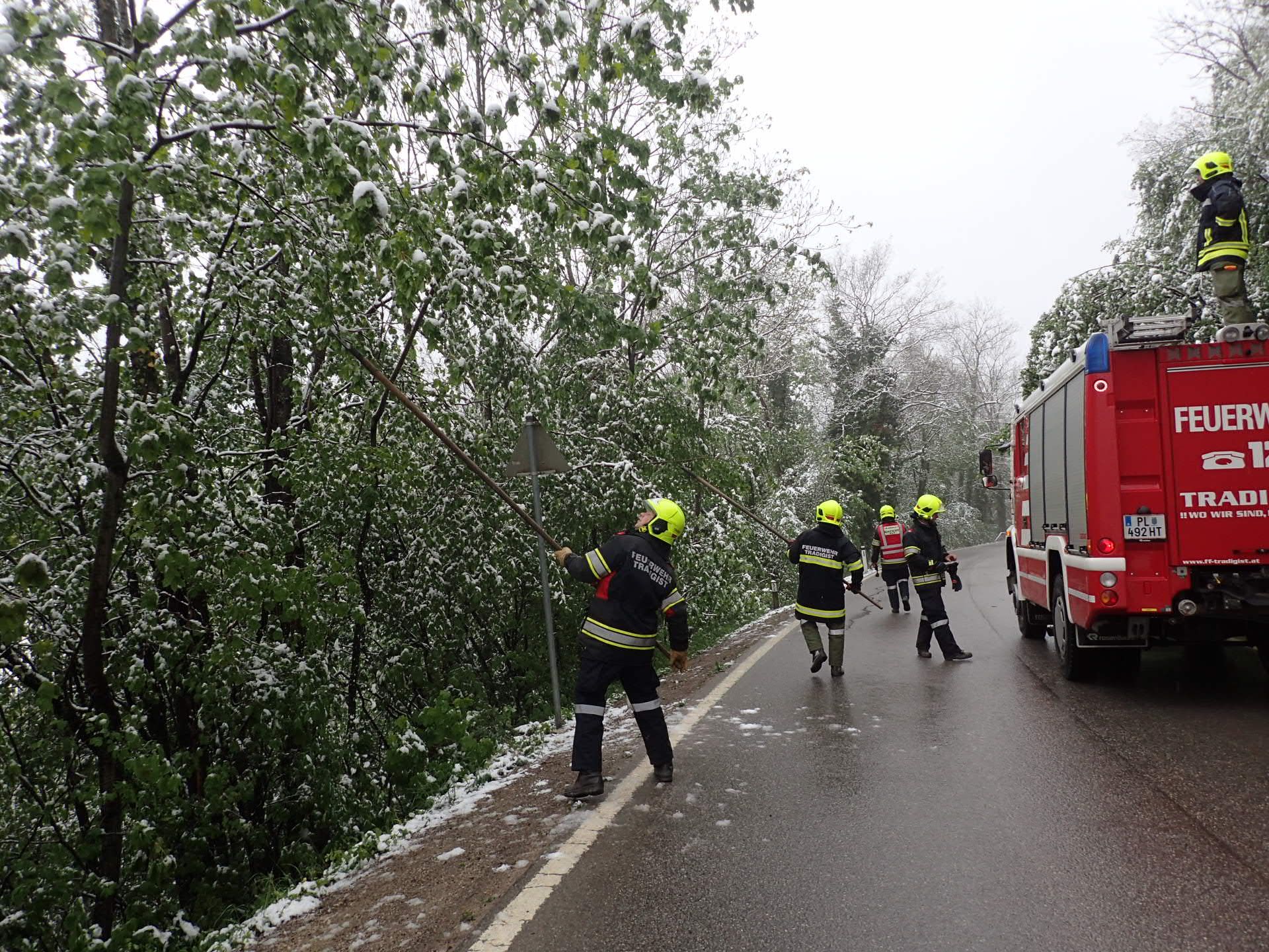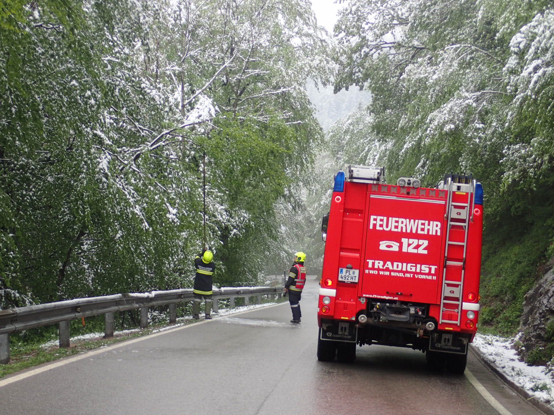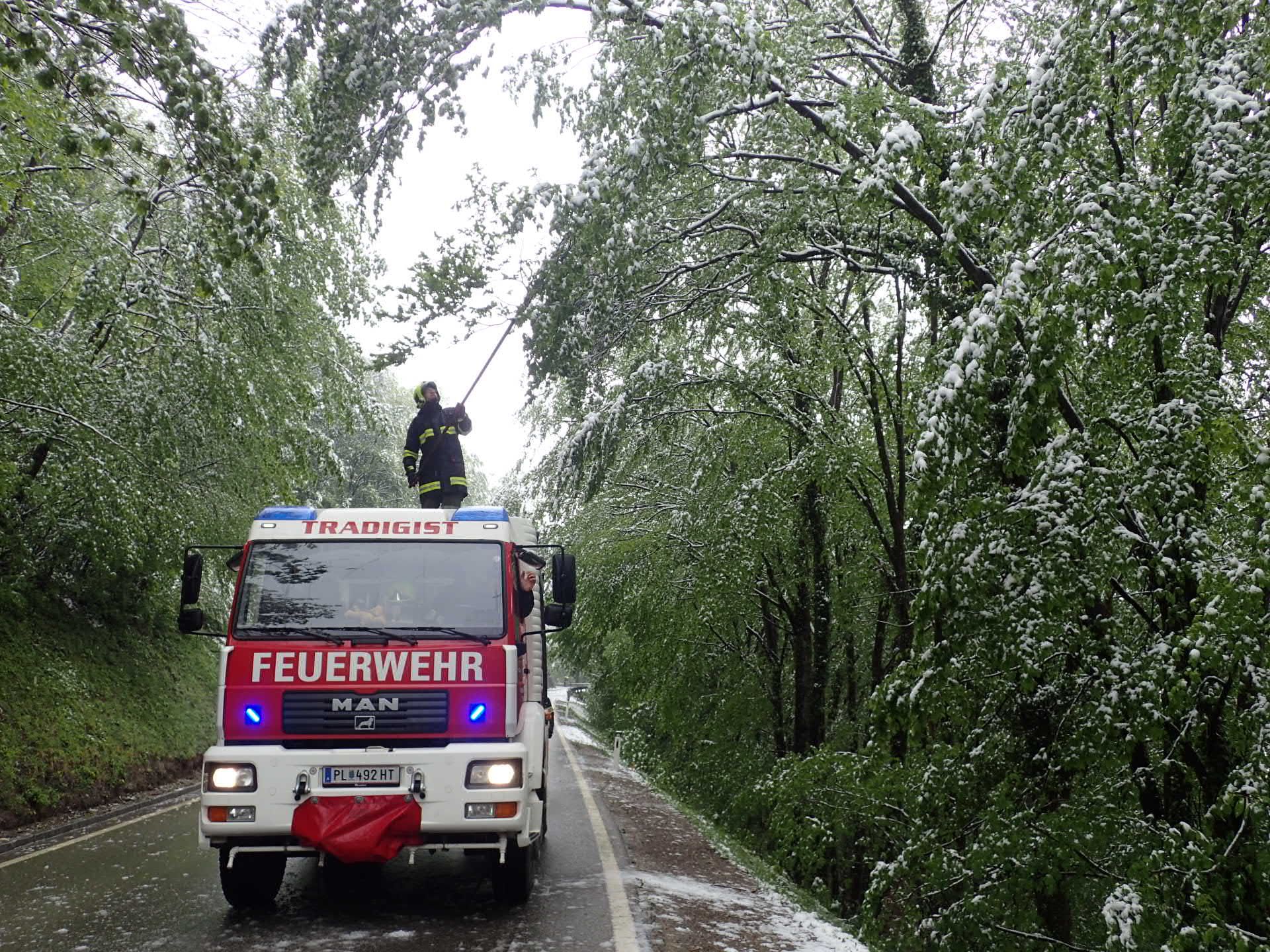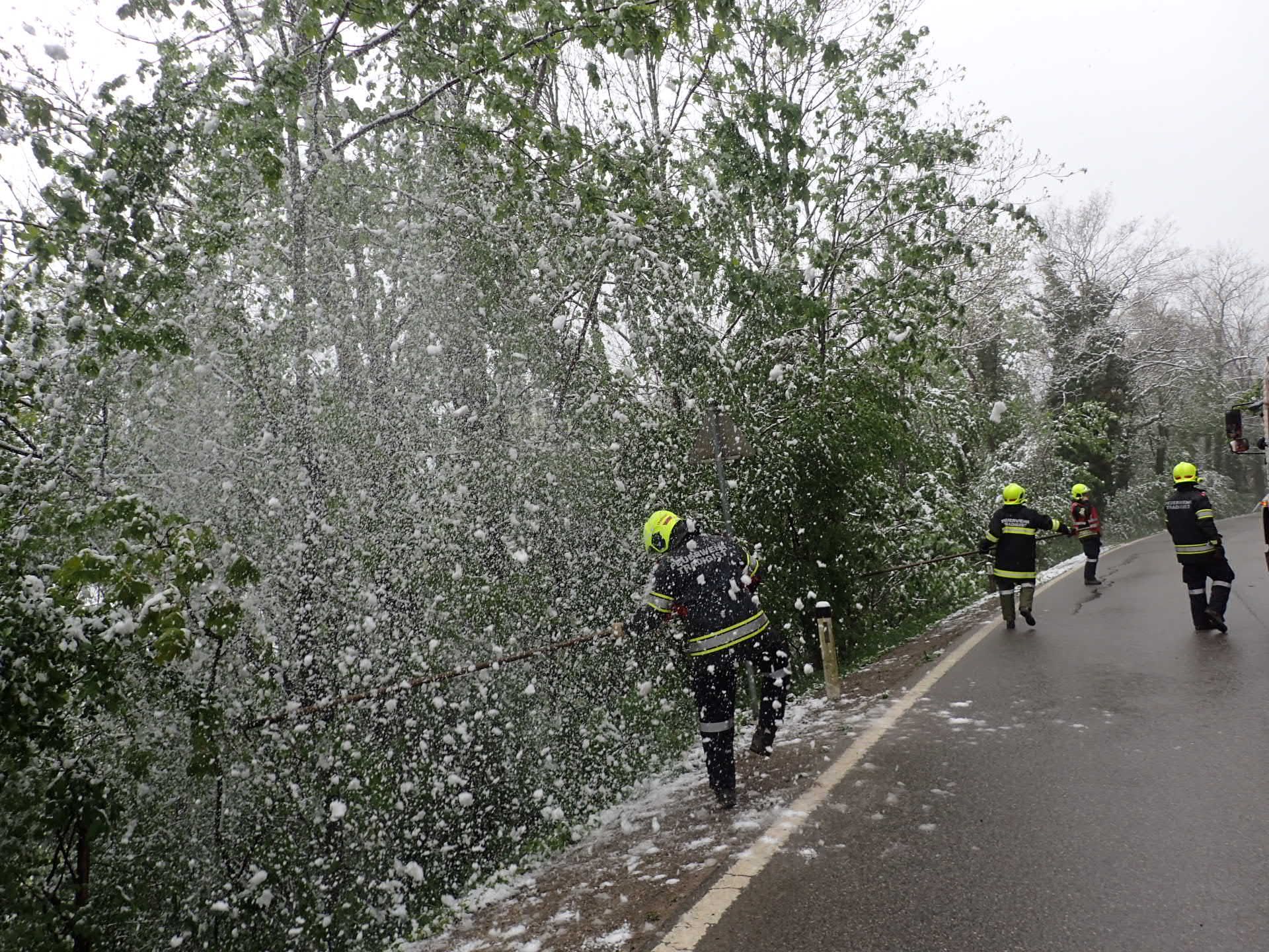Vorort stellten wir fest, dass es sich um meherere durch die Schneelast gebeugte Bäume handelte, welche zum Zeitpunkt der Alarmierung weit Richtung Fahrbahn herunterhingen. Mittels Feuerhaken wurden die Bäume vom Schnee befreit.