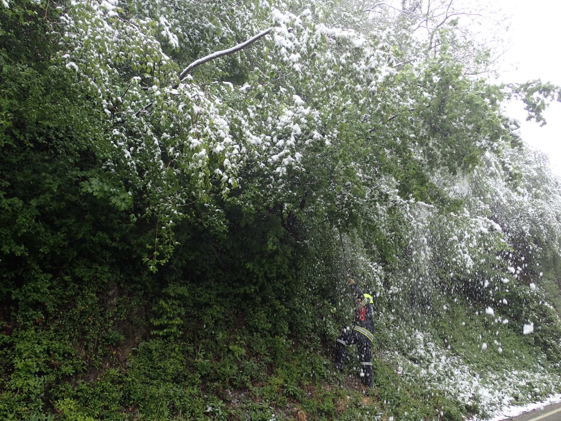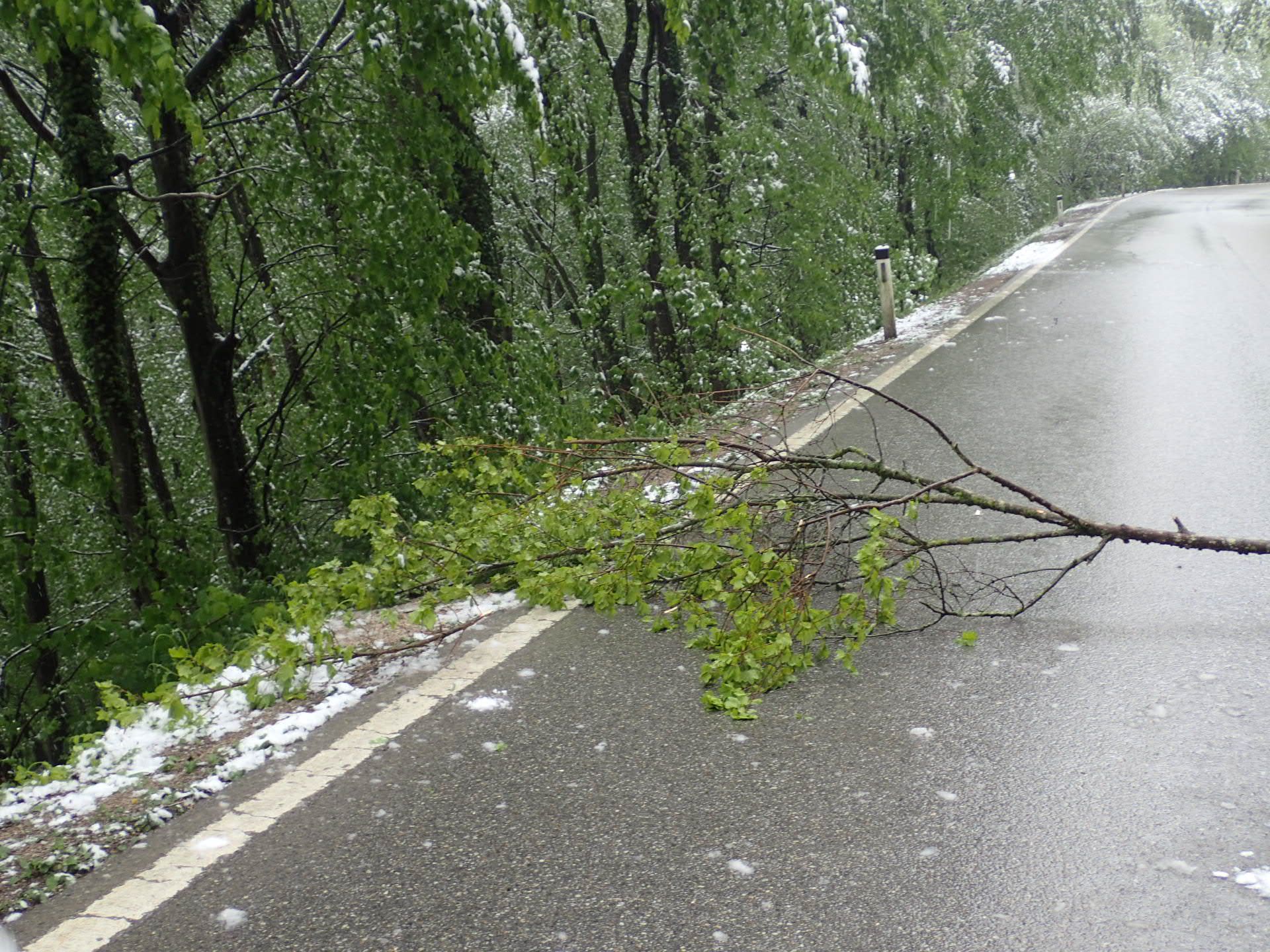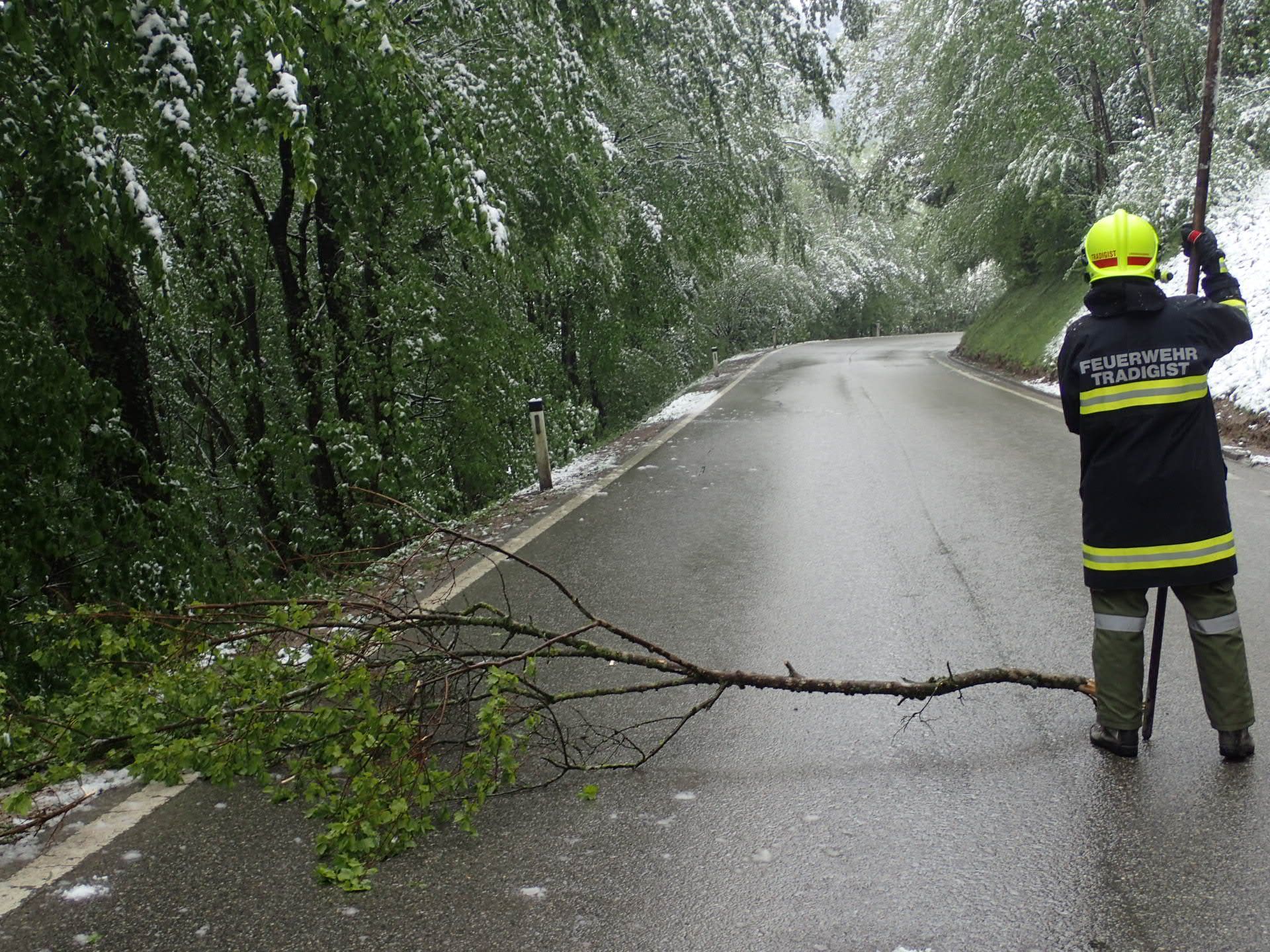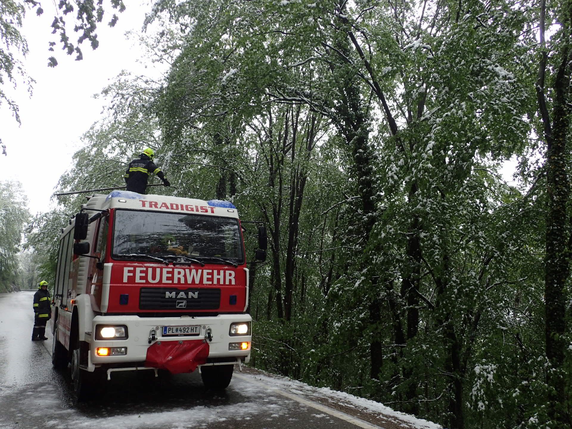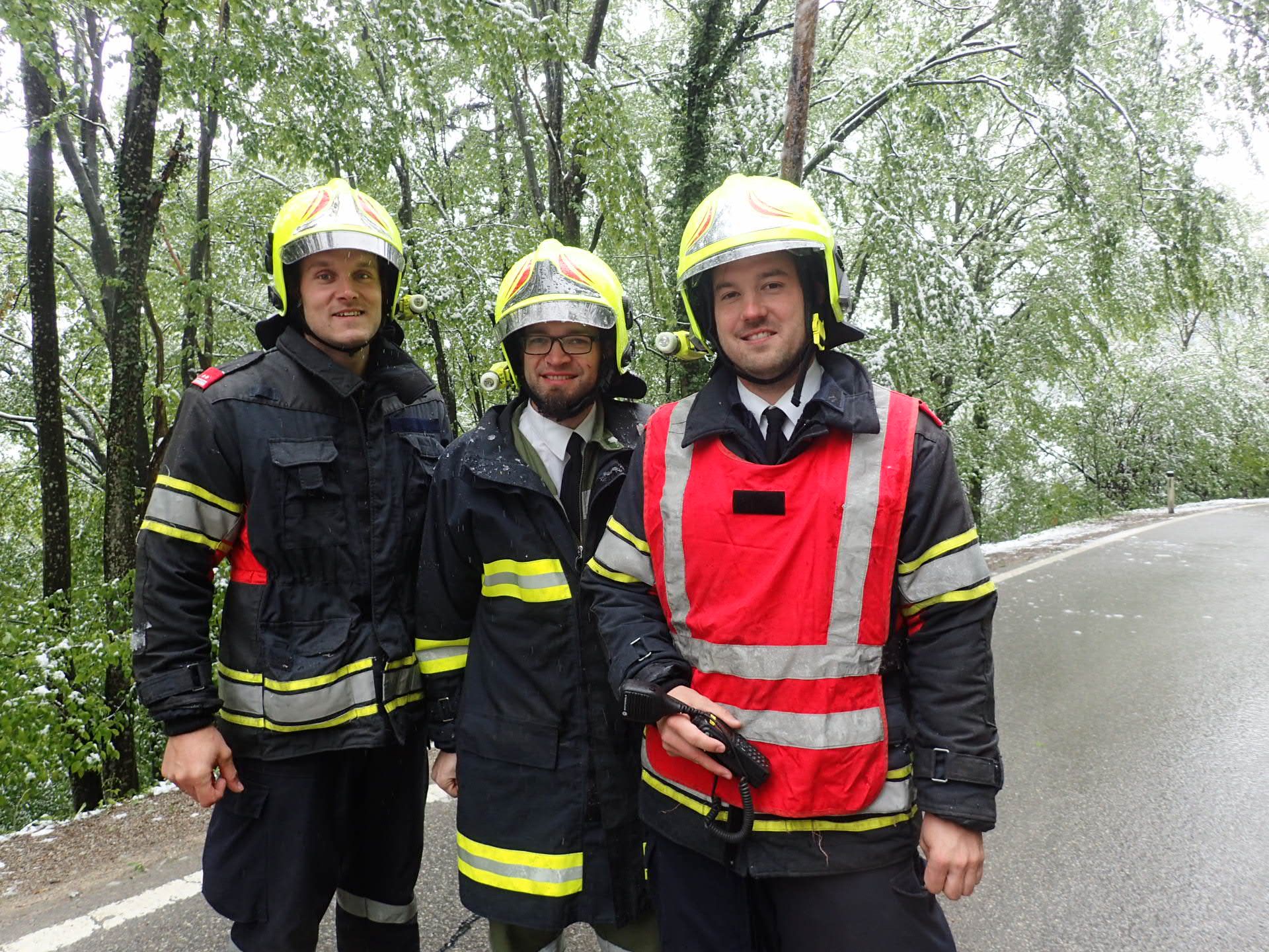 Vorort stellten wir fest, dass es sich um meherere durch die Schneelast gebeugte Bäume handelte, welche zum Zeitpunkt der Alarmierung weit Richtung Fahrbahn herunterhingen. Mittels Feuerhaken wurden die Bäume vom Schnee befreit.