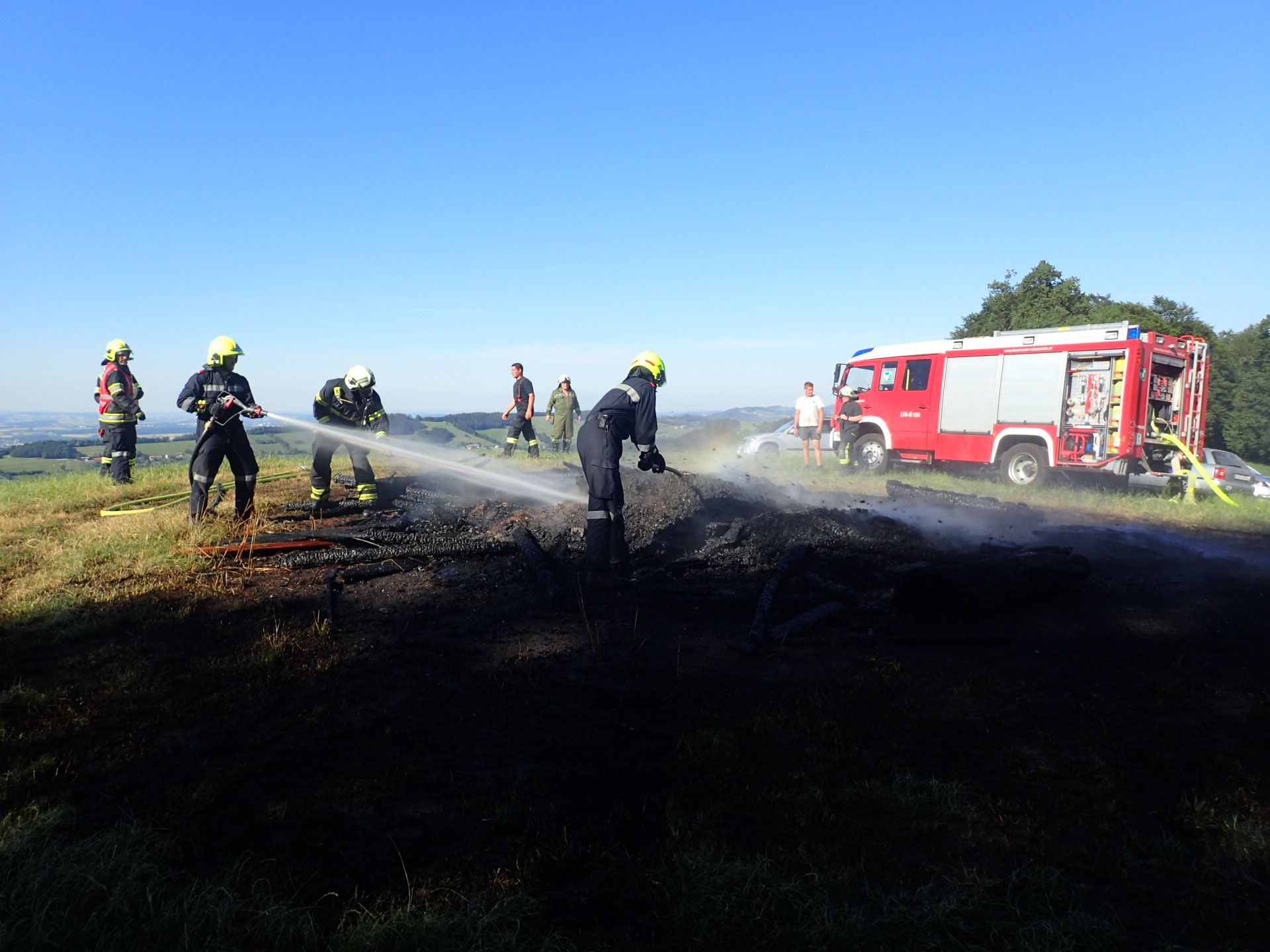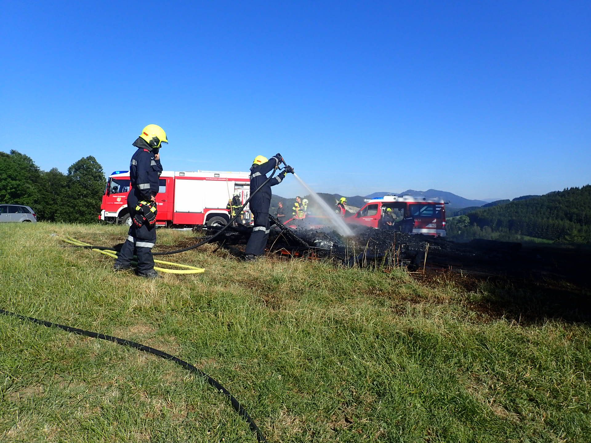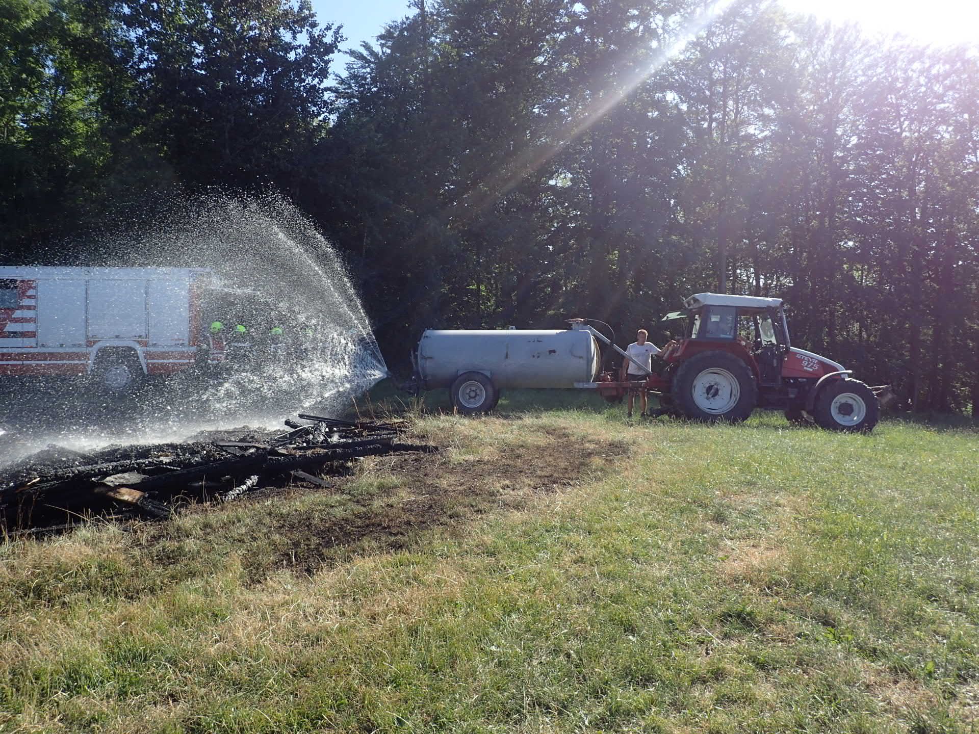 Die Feuerwehr Rabenstein hatte bereits mit den Löscharbeiten begonnen und ein benachbarter Landwirt kam mit seinem Traktor und Güllefass mit Wasser auch zu Hilfe.