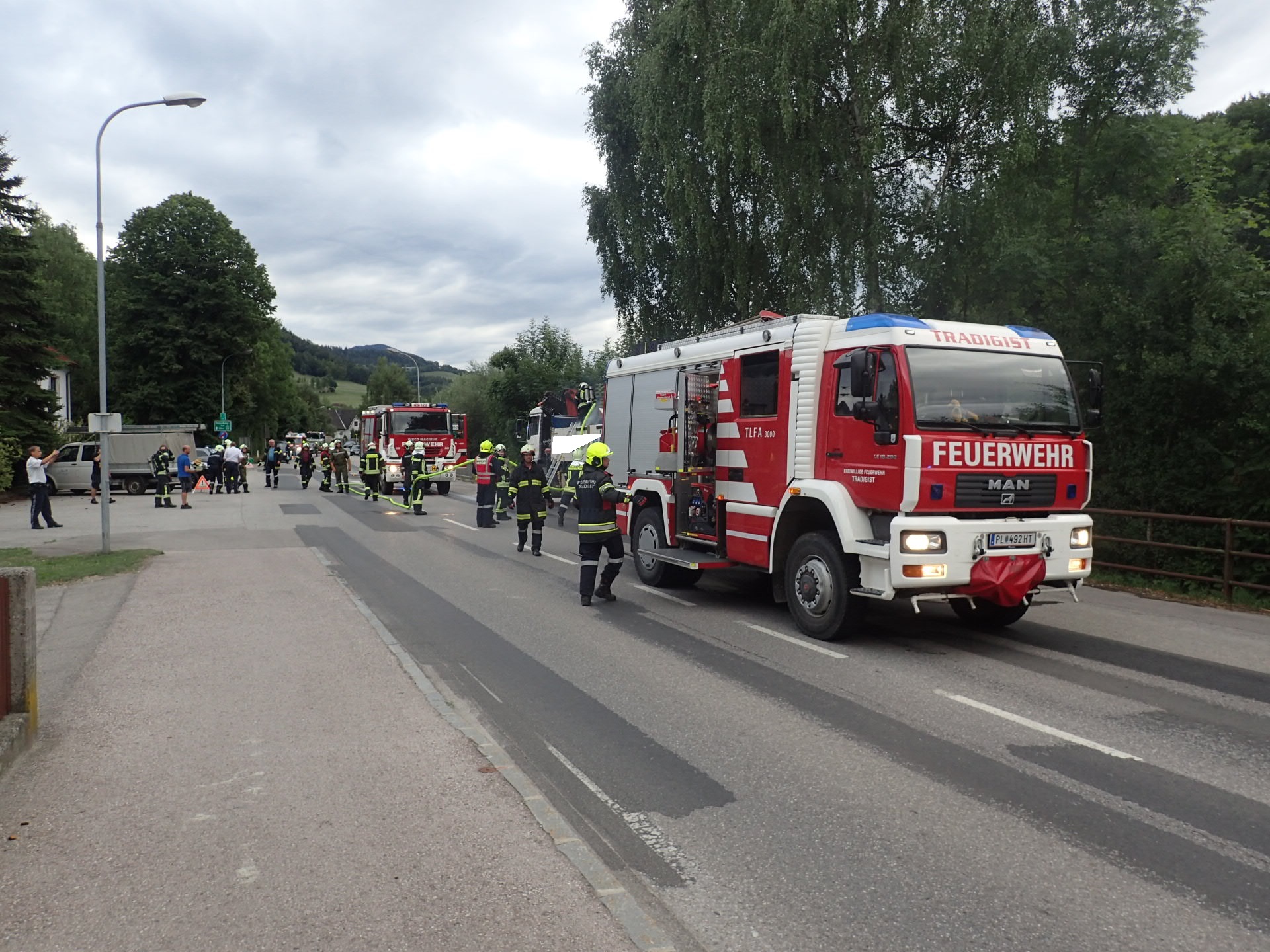 Bei der Ankunft am Einsatzort stellten wir eine starke Rauchentwicklung auf der Ladefläche des LKWs, jedoch keine Flammen fest. Es wurde sofort mit dem HD-Rohr die Brand- bzw. Rauchbekämpfung begonnen. Zeitgleich musste die B39 kurz für den vorbeifahrenden Verkehr gesperrt werden.