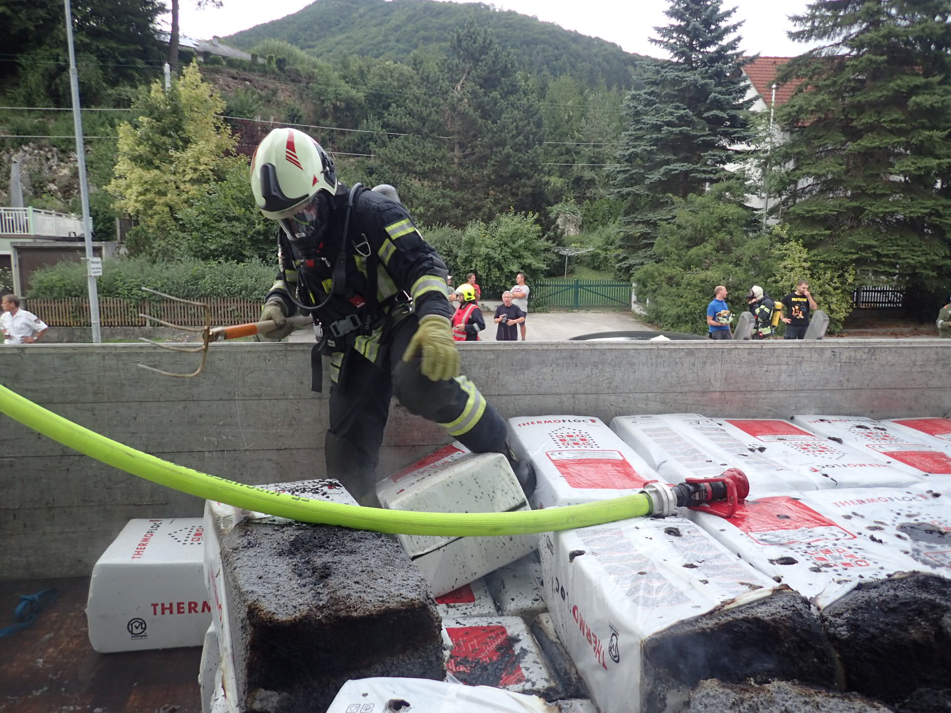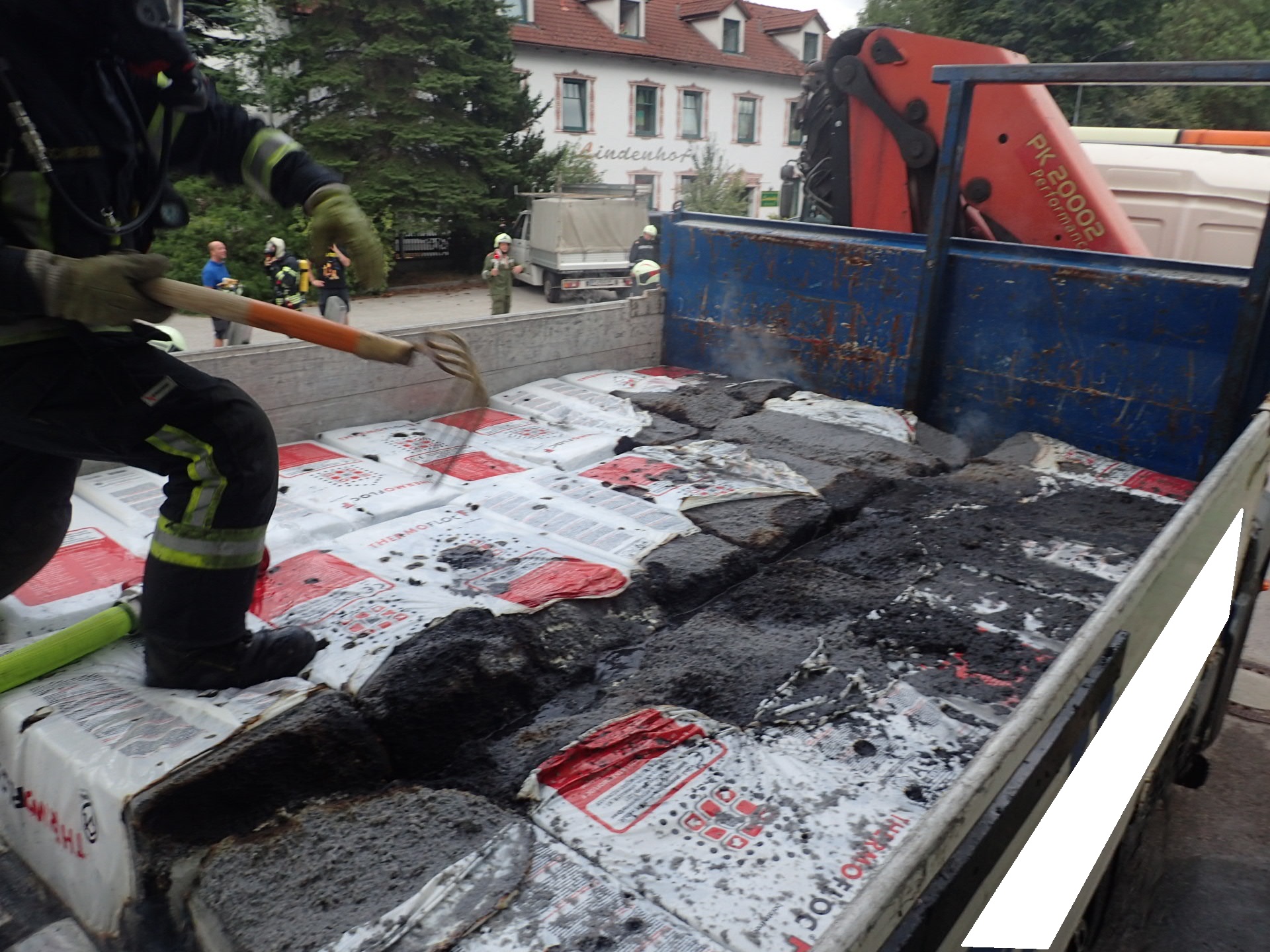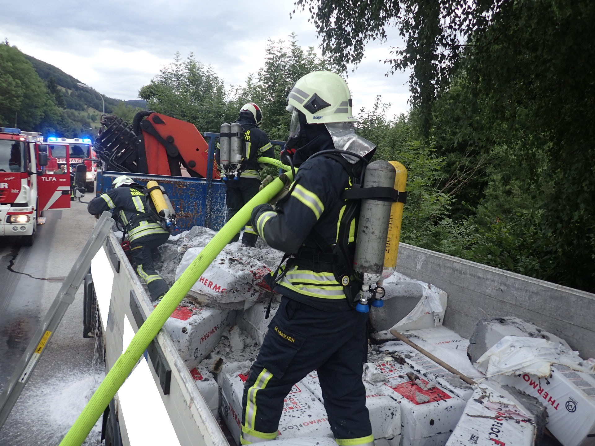 Die Feuerwehr Kirchberg ging parallel mit Atemschutz und Löschschaum zum Einsatz vor. Mit unserer Wärmebildkamera wurde nach möglichen Glutnestern gesucht. Die Cellolose Pakete auf der Ladefläche wurden auseinander geräumt, um den Brandherd zu lokalisieren.