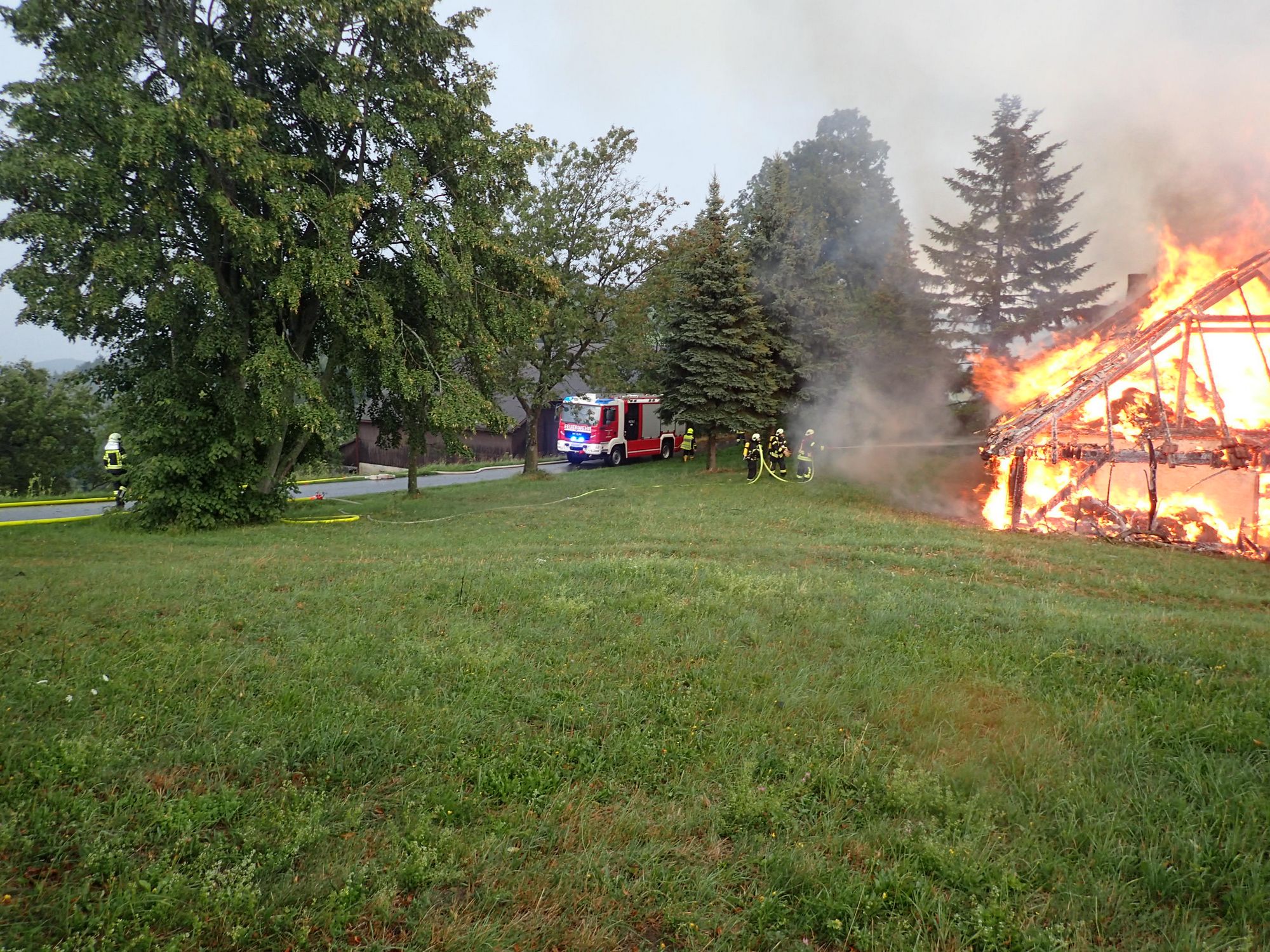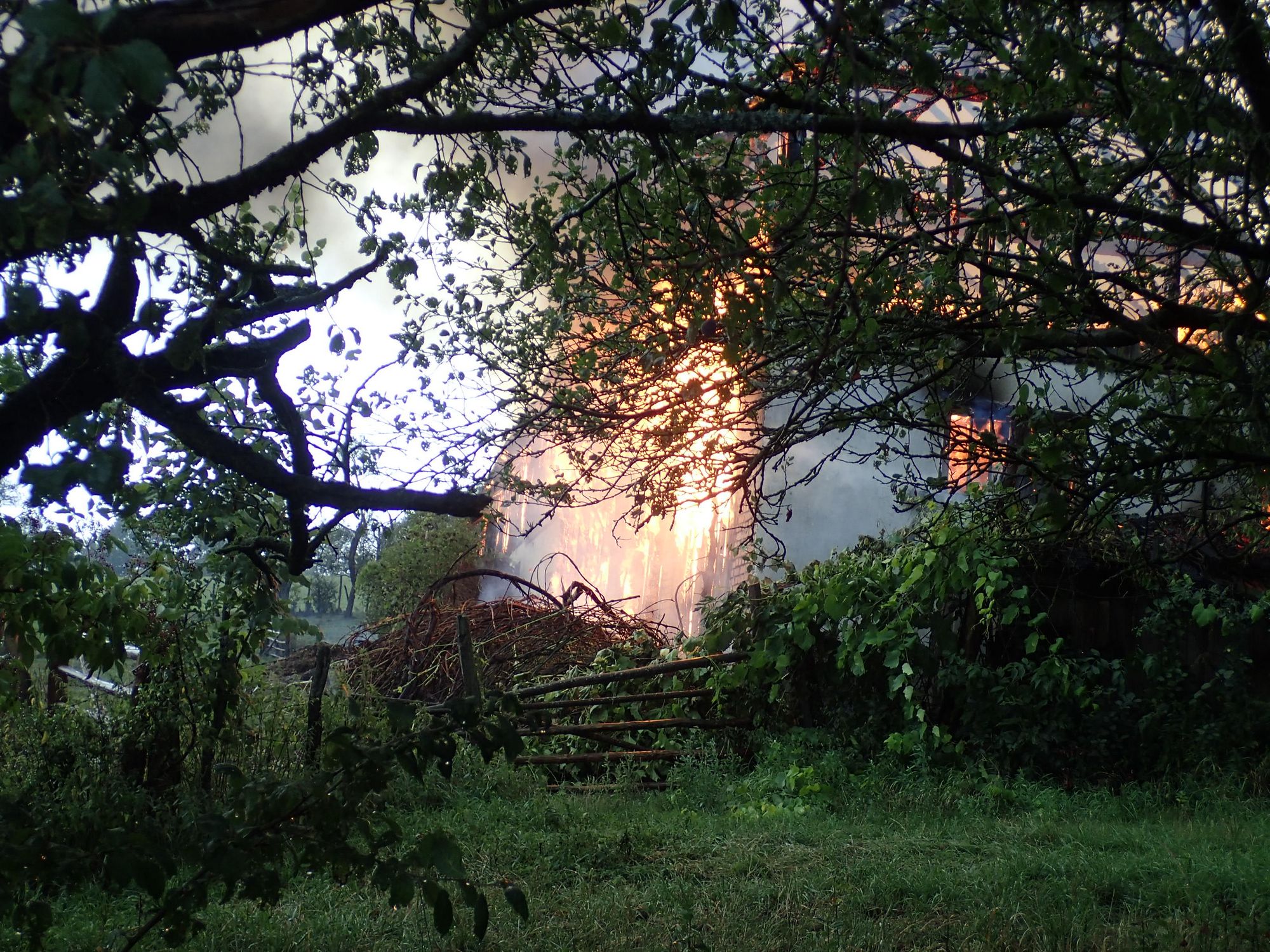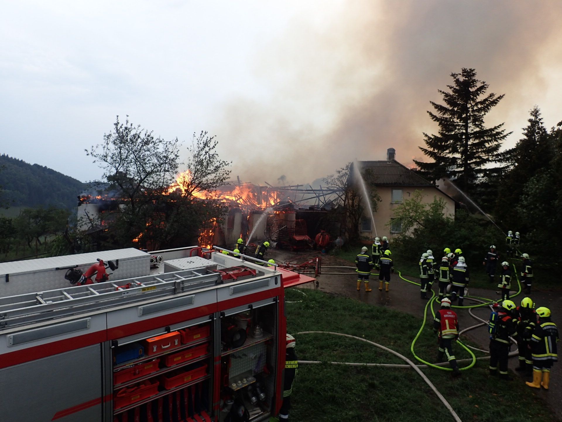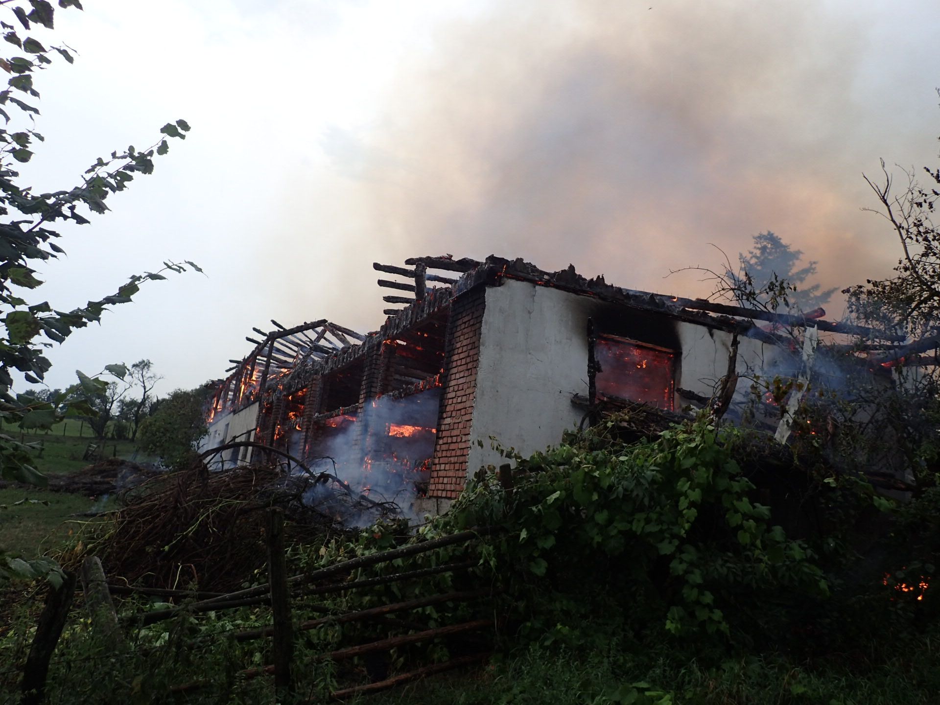 Als wir das Brandobjekt erreichten, stand das Wirtschaftsgebäude des Vierkanters bereits in Vollbrand. Der Einsatz wurde dann erhöht auf einen (B4) "Brand eines landw. Objekts".