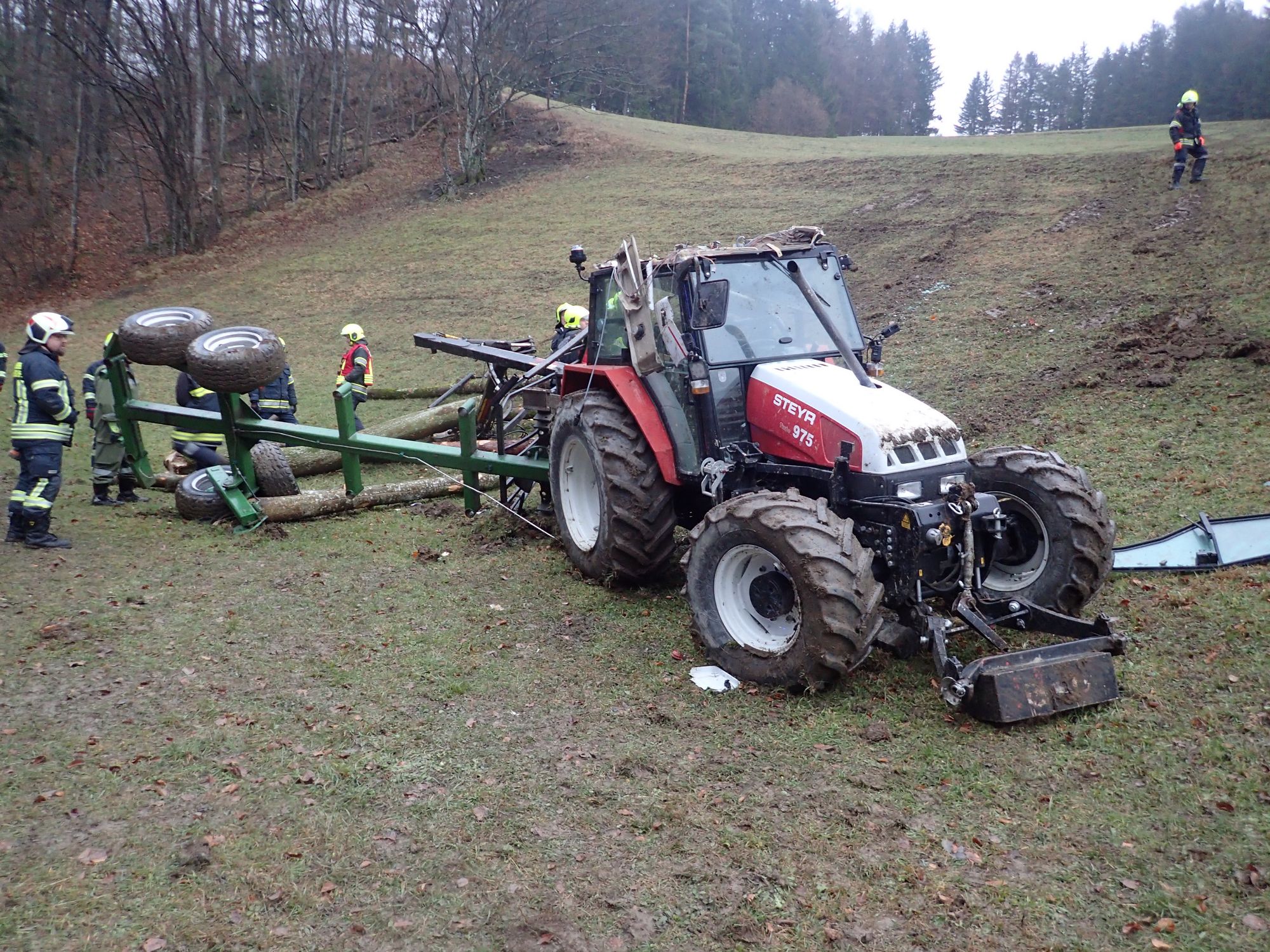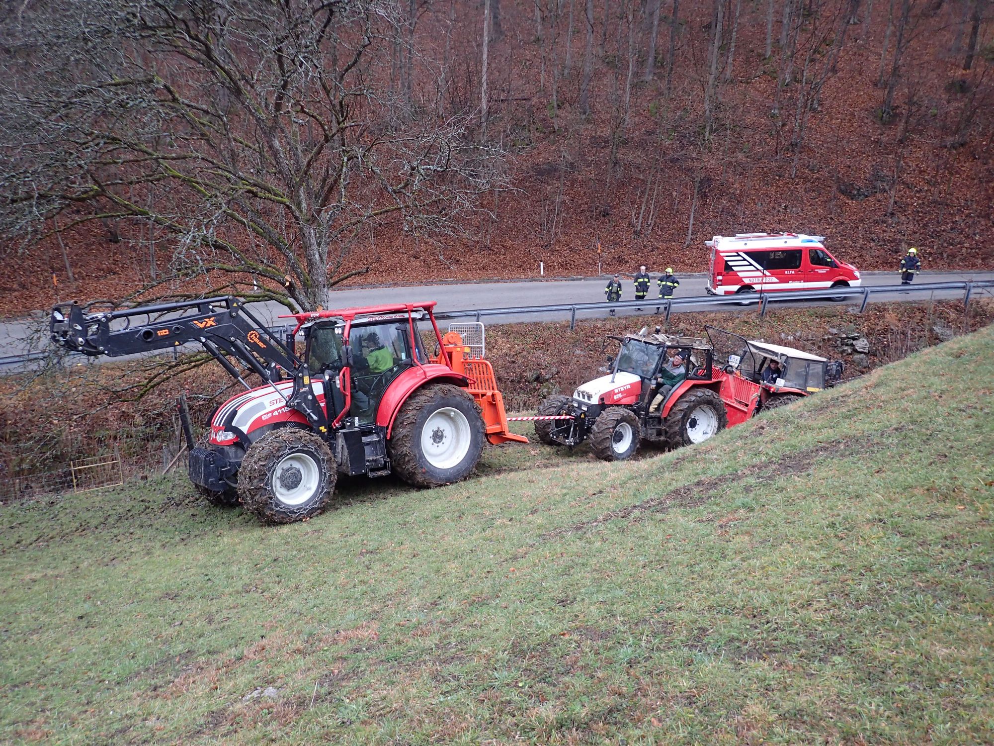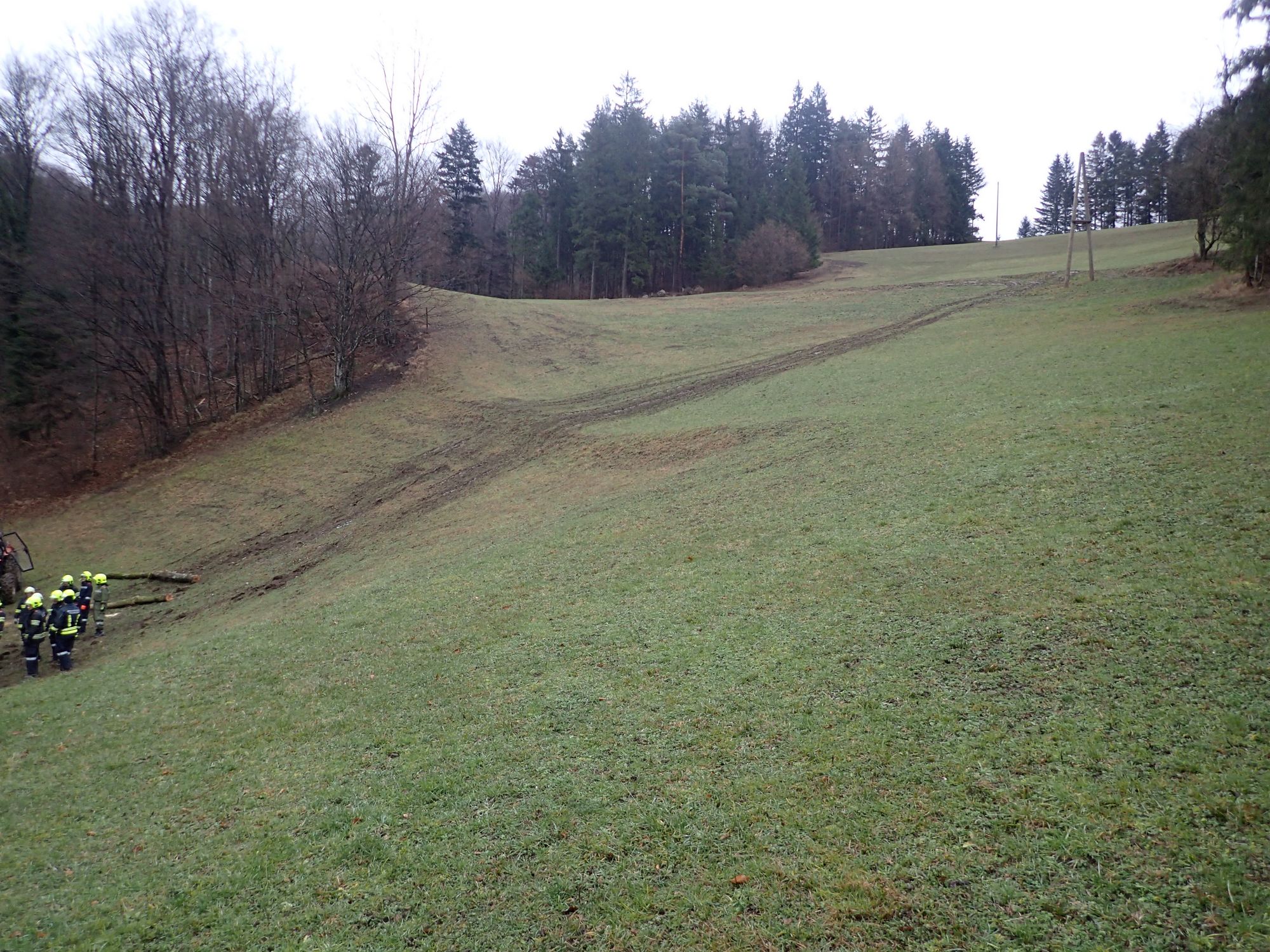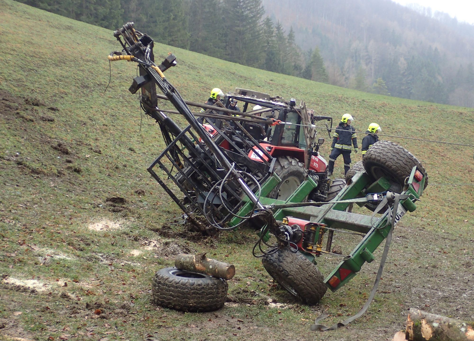 Ein Landwirt und seine Lebensgefährtin waren mit seinem Traktorgespann vom Weg abgekommen und über eine steile Wiese abgerutscht. Der Traktor überschug sich dabei und kam nach dem Unfall wieder auf den Rädern zum Stehen. Der Anhänger blieb auf der Seite liegen.