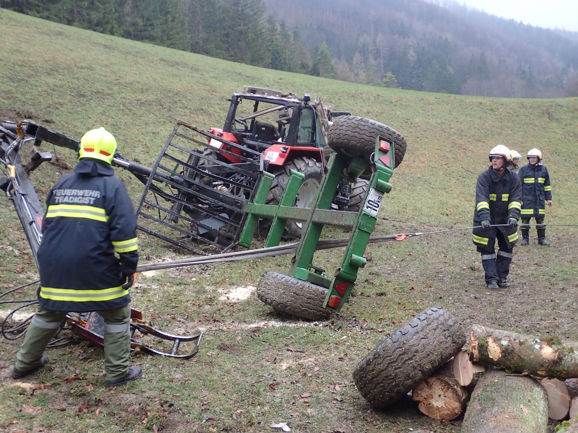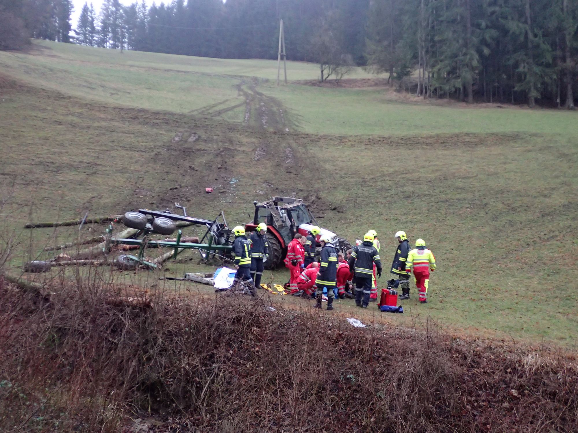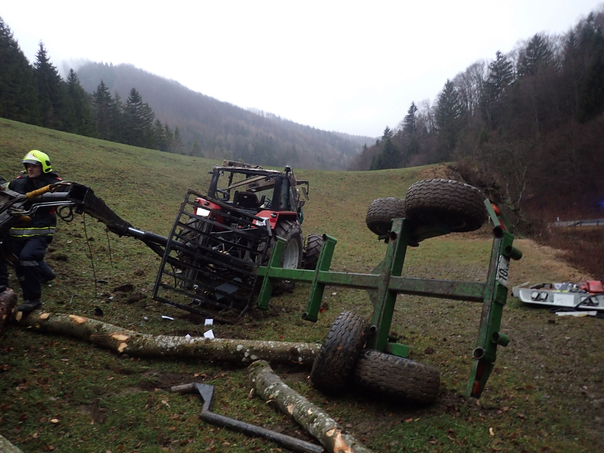 Ein Landwirt und seine Lebensgefährtin waren mit seinem Traktorgespann vom Weg abgekommen und über eine steile Wiese abgerutscht. Der Traktor überschug sich dabei und kam nach dem Unfall wieder auf den Rädern zum Stehen. Der Anhänger blieb auf der Seite liegen.