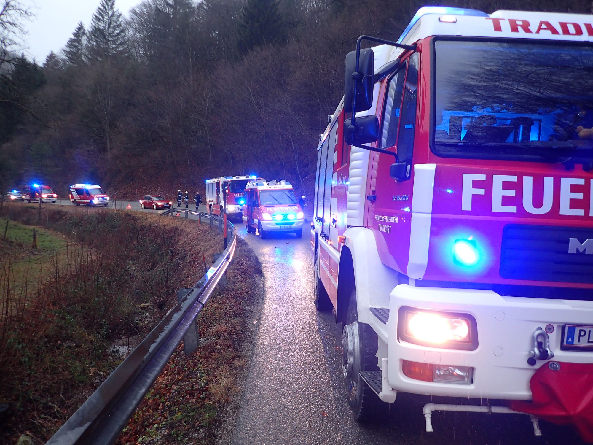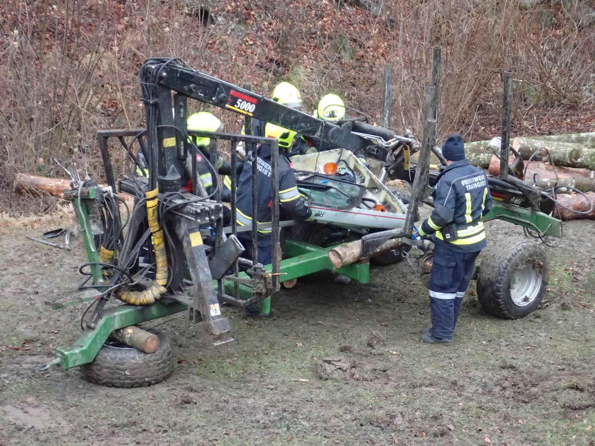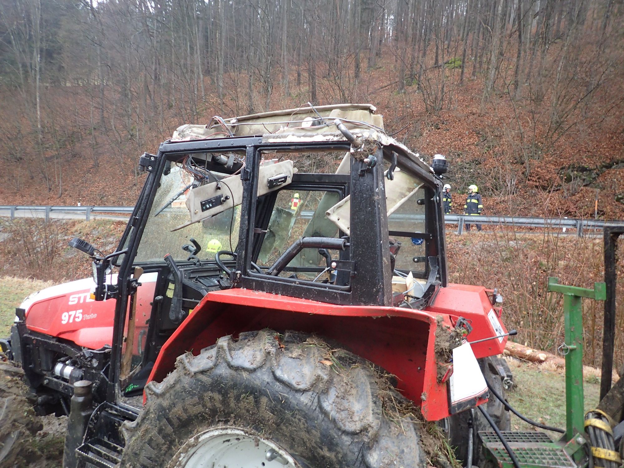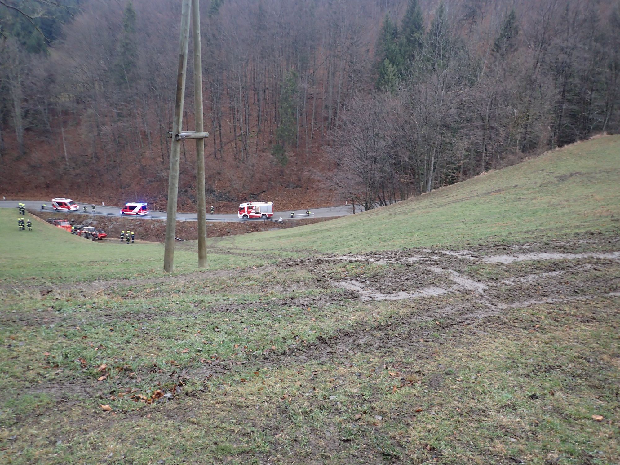 Ein Landwirt und seine Lebensgefährtin waren mit seinem Traktorgespann vom Weg abgekommen und über eine steile Wiese abgerutscht. Der Traktor überschug sich dabei und kam nach dem Unfall wieder auf den Rädern zum Stehen. Der Anhänger blieb auf der Seite liegen.