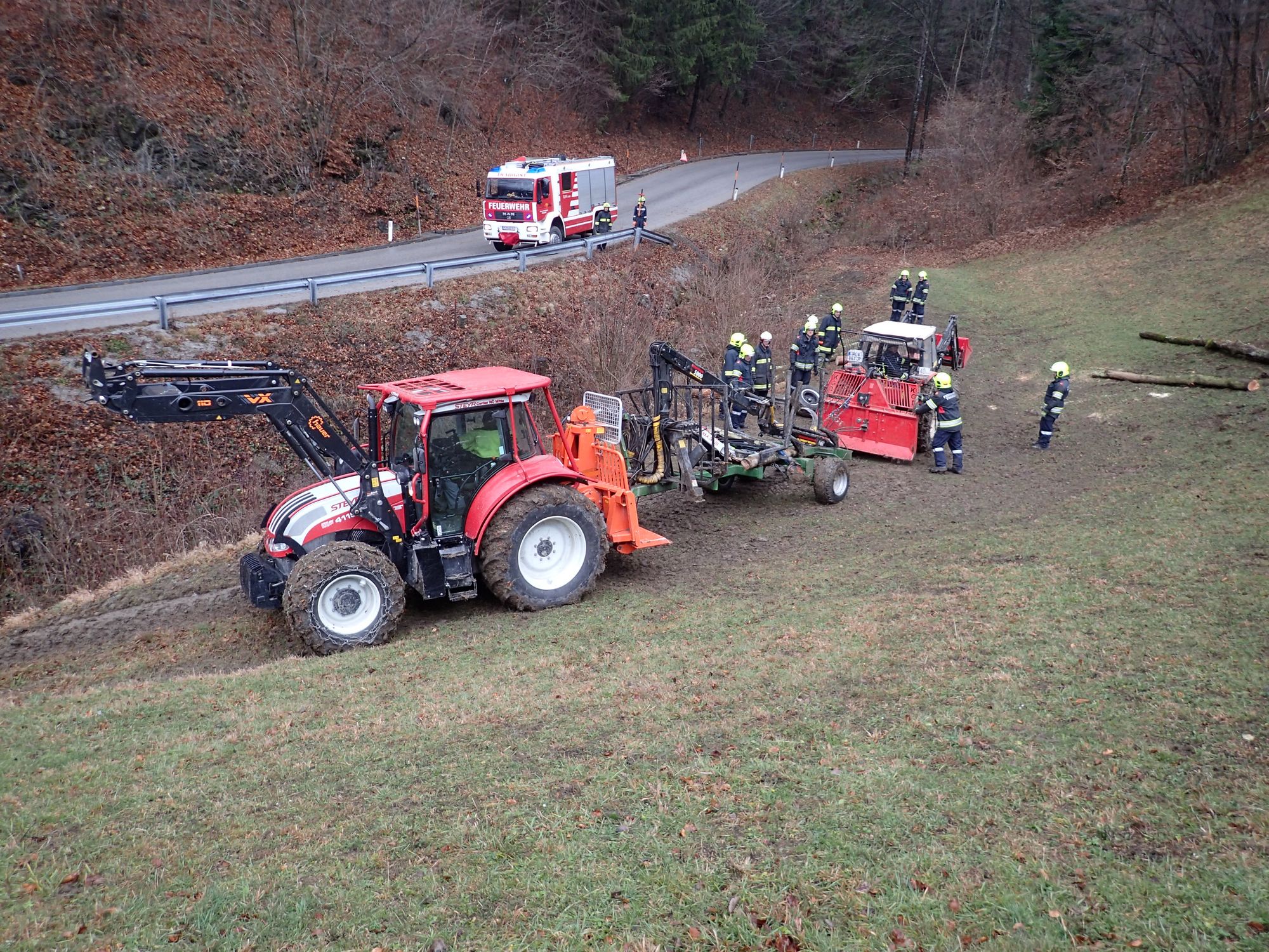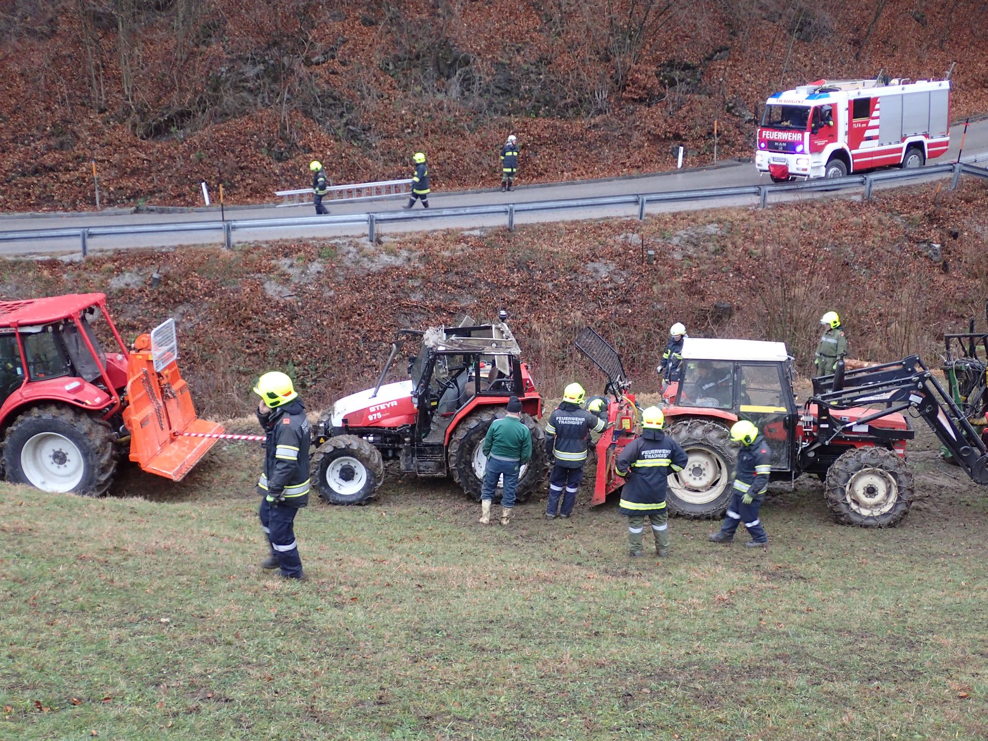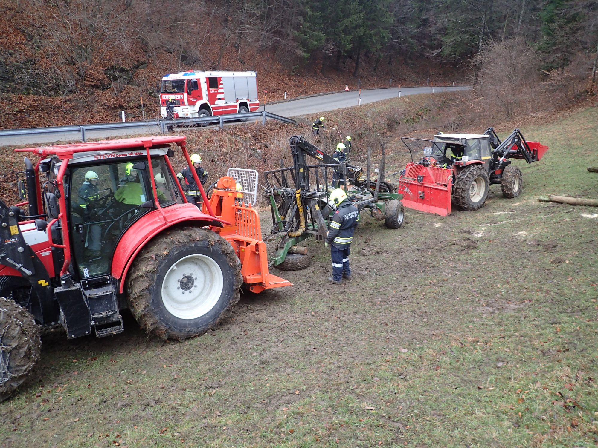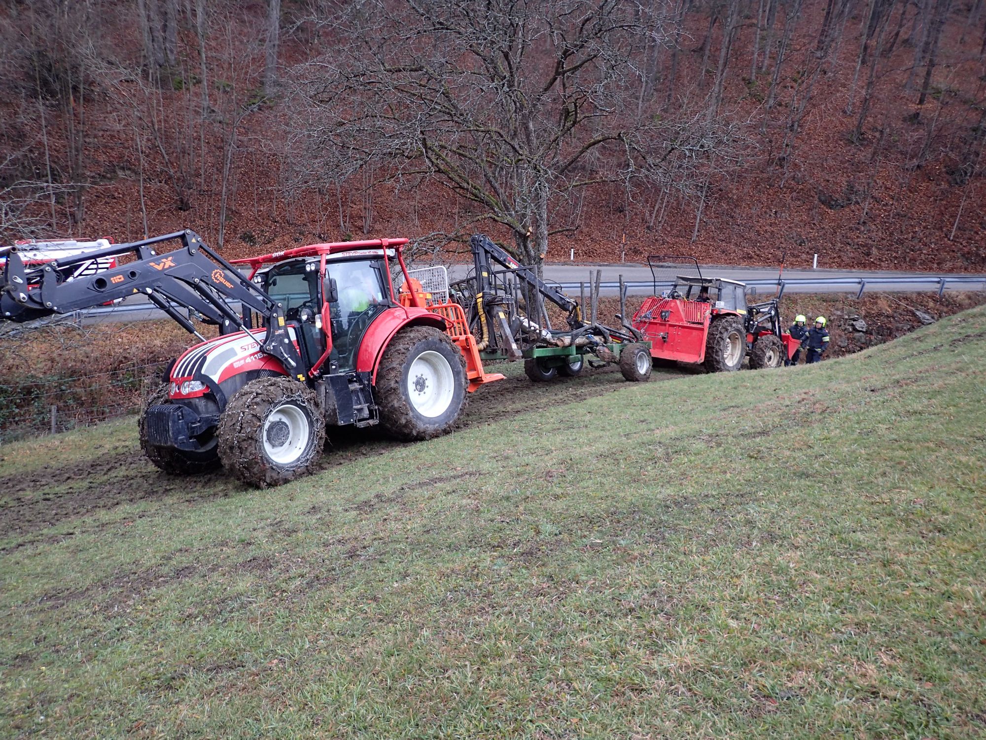 Nach Abtransport der beiden Unfallopfer ins Krankenhaus begannen wir die Bergung des Traktors samt Anhänger. Bei der Bergung wurden wir von 2 Landwirten mit ihren Traktorer und Seilwinden unterstützt.