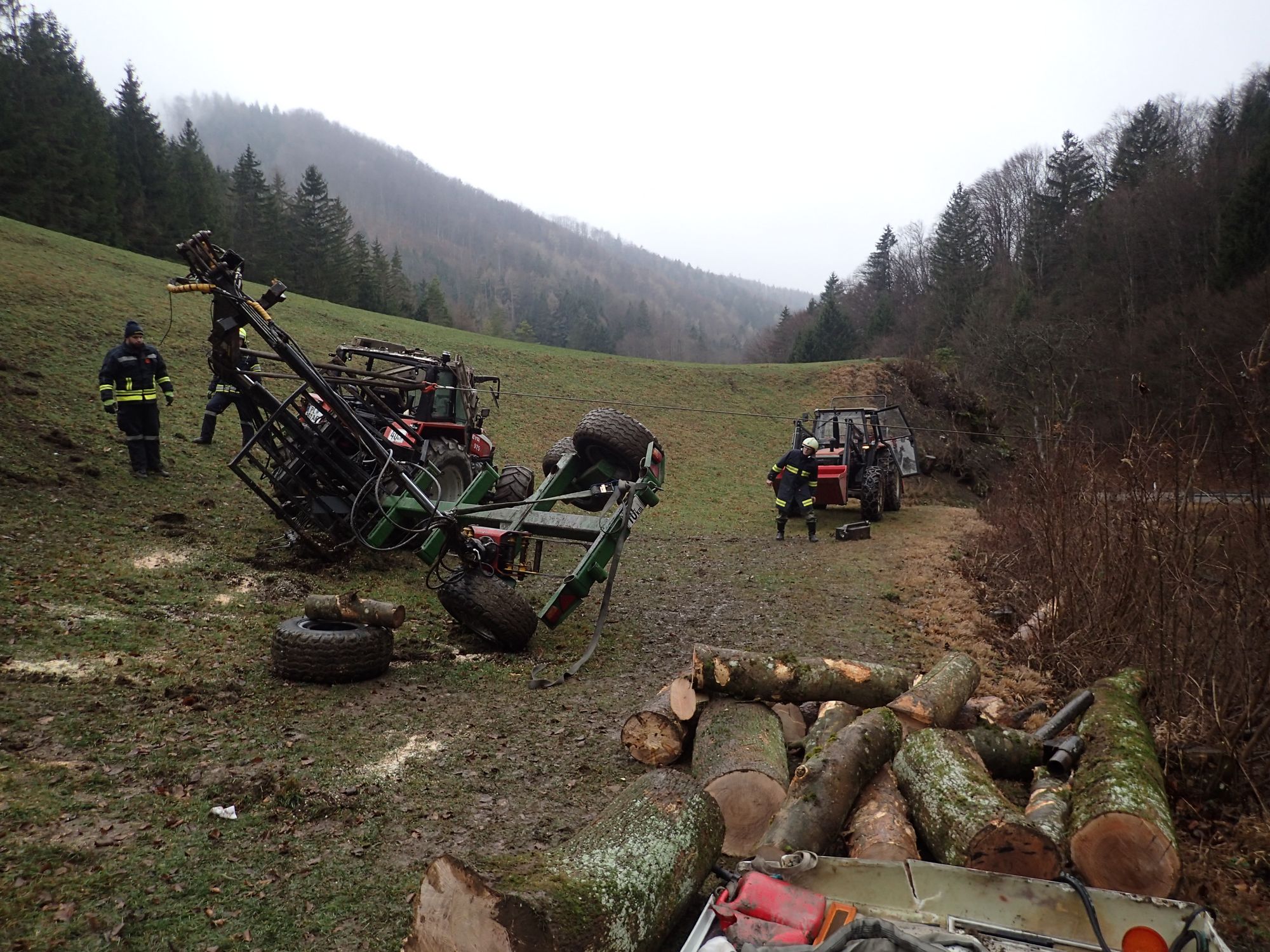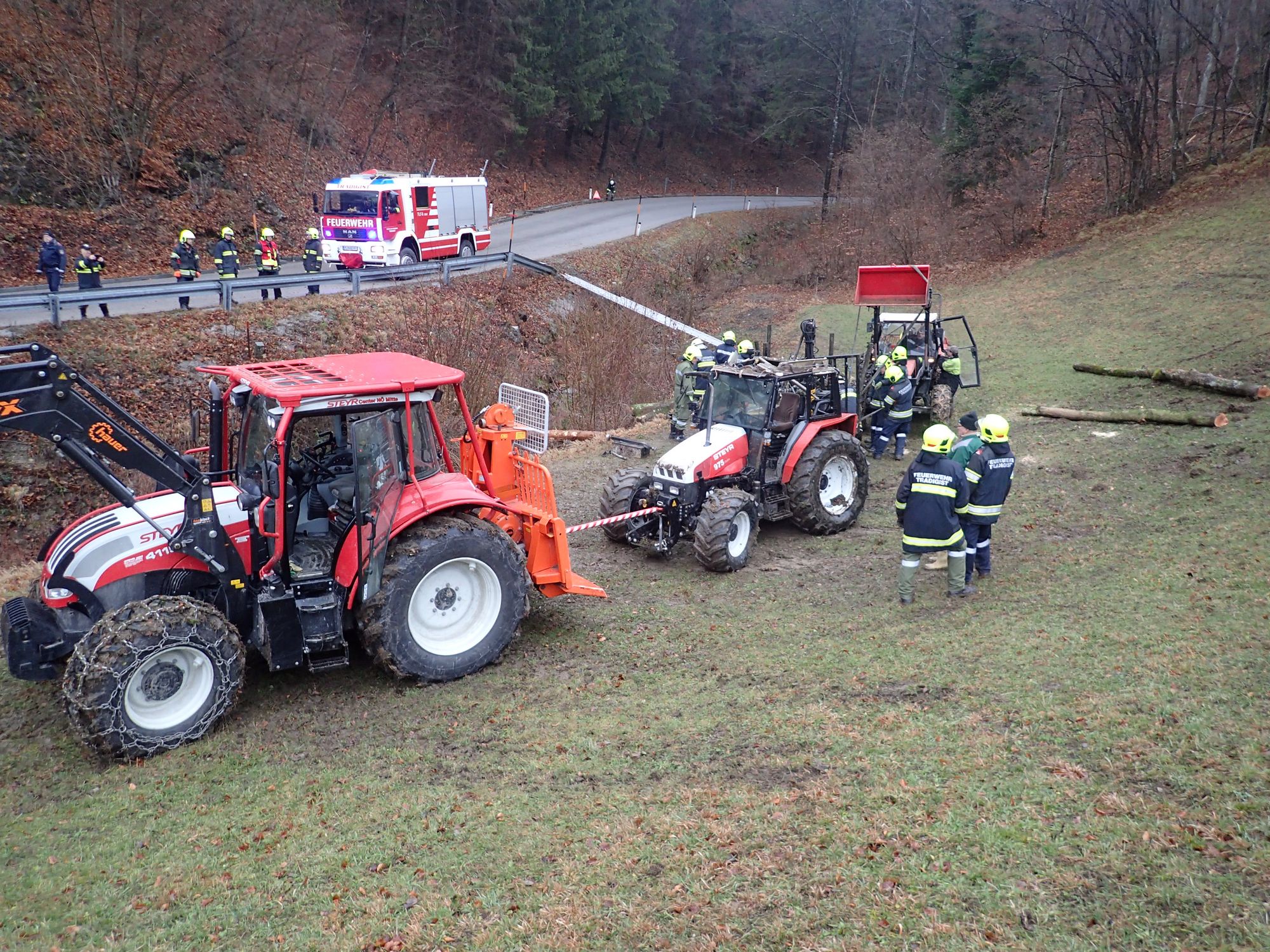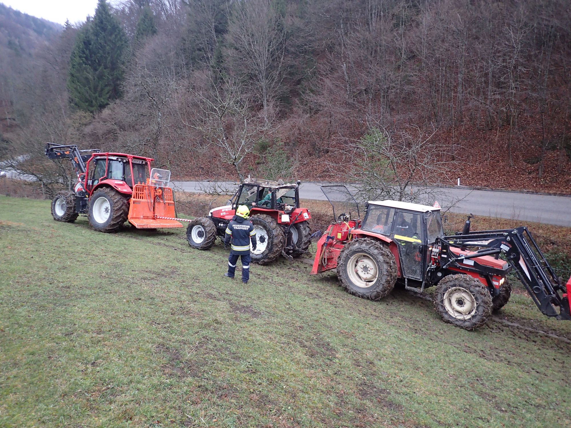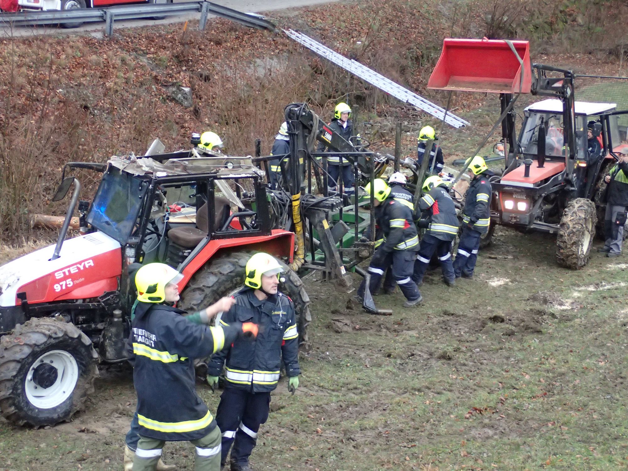 Nach Abtransport der beiden Unfallopfer ins Krankenhaus begannen wir die Bergung des Traktors samt Anhänger. Bei der Bergung wurden wir von 2 Landwirten mit ihren Traktorer und Seilwinden unterstützt.