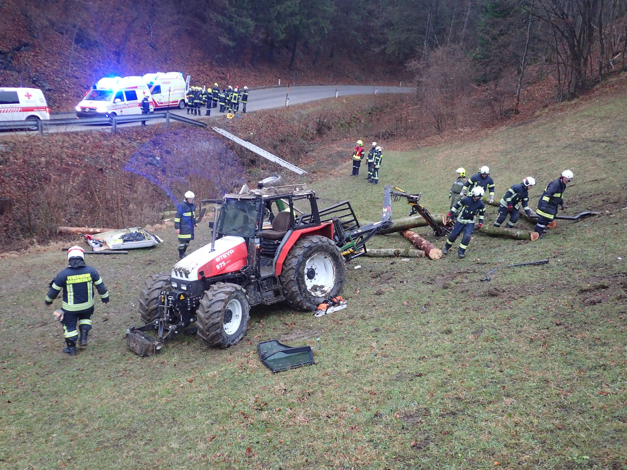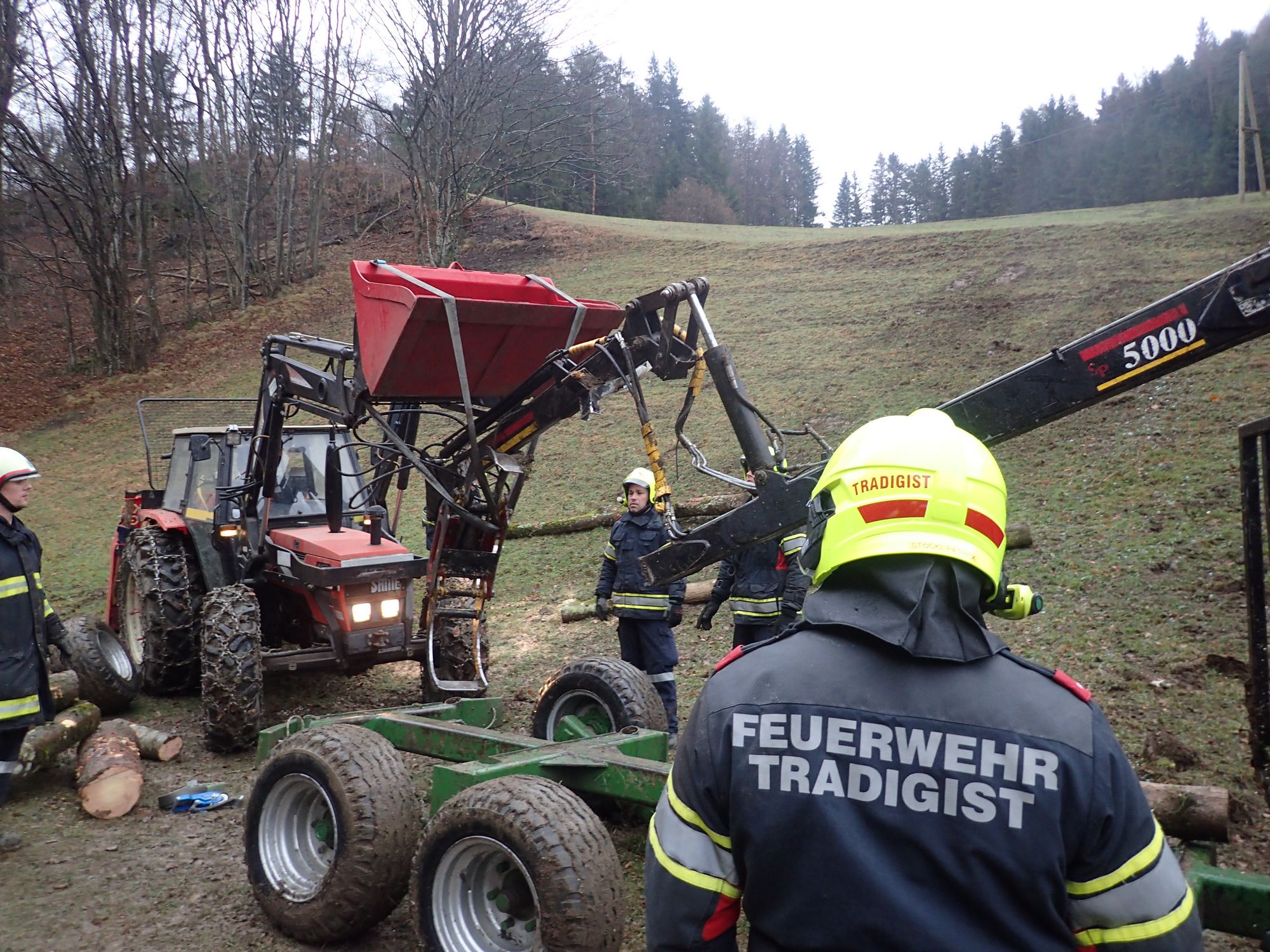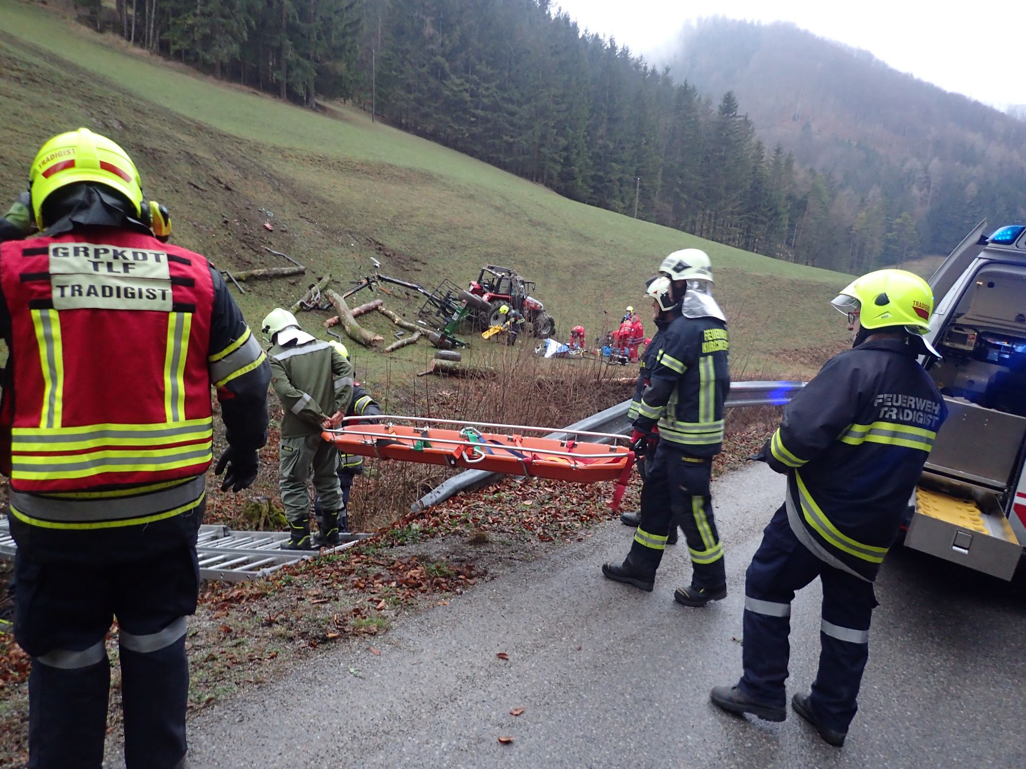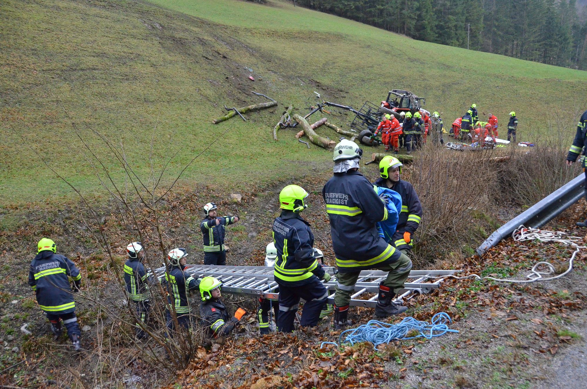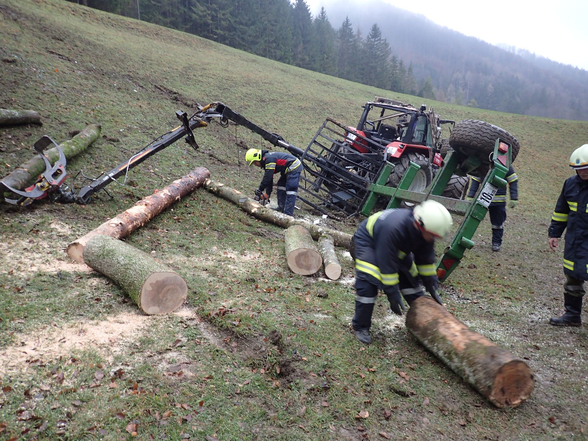Nach Abtransport der beiden Unfallopfer ins Krankenhaus begannen wir die Bergung des Traktors samt Anhänger. Bei der Bergung wurden wir von 2 Landwirten mit ihren Traktorer und Seilwinden unterstützt.