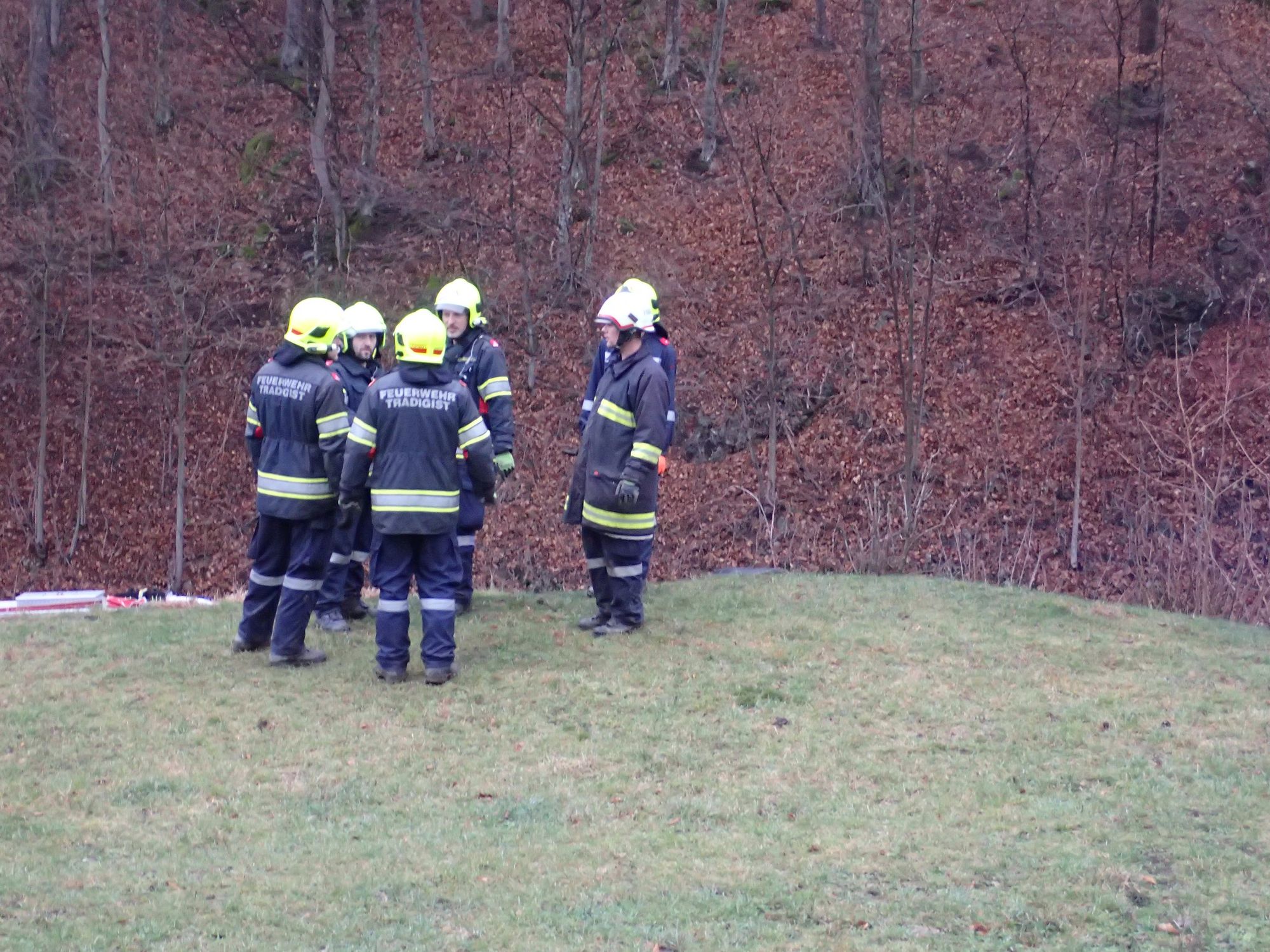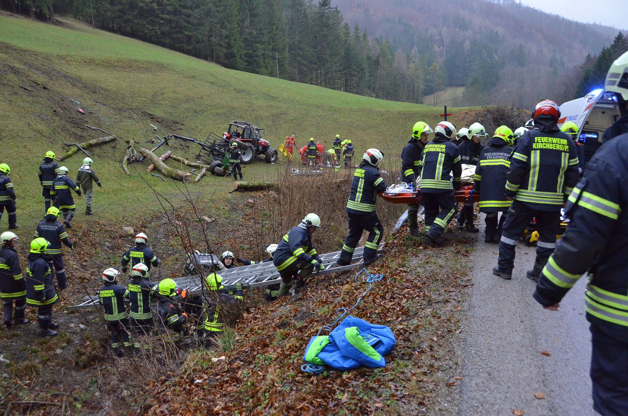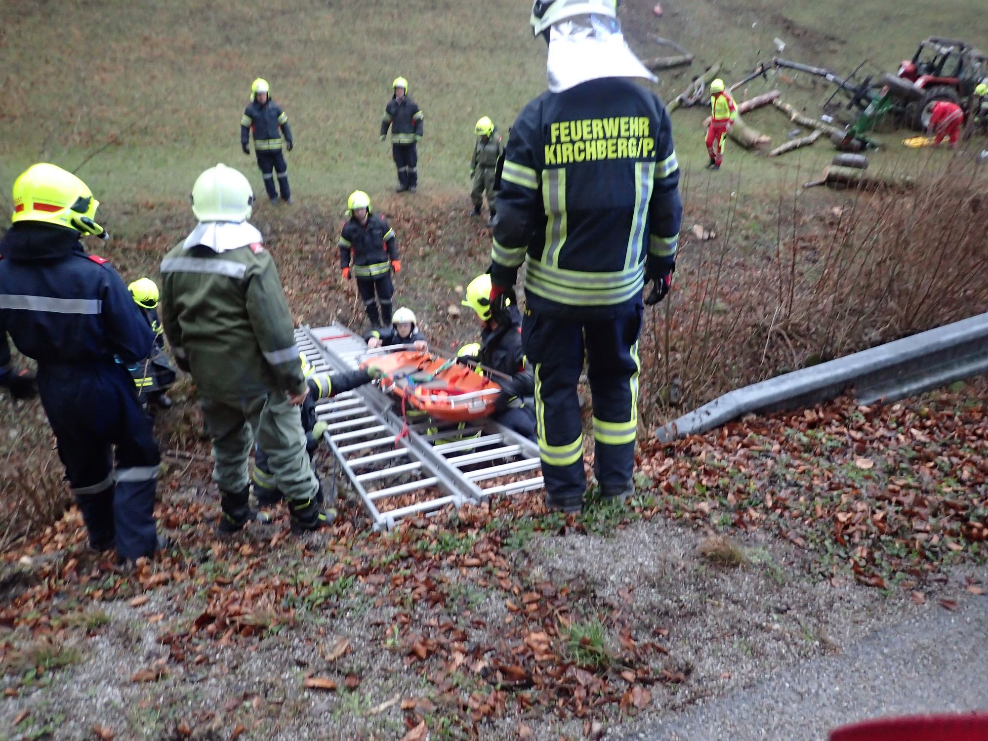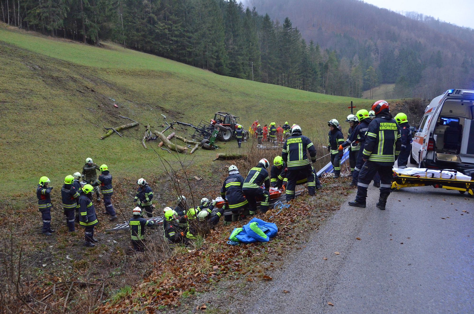 Nach Abtransport der beiden Unfallopfer ins Krankenhaus begannen wir die Bergung des Traktors samt Anhänger. Bei der Bergung wurden wir von 2 Landwirten mit ihren Traktorer und Seilwinden unterstützt.