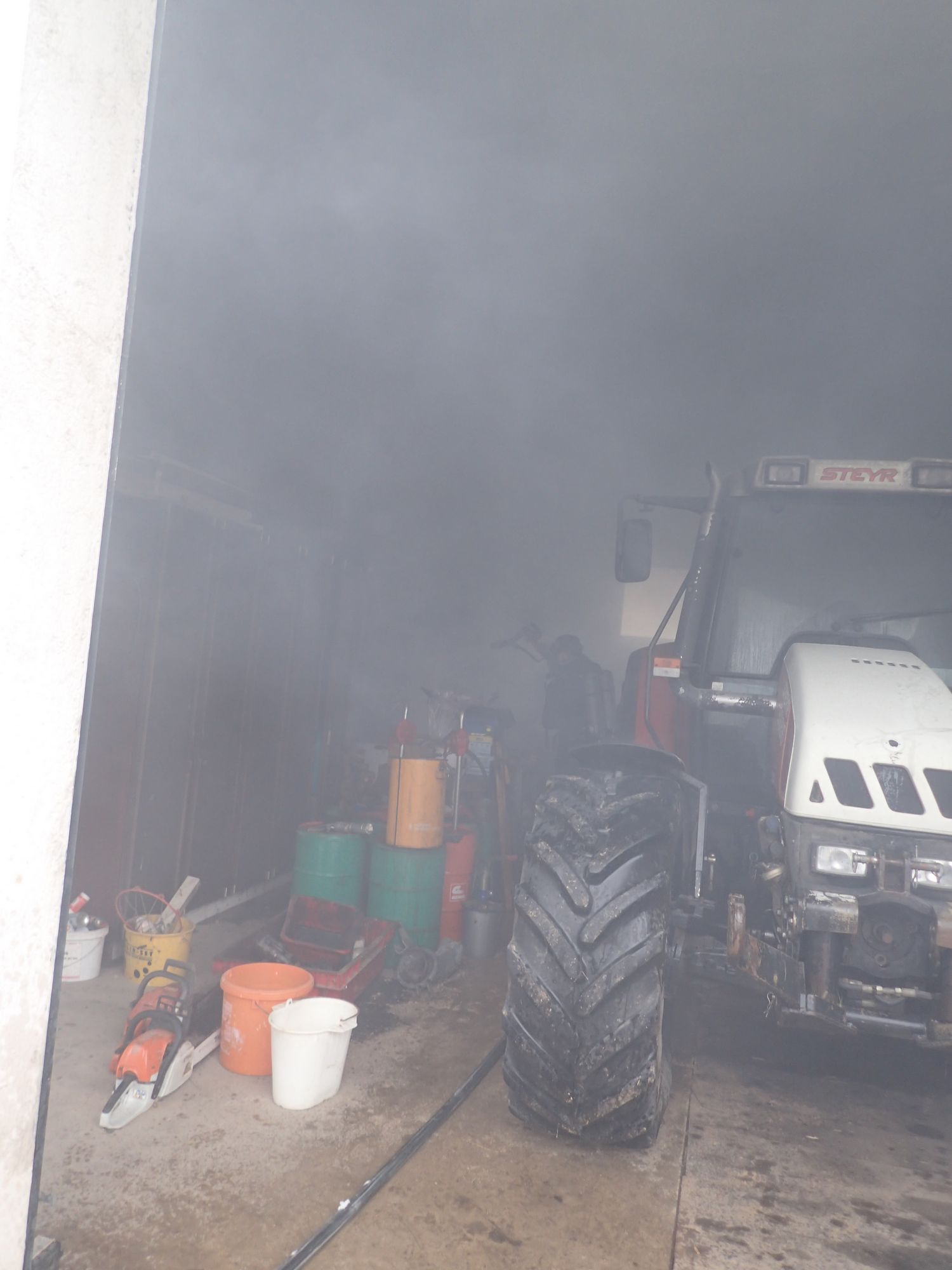 Heute um die Mittagszeit waren einige Kameraden zufällig mit Arbeiten im Feuerwehrhaus beschäftigt, als beim benachbarten Gehöft in einer Maschinenhalle ein Brand in der Werkstätte ausbrach.