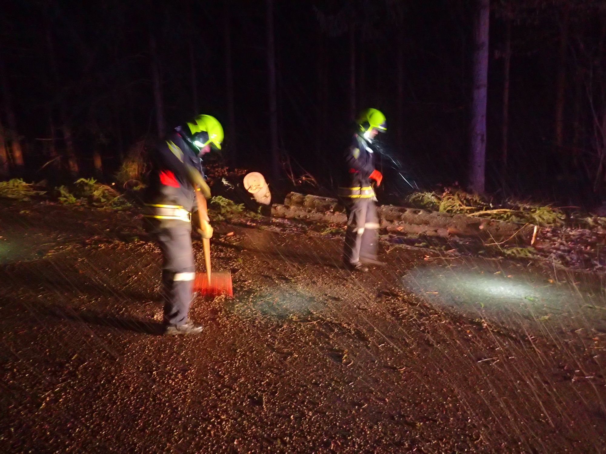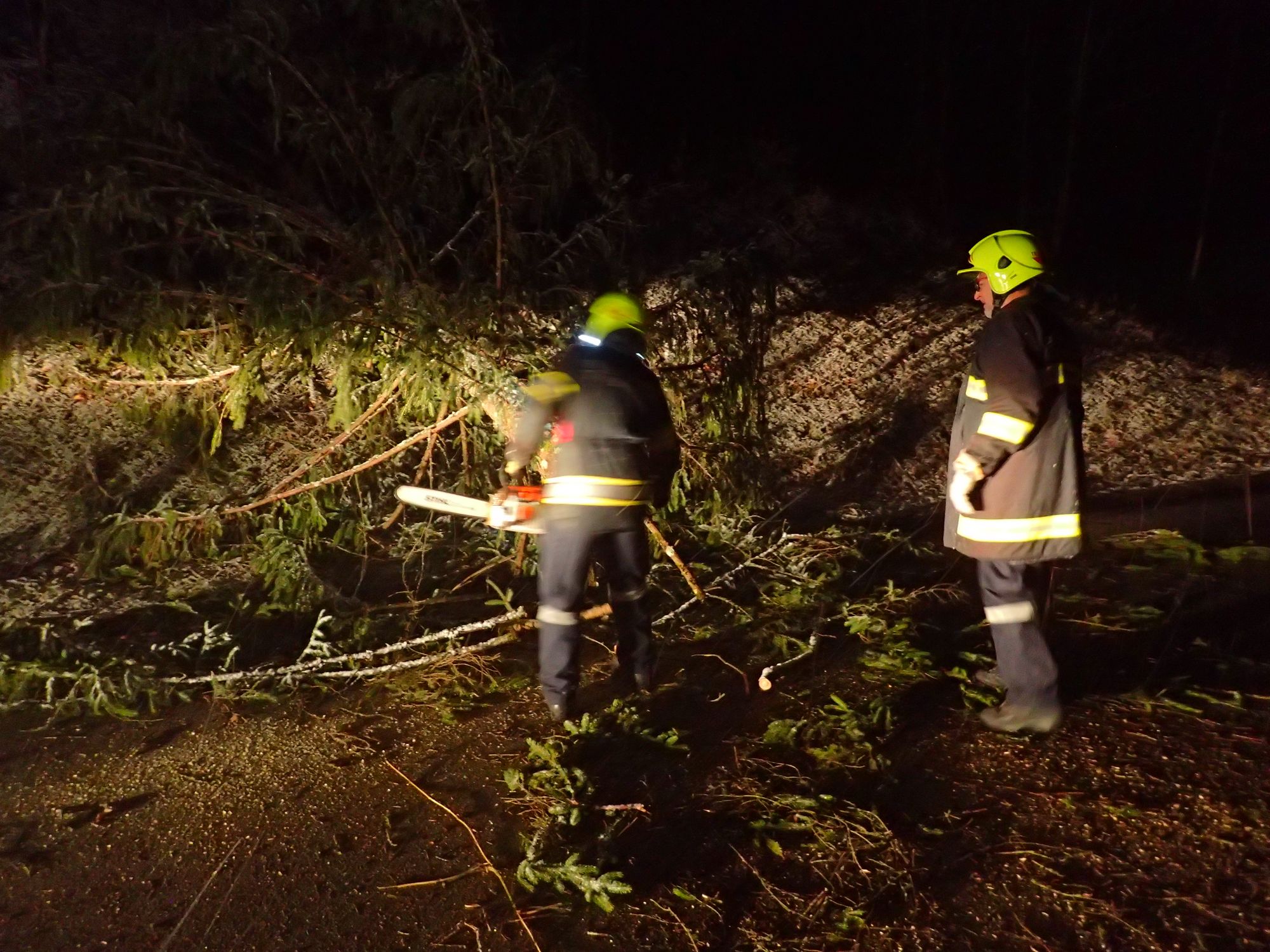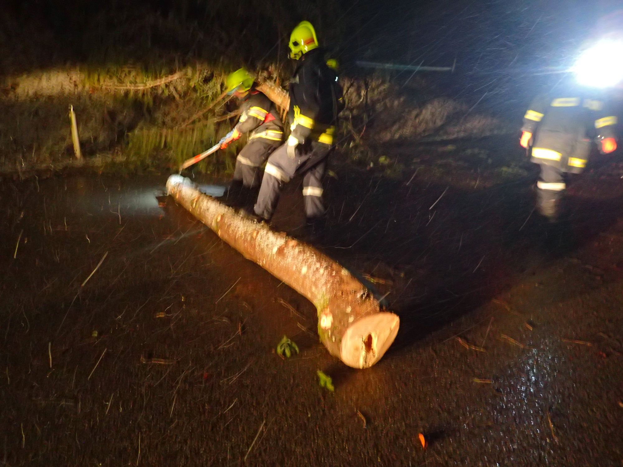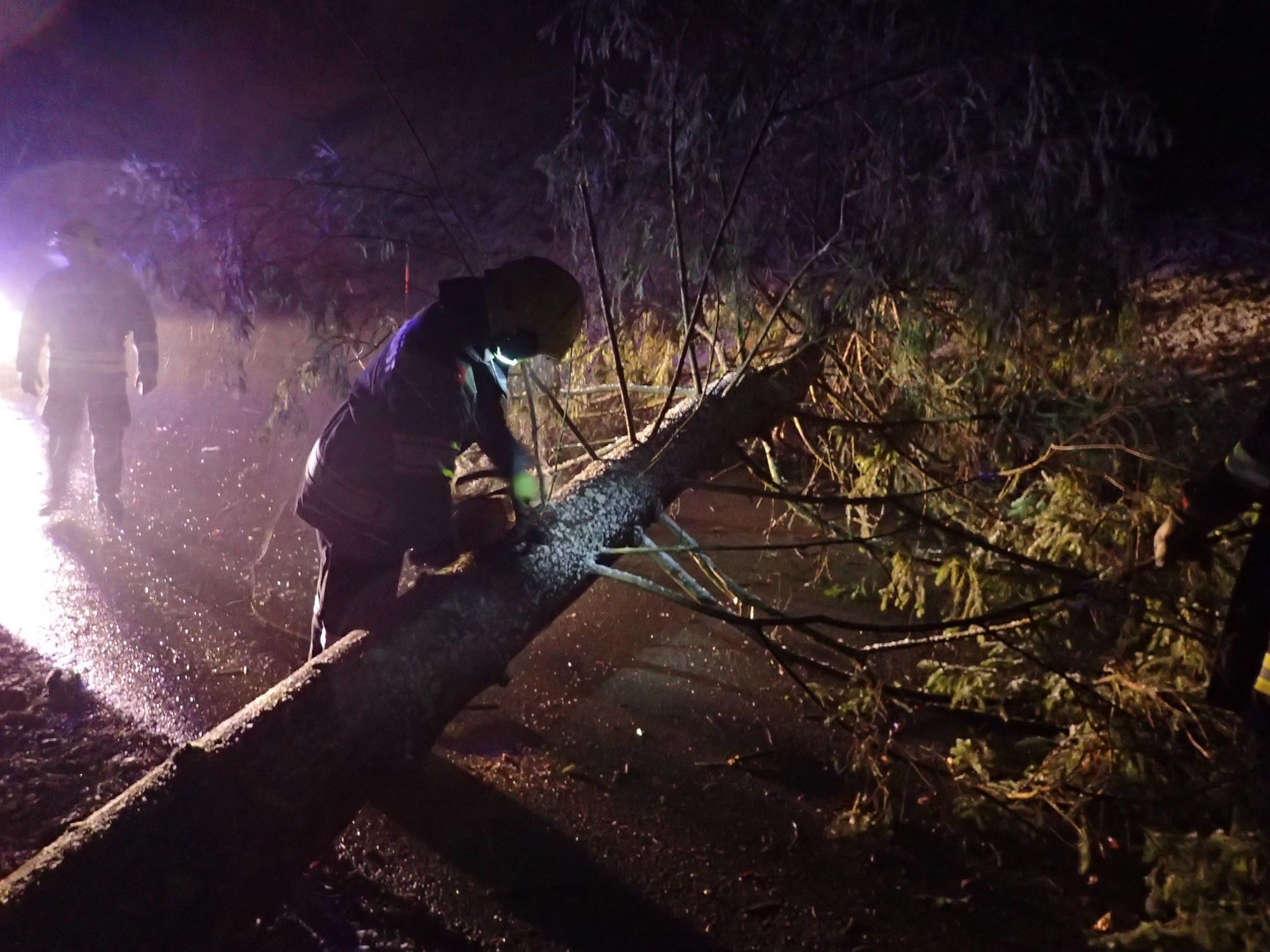 Der ausgewurzelte Baum wurde mittel Motorsäge entastet auf Blochlänge abgeschnitten und neben der Fahrbahn abgelegt. Anschließend wurde die Straße noch gereinigt.