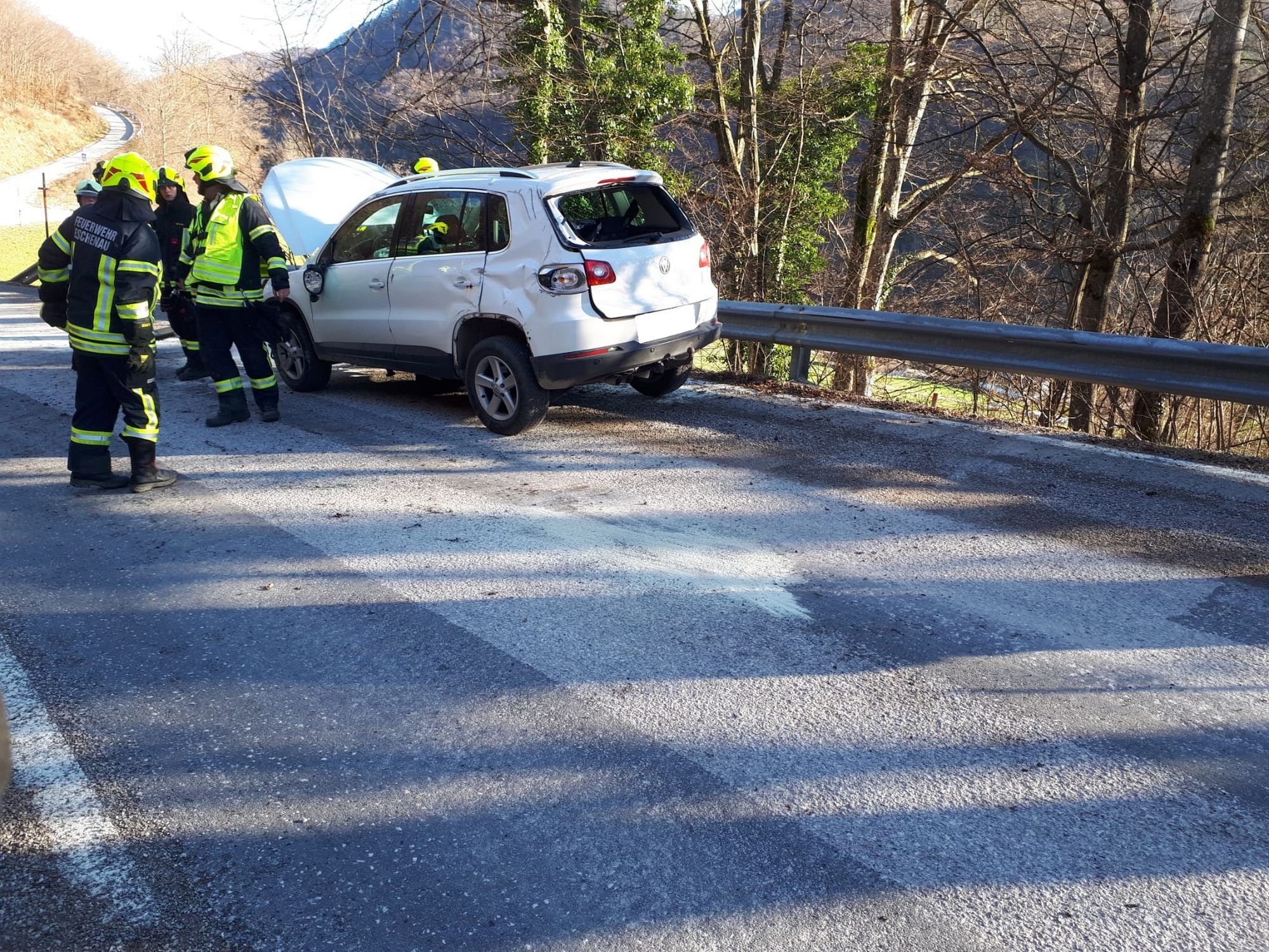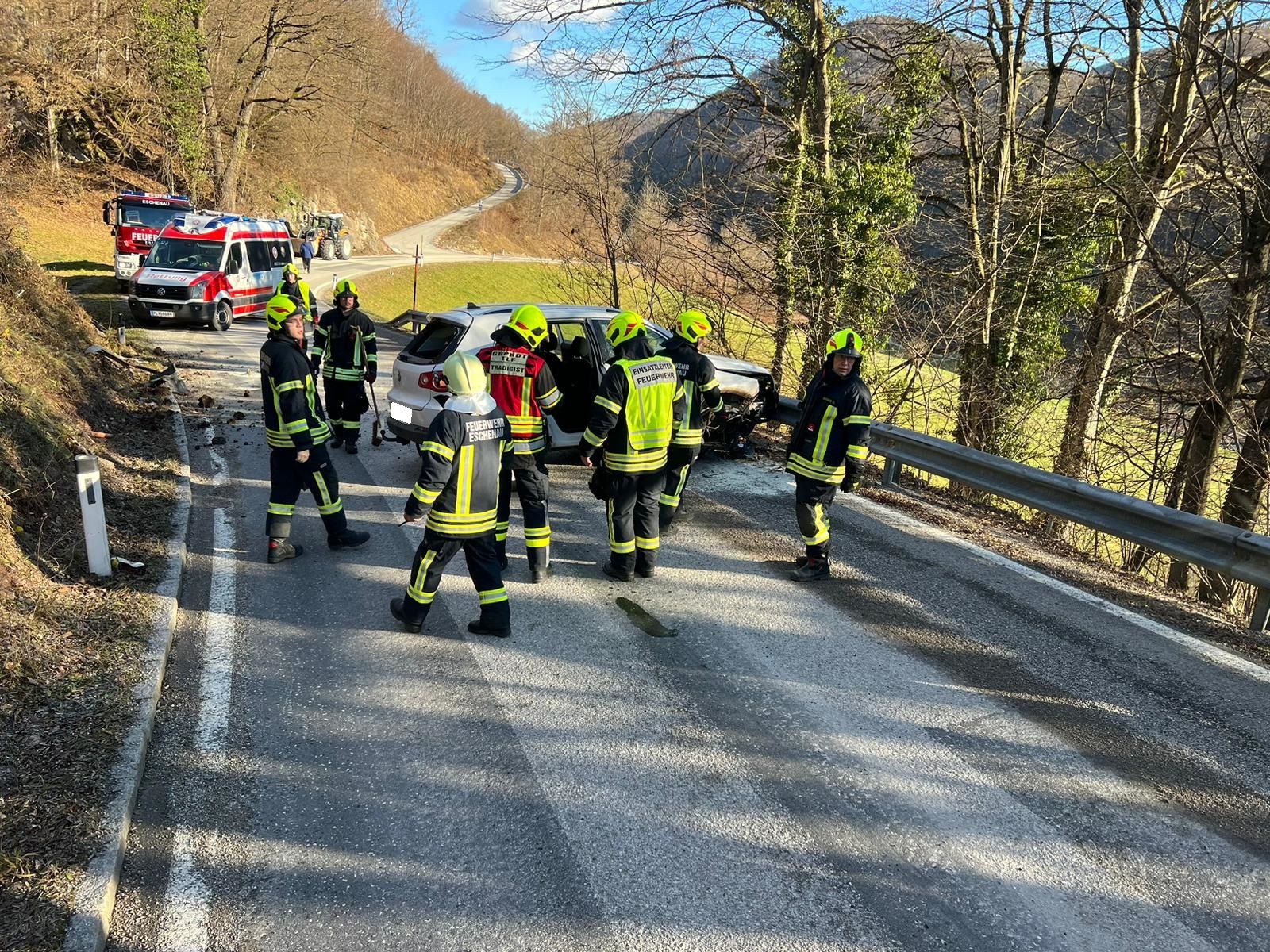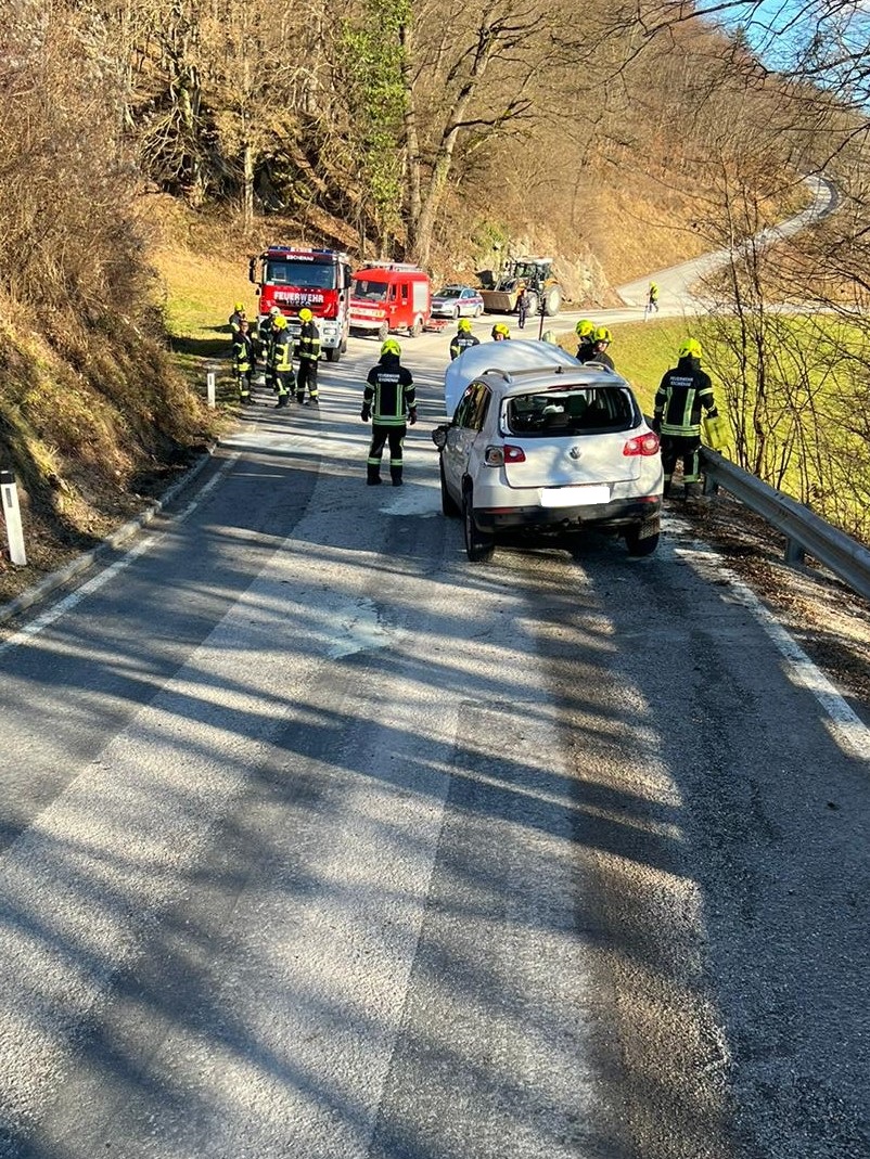 Ein Fahrzeuglenker fuhr mit seinem PKW von Eschenau Richtung Tradigist und kam in einer Kurve auf den Splitt, der sich auf der Fahrbahn befand. Er verlor die Kontrolle über sein Fahrzeug, rammte die Böschung, überschlug sich einmal in der Luft und kam danach quer zur Fahrbahn mit den Rädern am Asphalt wieder zum Stehen.