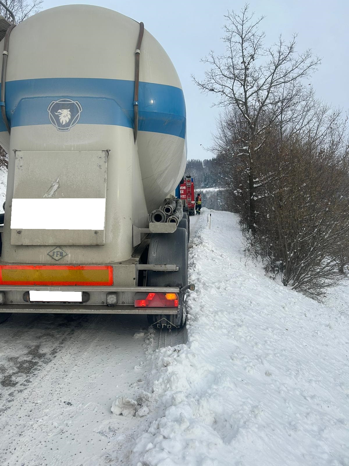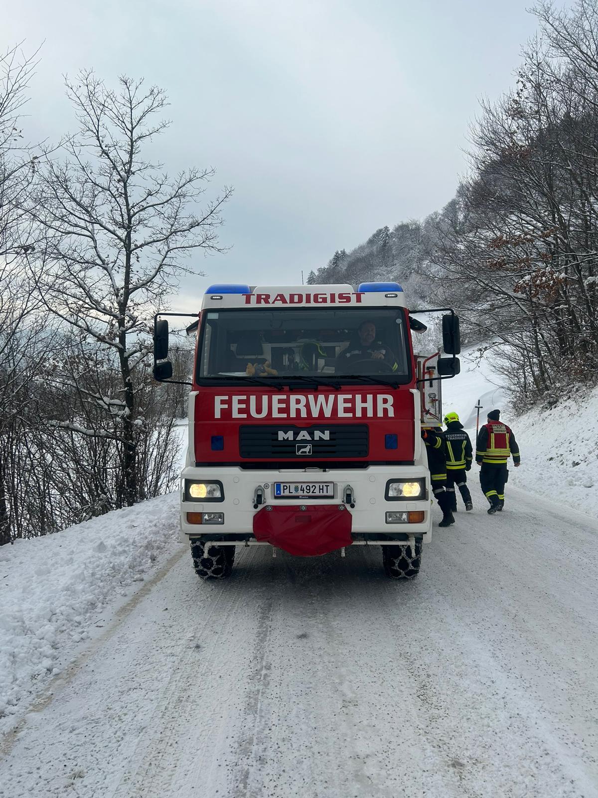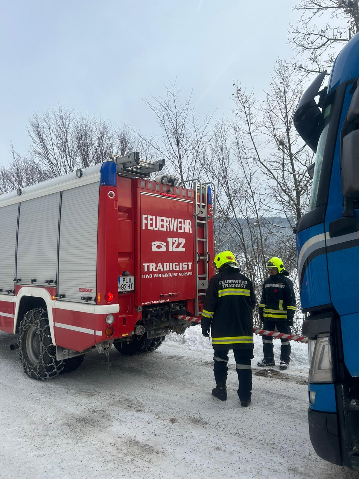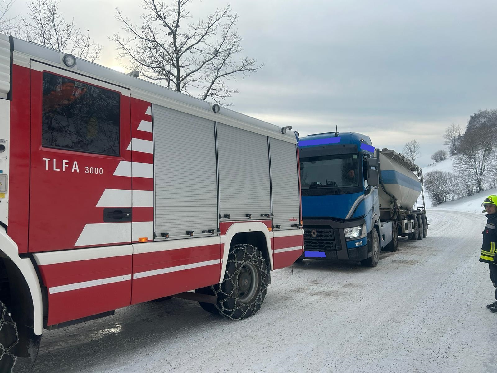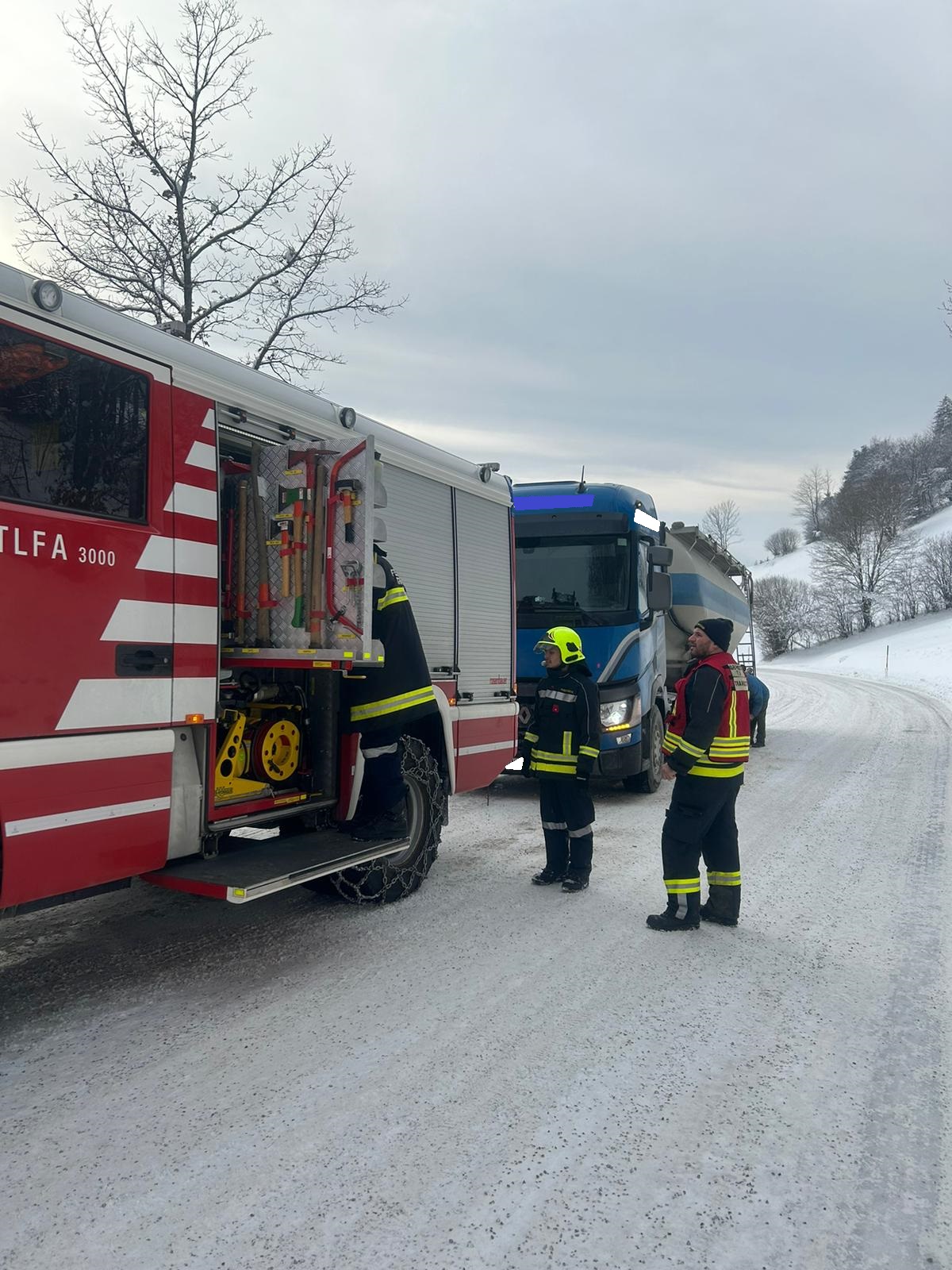 Mit unserem TLFA 3000 und der Schleppstange wurde der Sattelschlepper bis zu einem nahegelegenen Firmenareal geschleppt wo wir dem Fahrer noch halfen die Schneeketten anzulegen.