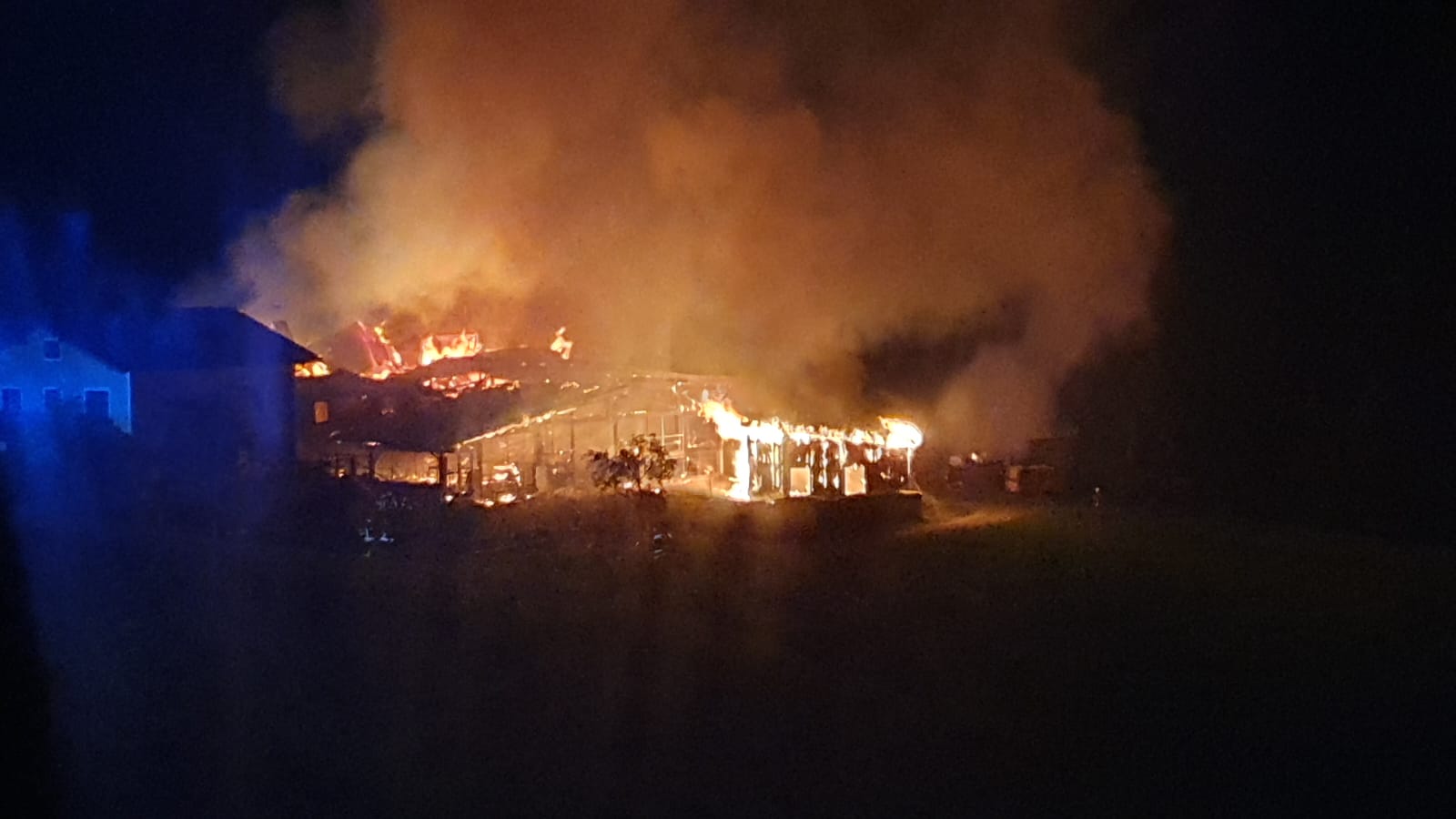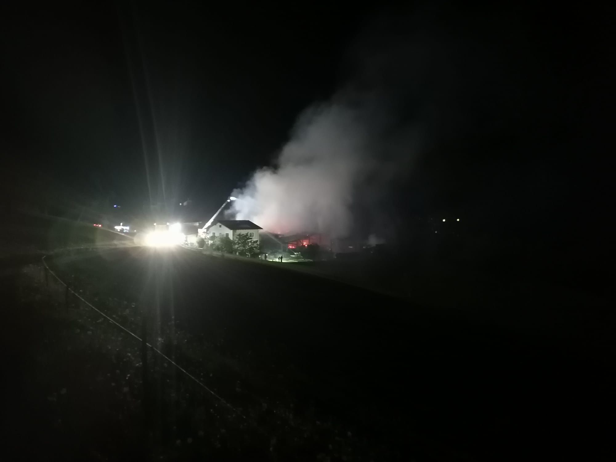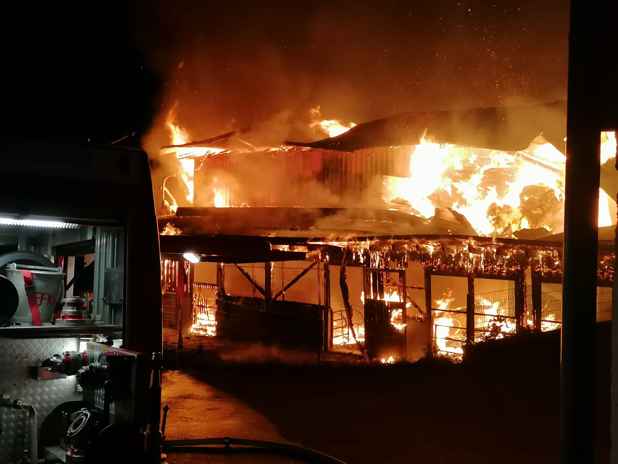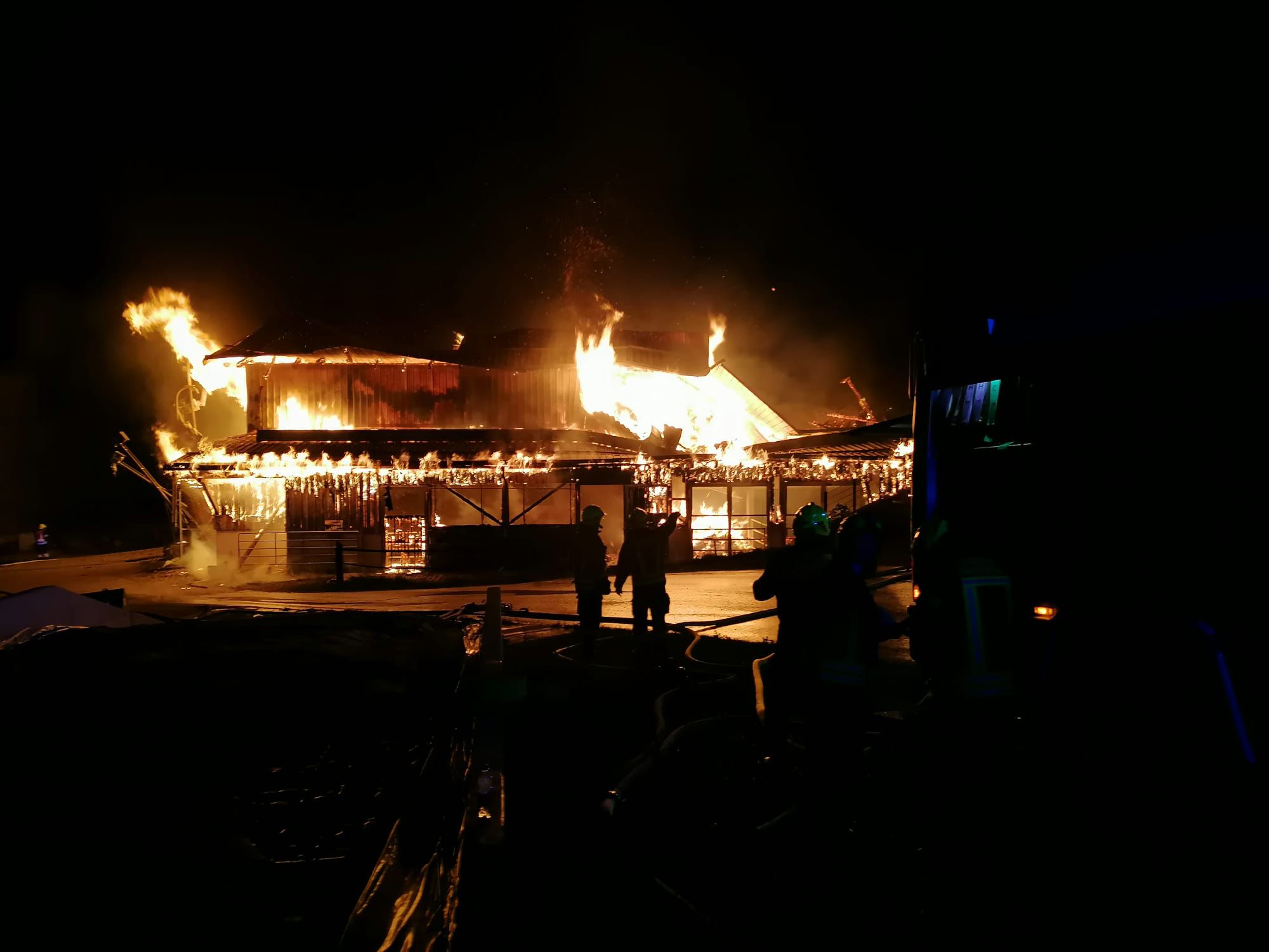 Beim Eintreffen der Einsatzkräfte stand das Stallgebäude eines landwirtschaftlichen Betriebs bereits im Vollbrand. Es galt mit vereinten Kräften das direkt angrenzende Wohnhaus zu schützen.