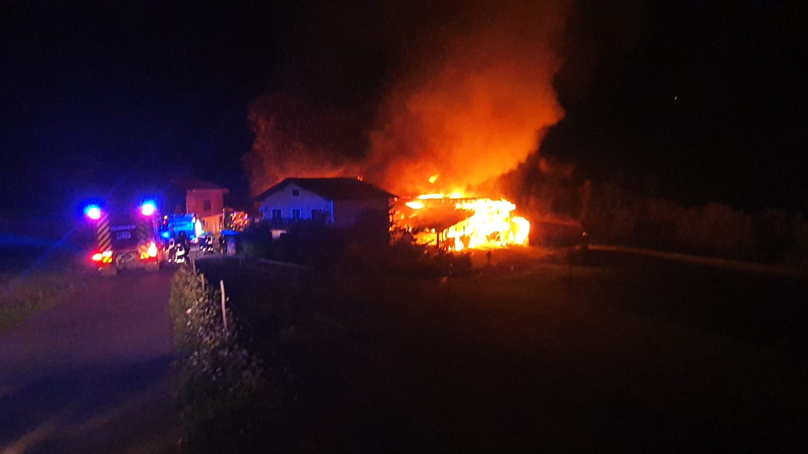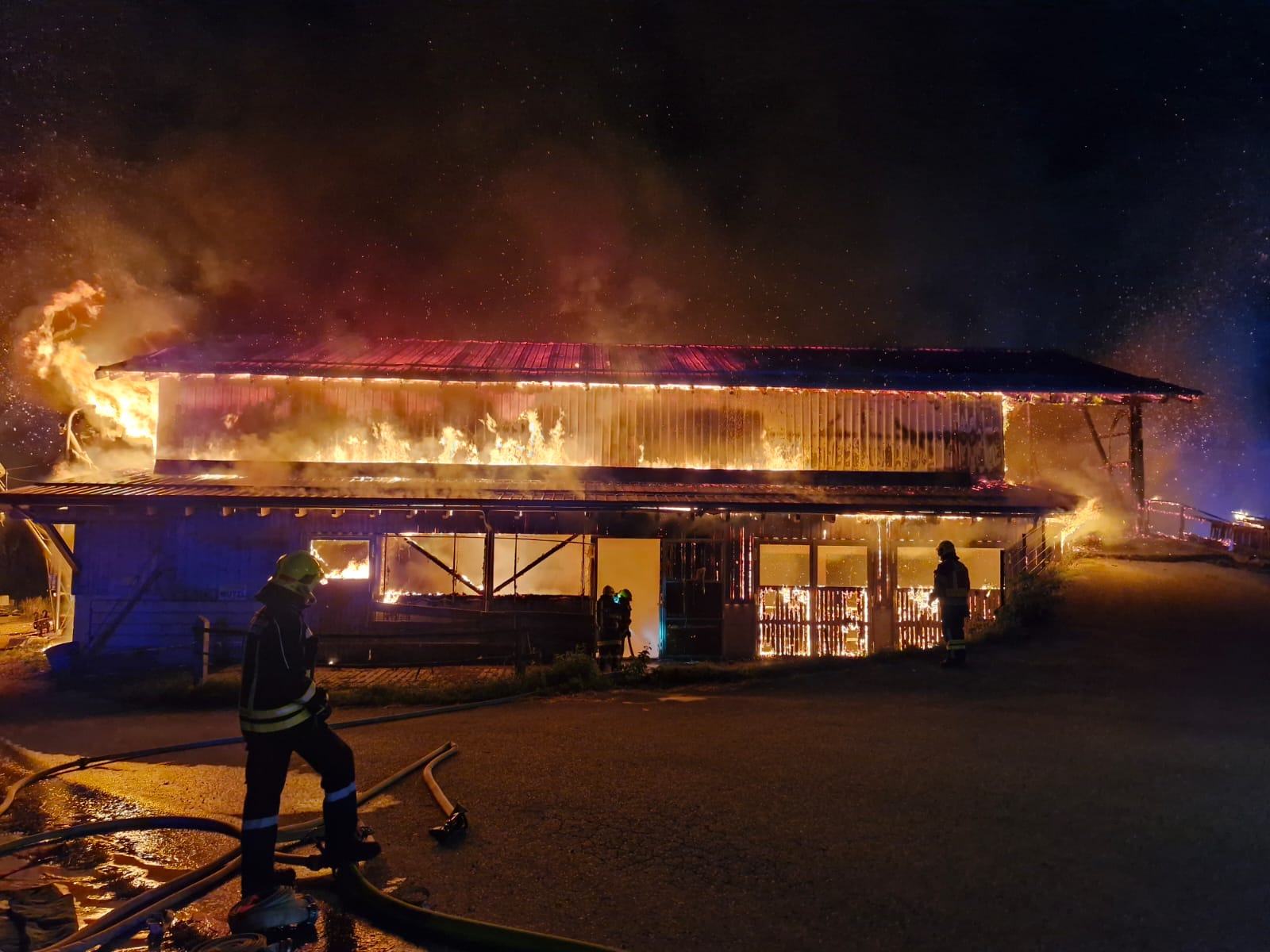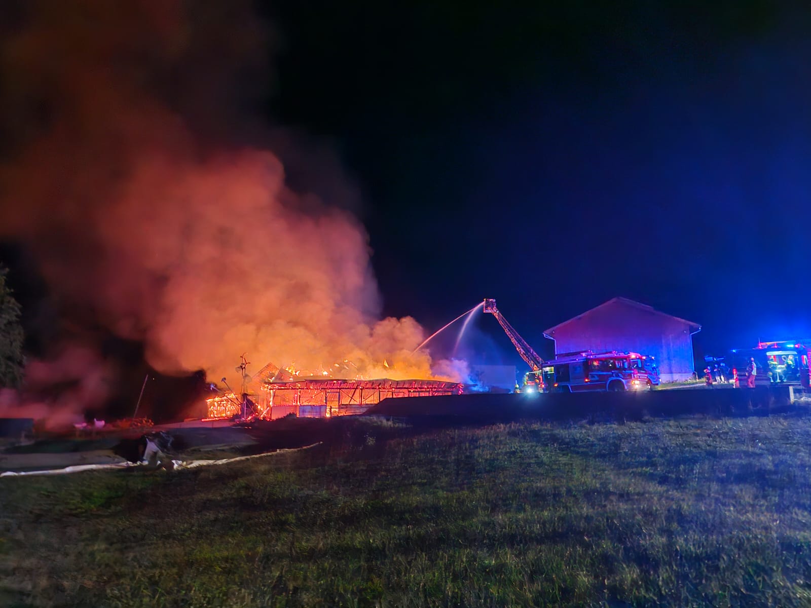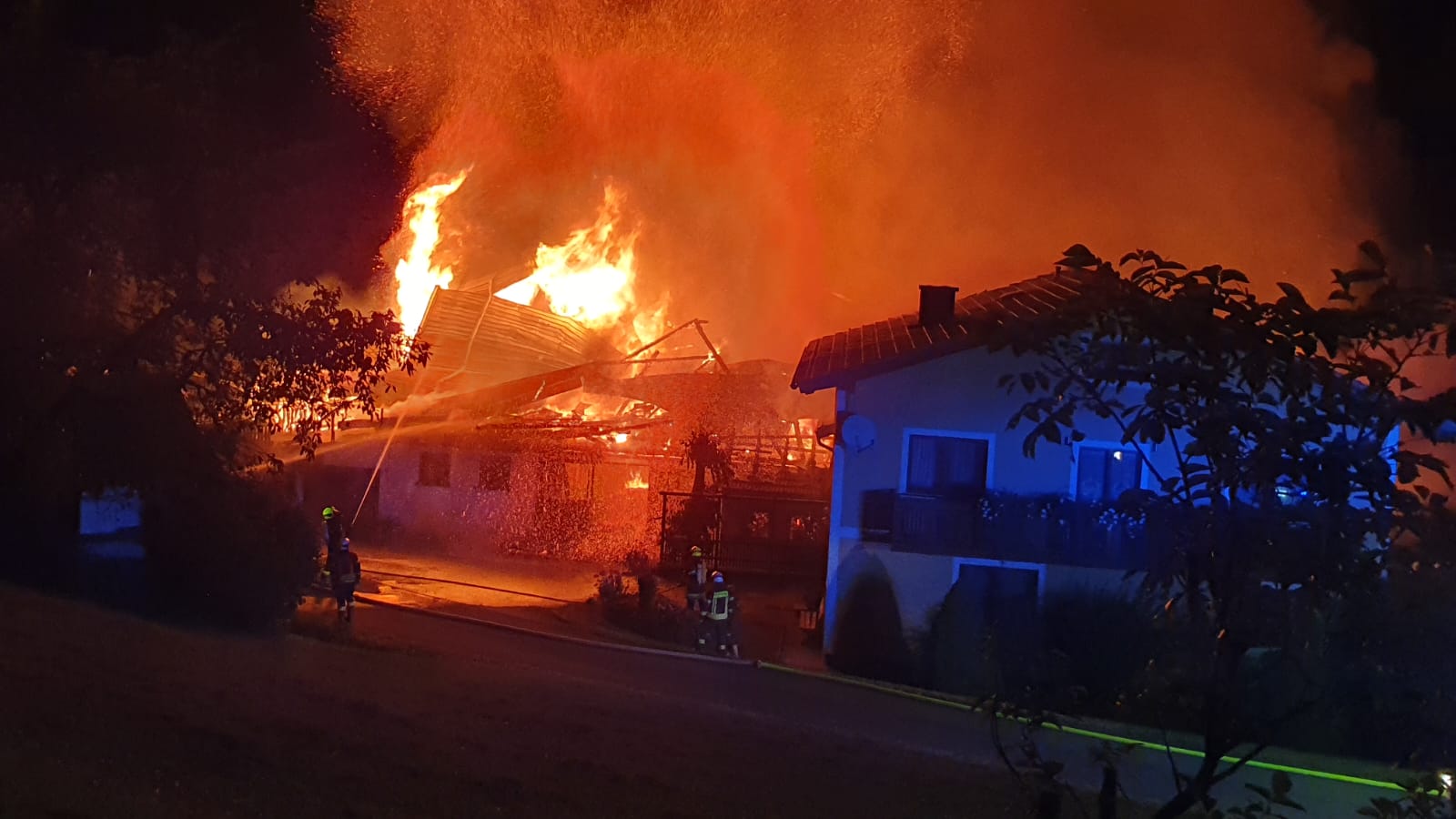 Beim Eintreffen der Einsatzkräfte stand das Stallgebäude eines landwirtschaftlichen Betriebs bereits im Vollbrand. Es galt mit vereinten Kräften das direkt angrenzende Wohnhaus zu schützen.