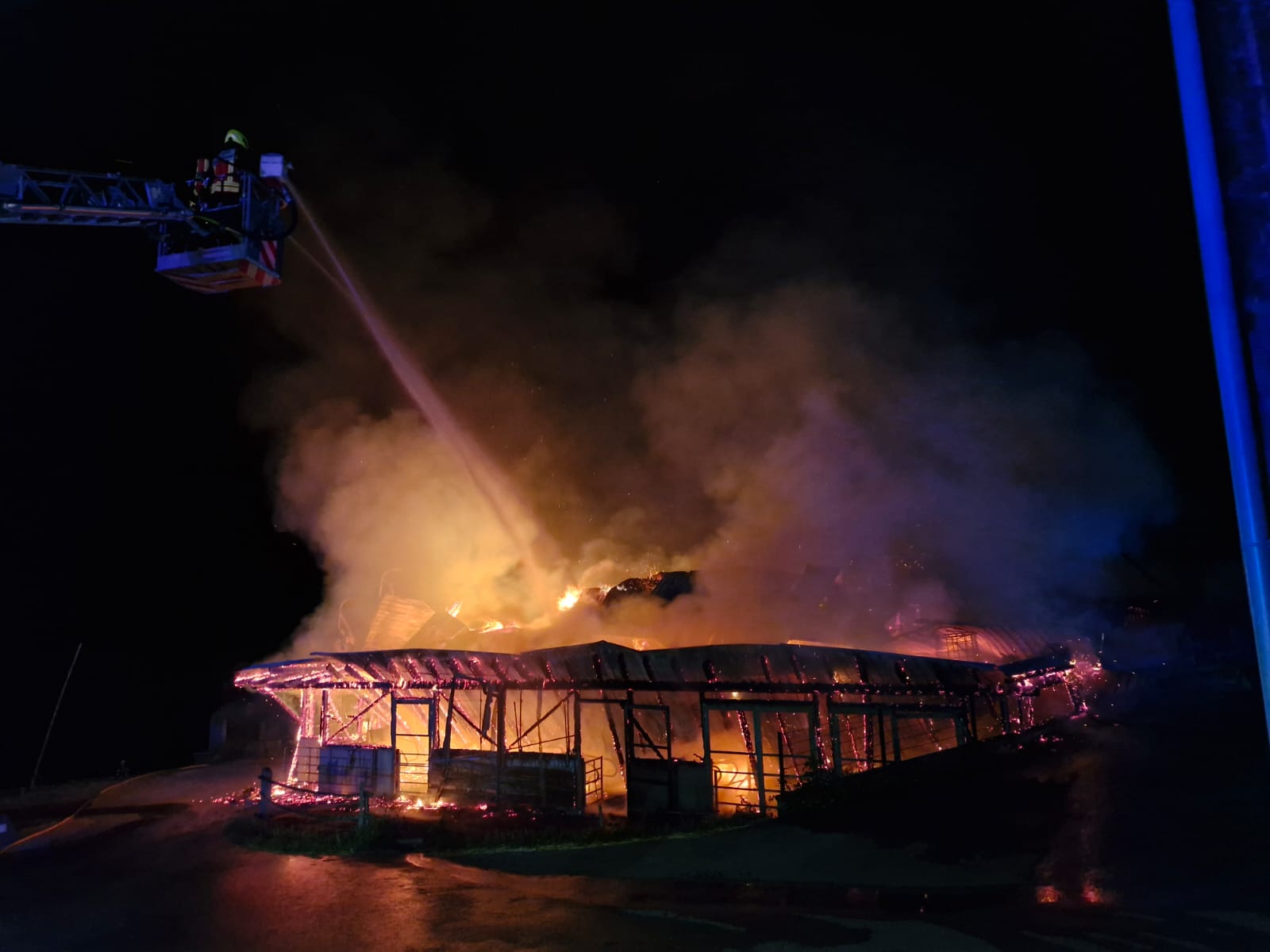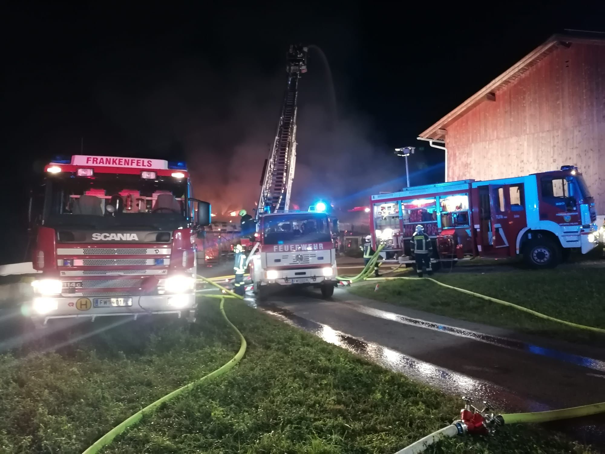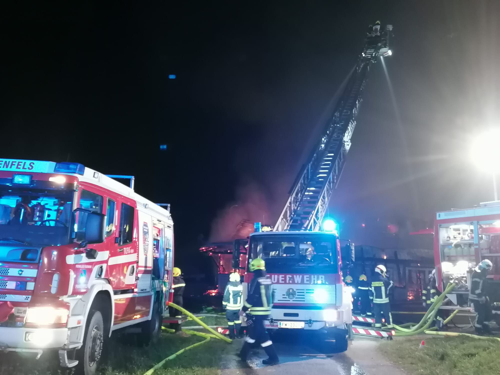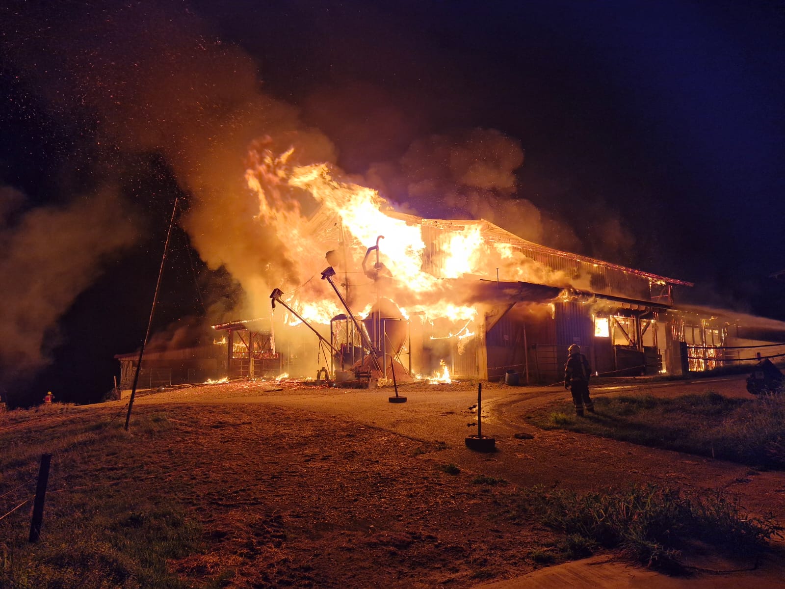 Beim Eintreffen der Einsatzkräfte stand das Stallgebäude eines landwirtschaftlichen Betriebs bereits im Vollbrand. Es galt mit vereinten Kräften das direkt angrenzende Wohnhaus zu schützen.